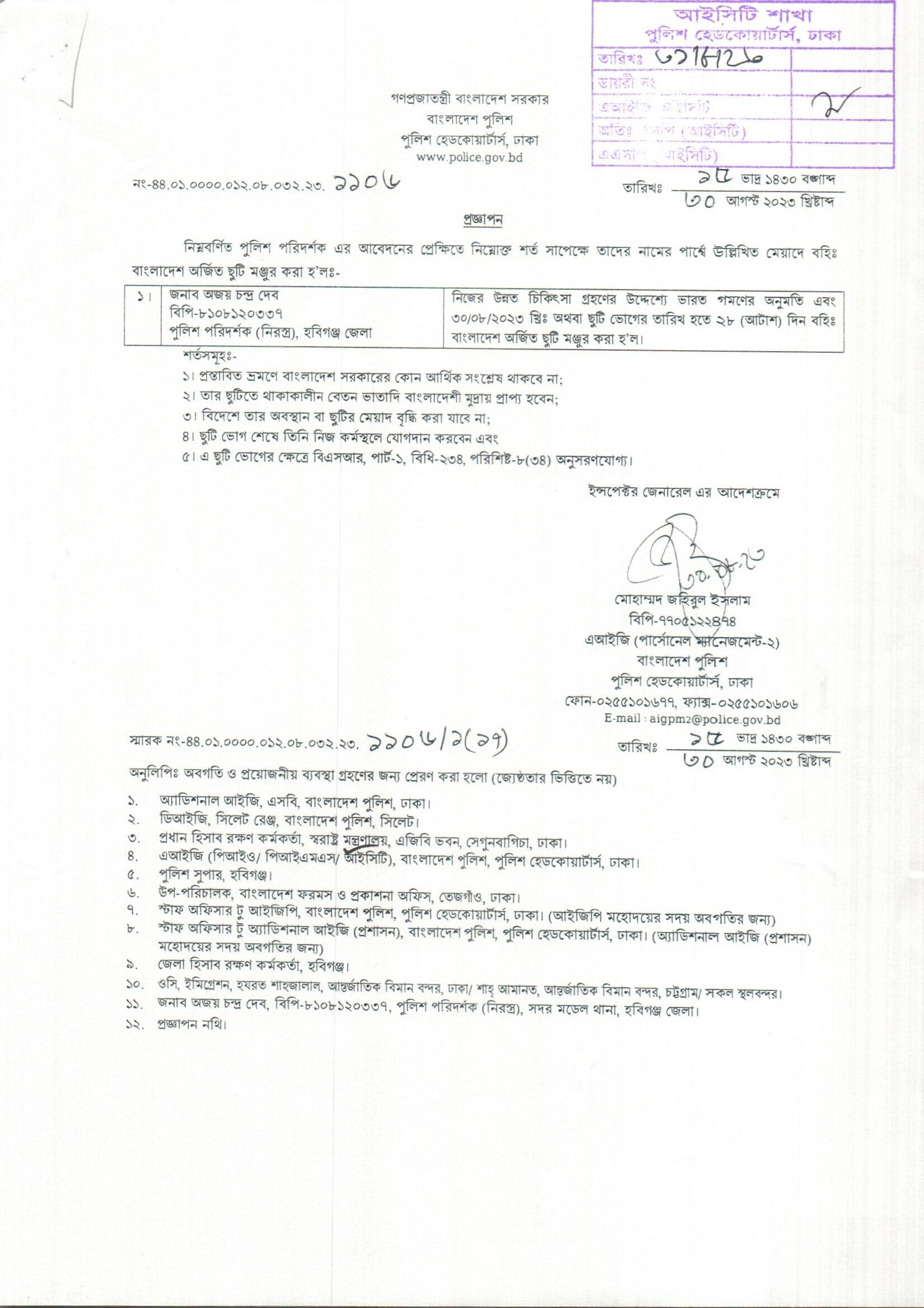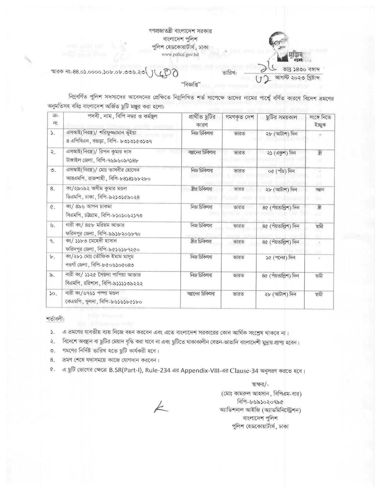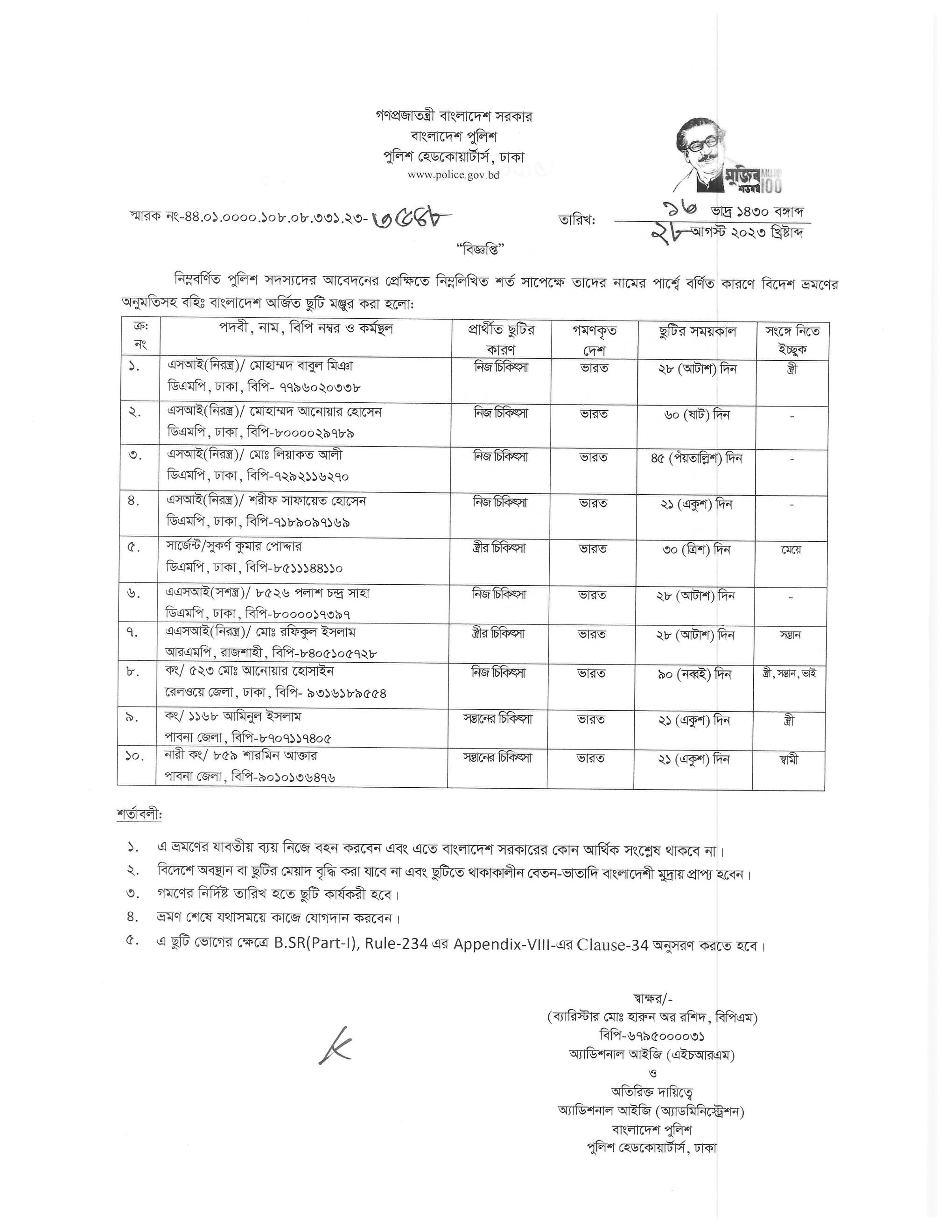 বহিঃ বাংলাদেশ ছুটি, বিজ্ঞপ্তি নং-৩৫২৫, তারিখঃ ২৪/০৮/২০২৩ খ্রিঃ।