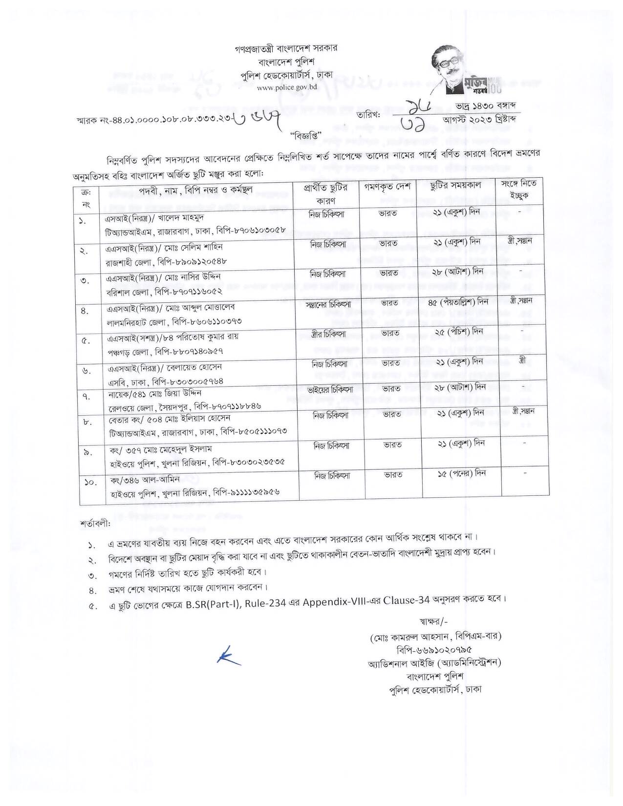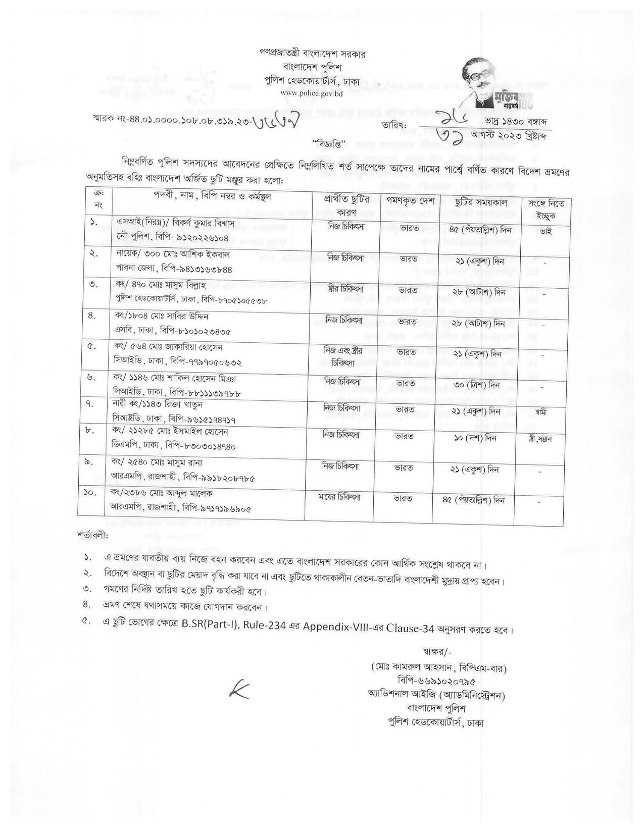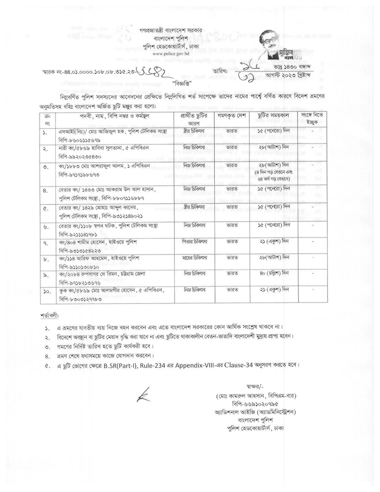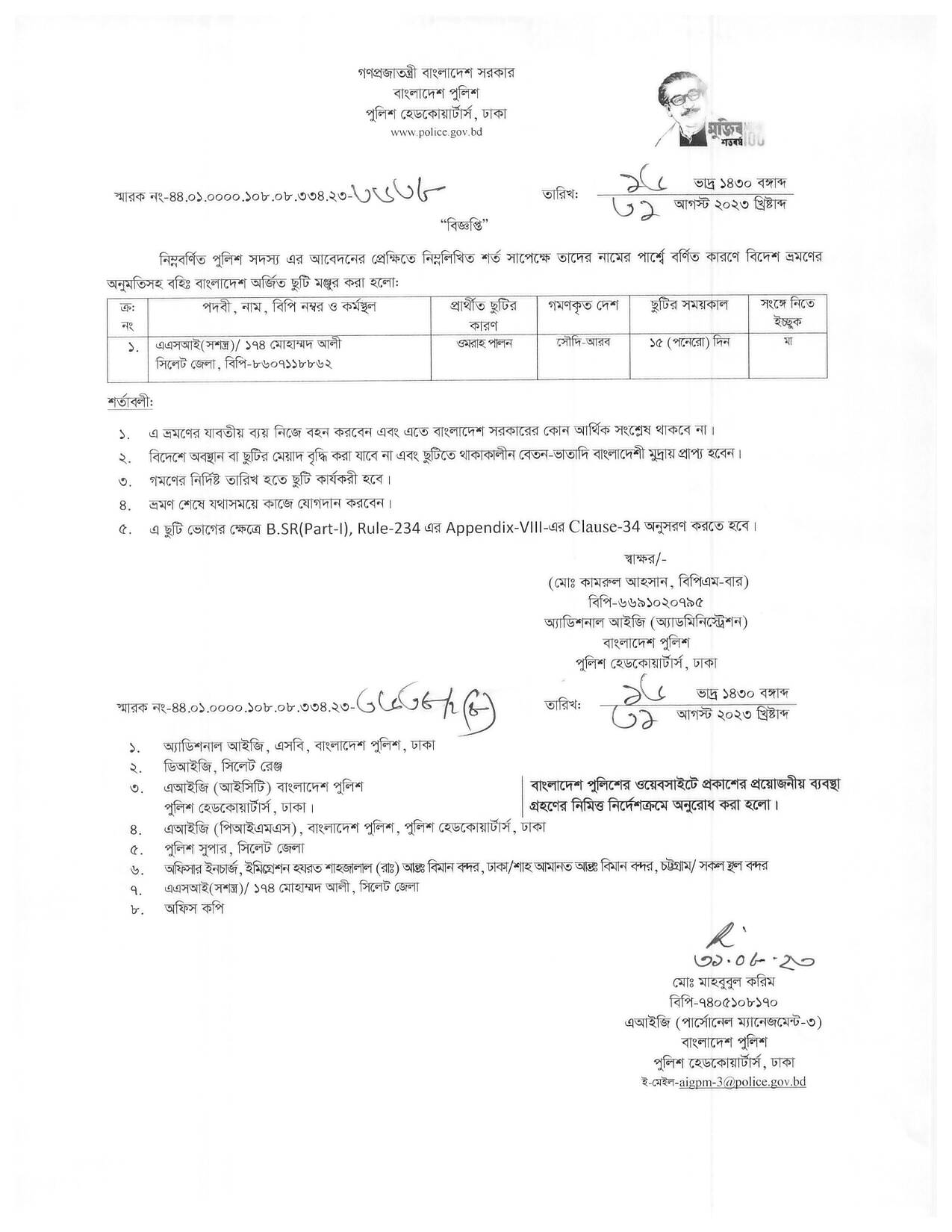 বহিঃ বাংলাদেশ ছুটি, বিজ্ঞপ্তি নং-৩৫২৫, তারিখঃ ২৪/০৮/২০২৩ খ্রিঃ।