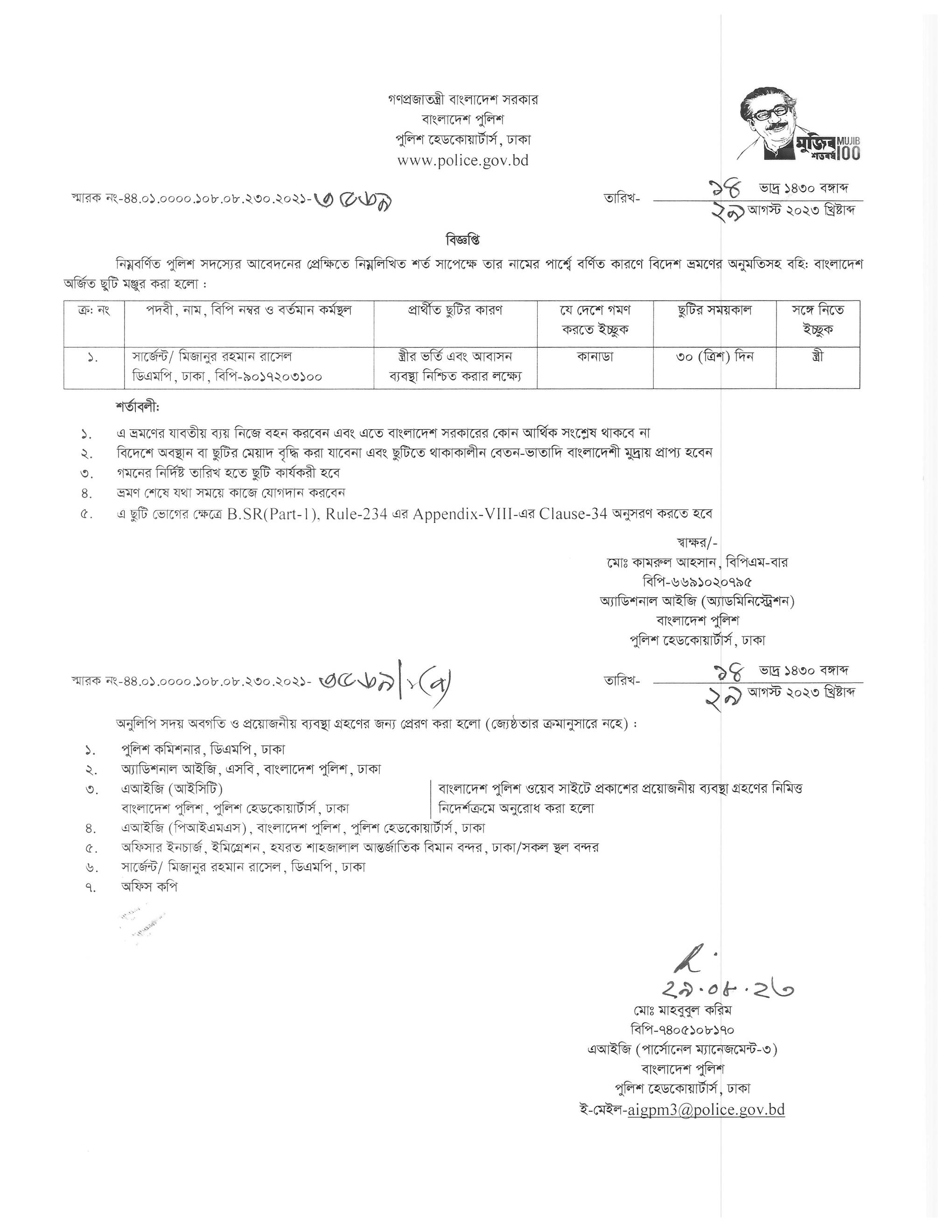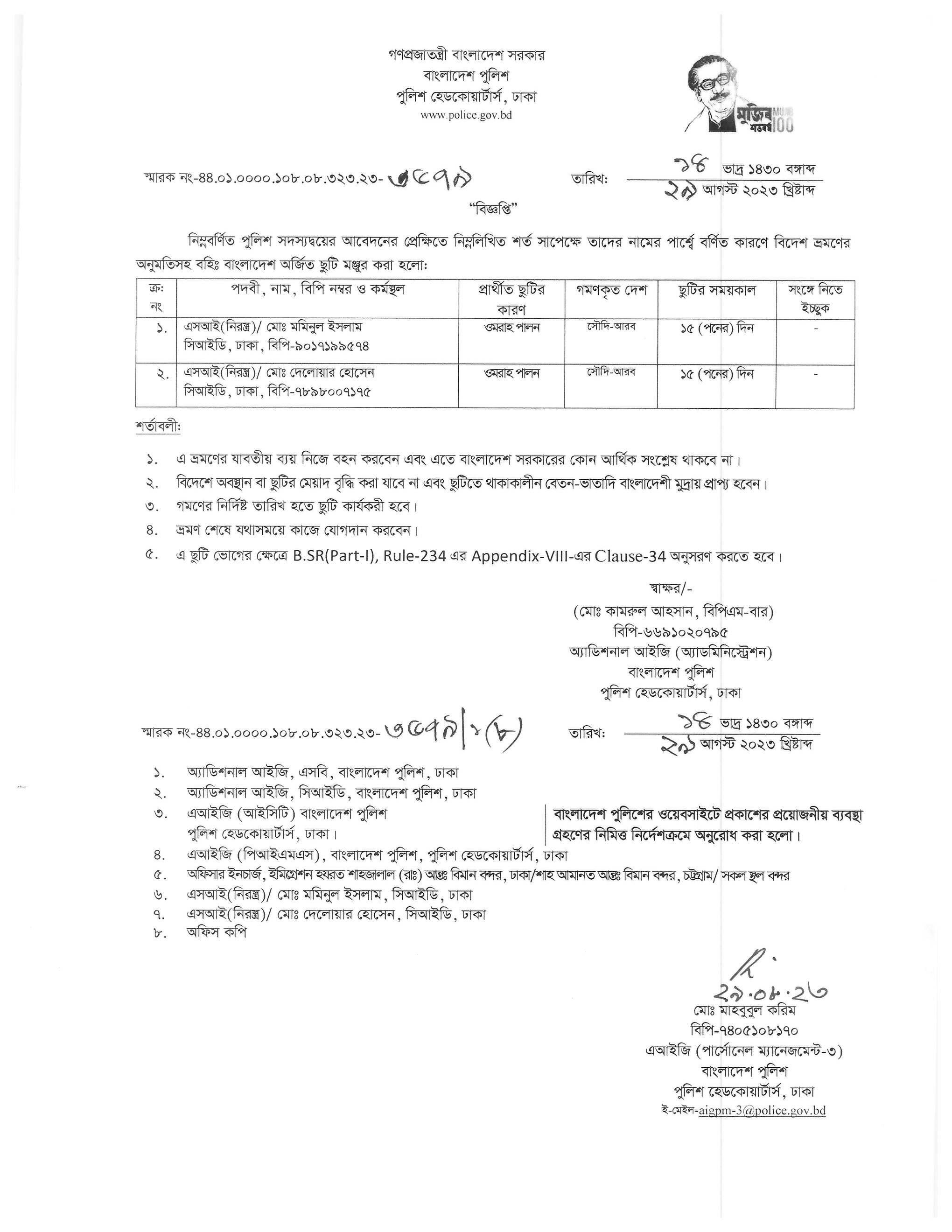 বহিঃ বাংলাদেশ ছুটি, বিজ্ঞপ্তি নং-৩৫৪৭, তারিখঃ ২৮/০৮/২০২৩ খ্রিঃ।