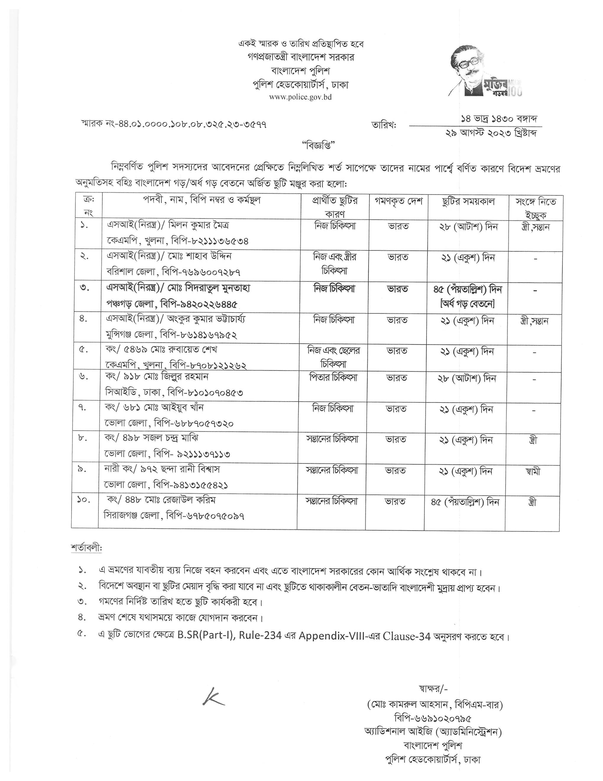 বহিঃ বাংলাদেশ ছুটি, বিজ্ঞপ্তি নং-৩৫৭৭, তারিখঃ ২৯/০৮/২০২৩ খ্রিঃ।