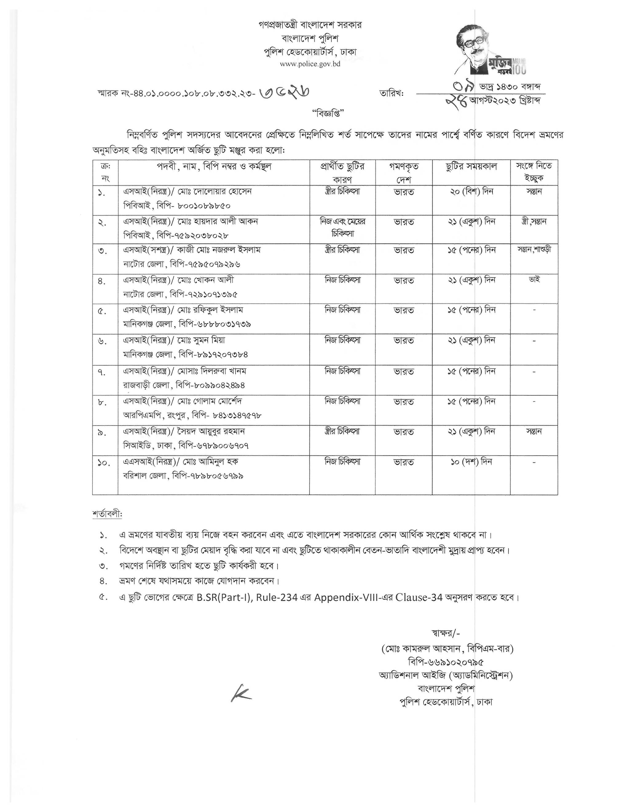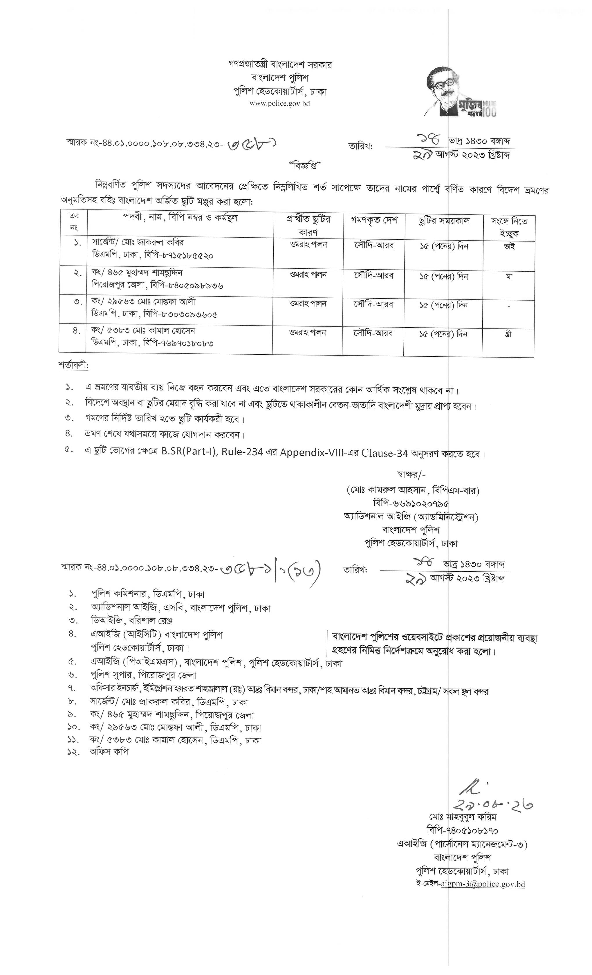বহিঃ বাংলাদেশ ছুটি, বিজ্ঞপ্তি নং-৩৫২৬, তারিখঃ ২৪/০৮/২০২৩ খ্রিঃ।