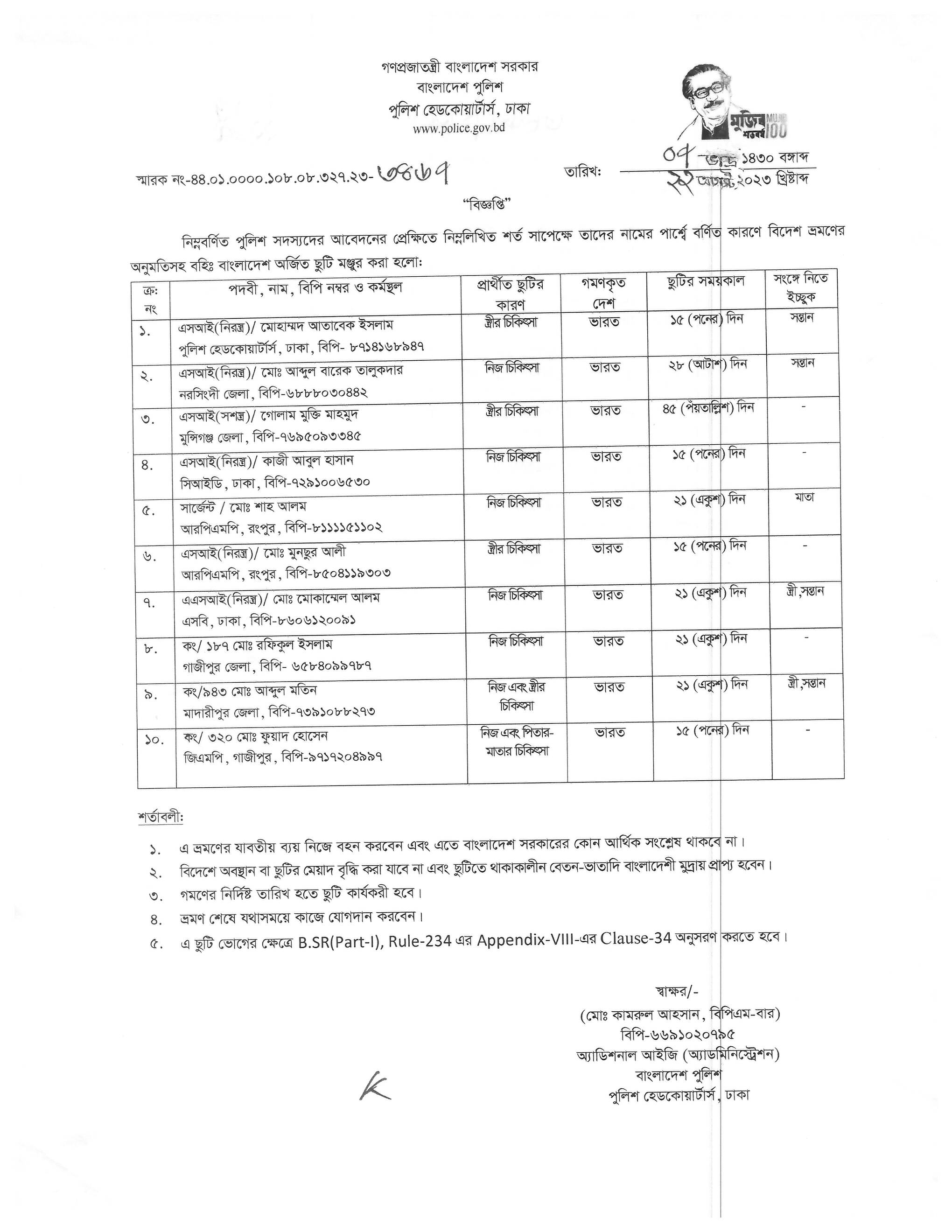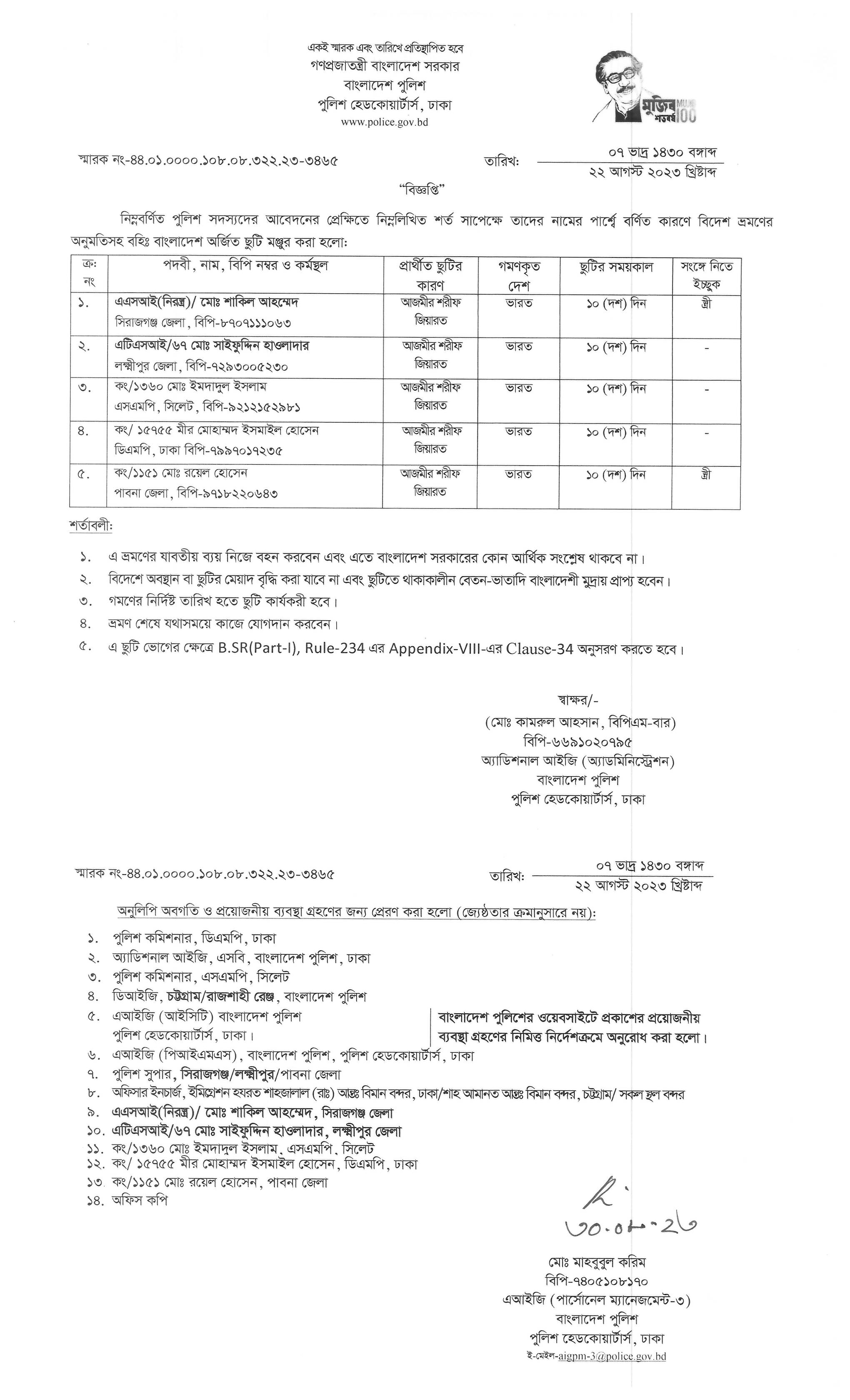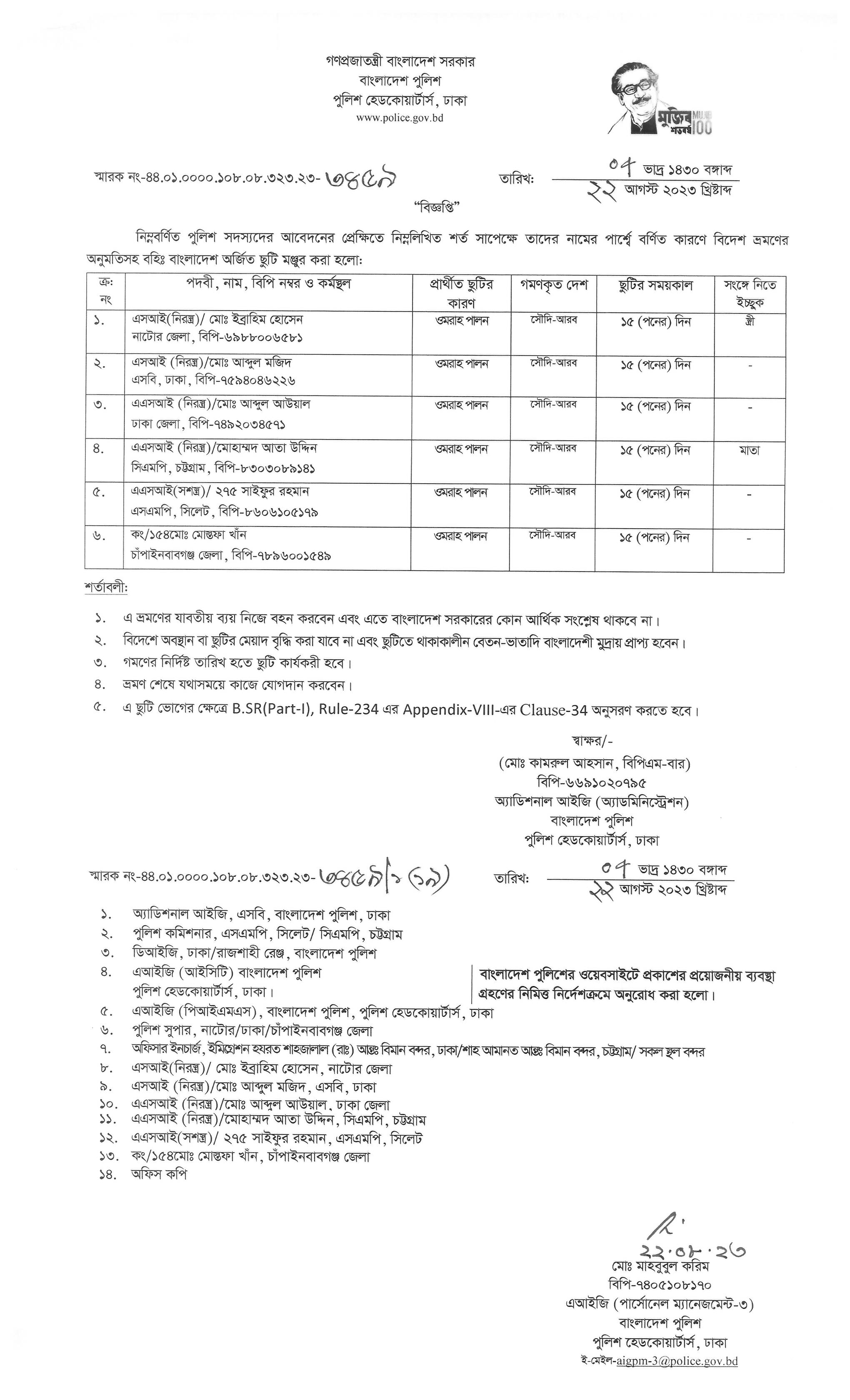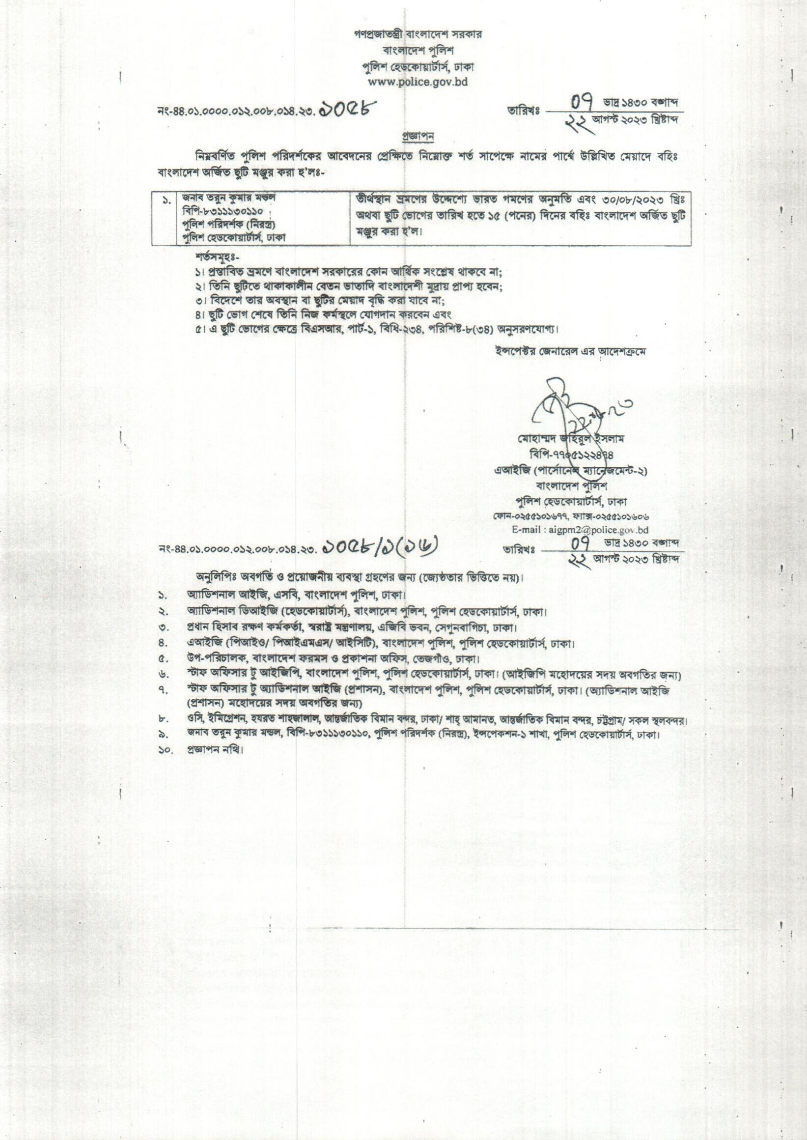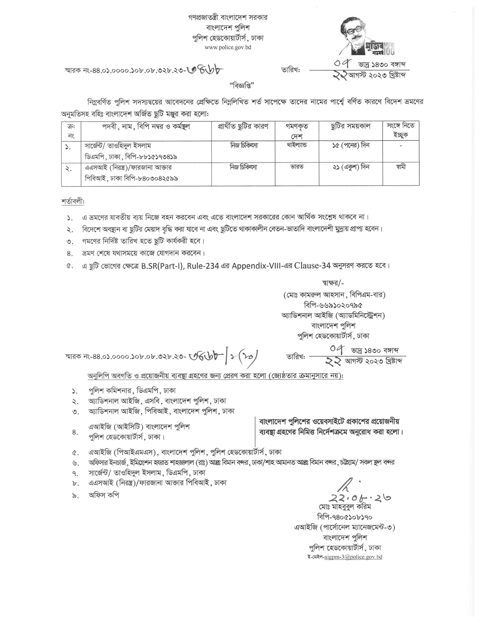 বহিঃ বাংলাদেশ ছুটি, বিজ্ঞপ্তি নং-৩৪৬৫, তারিখঃ ২২/০৮/২০২৩ খ্রিঃ।
