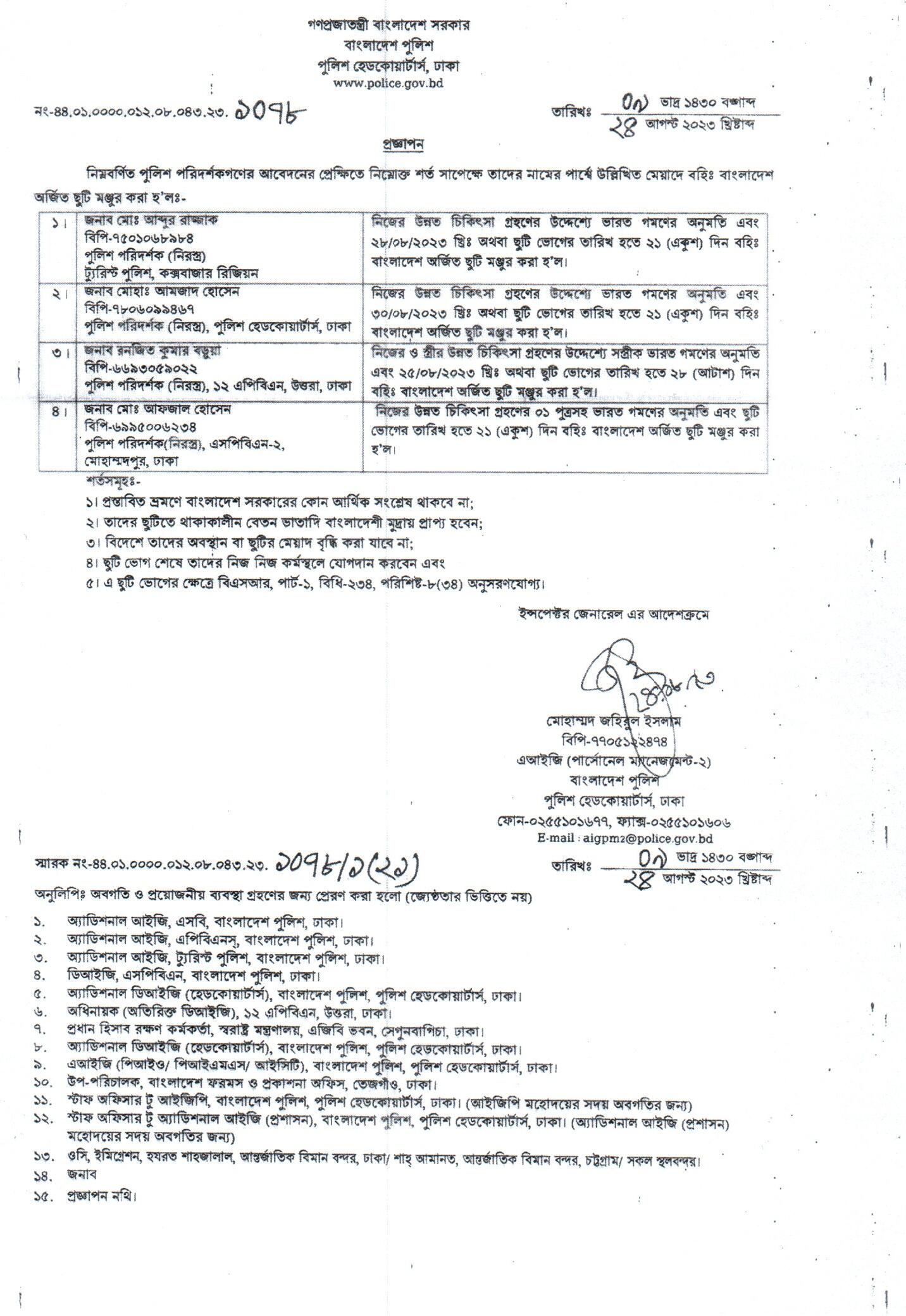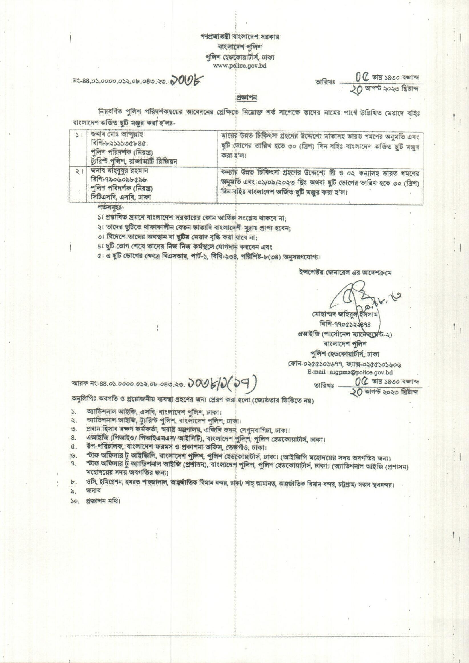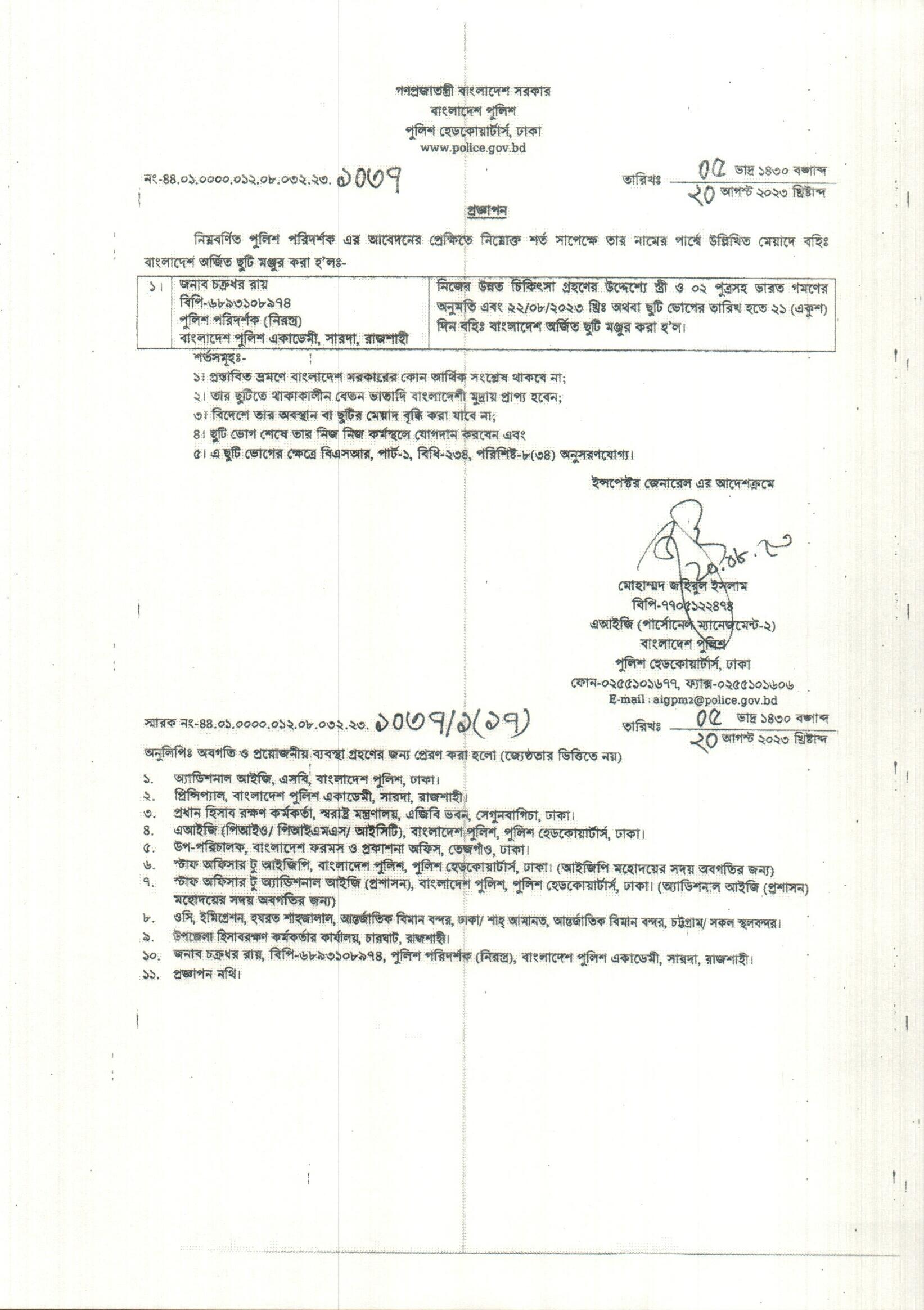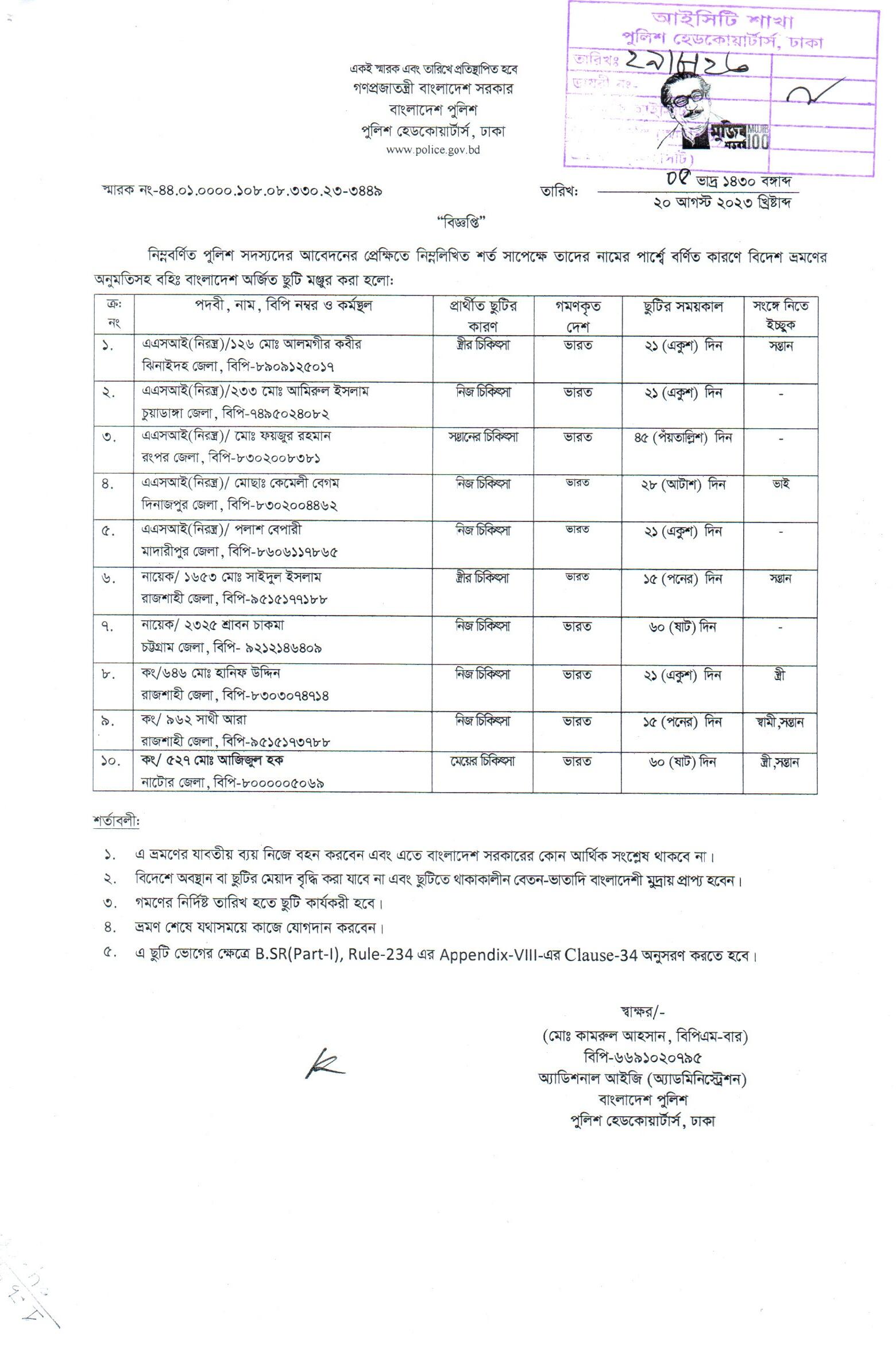 বহিঃ বাংলাদেশ ছুটি, বিজ্ঞপ্তি নং-৩৪৪৭, তারিখঃ ২০/০৮/২০২৩ খ্রিঃ।