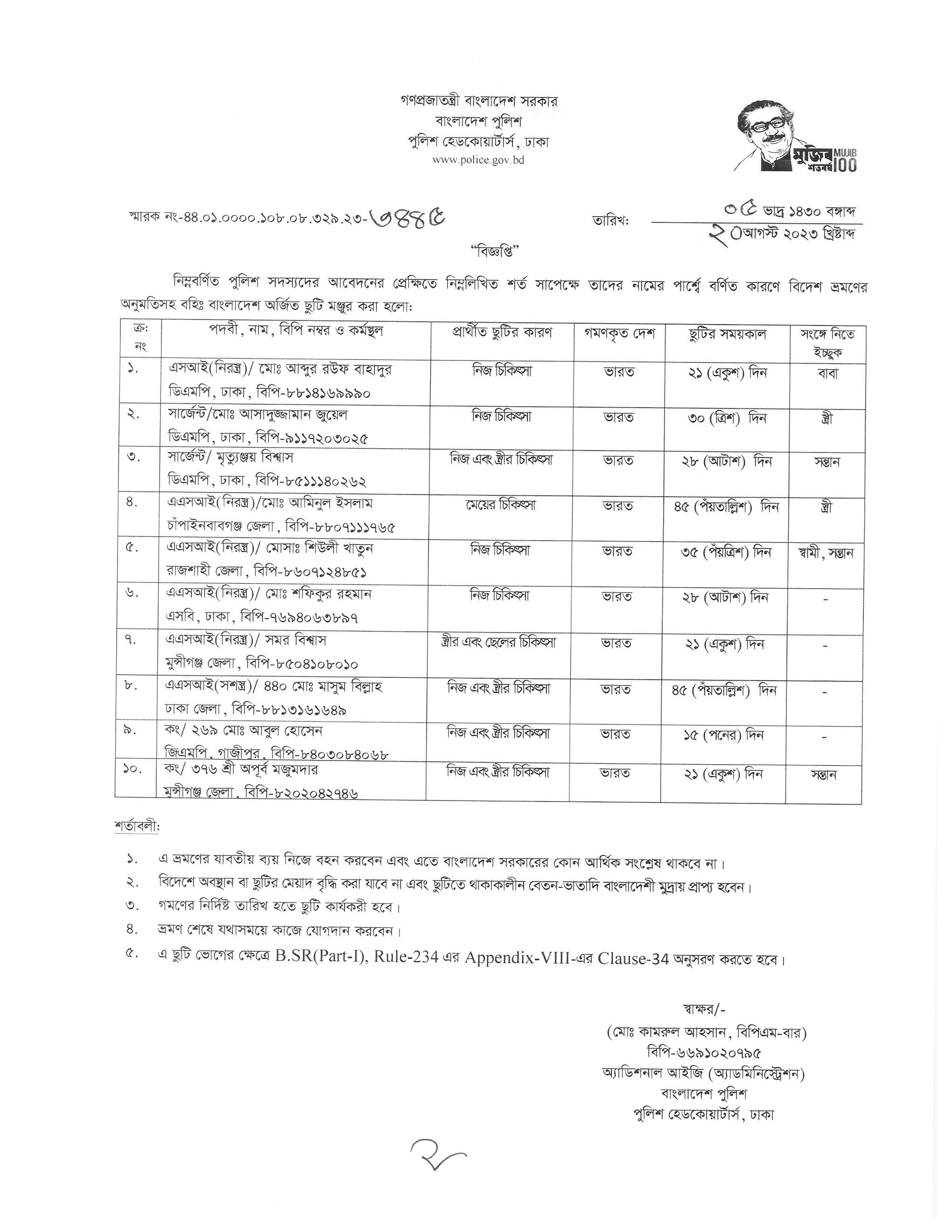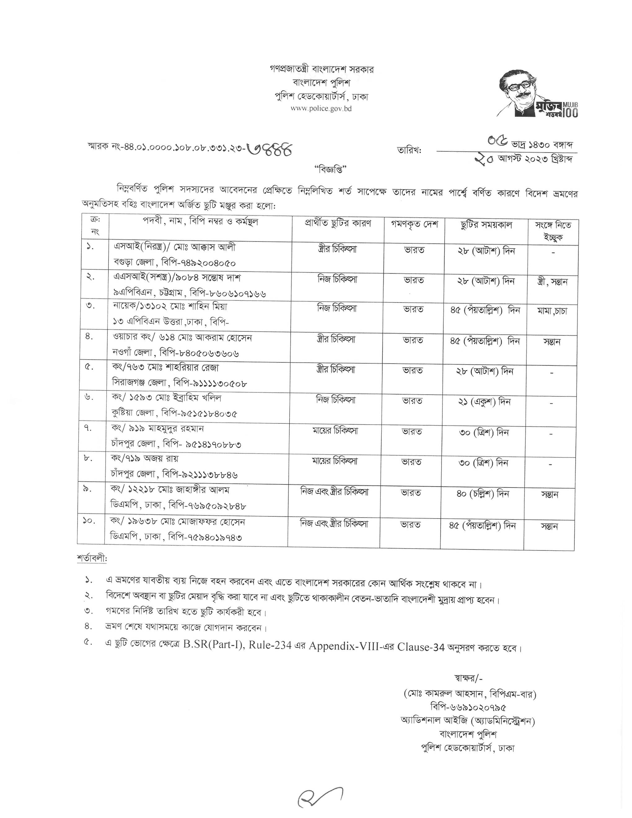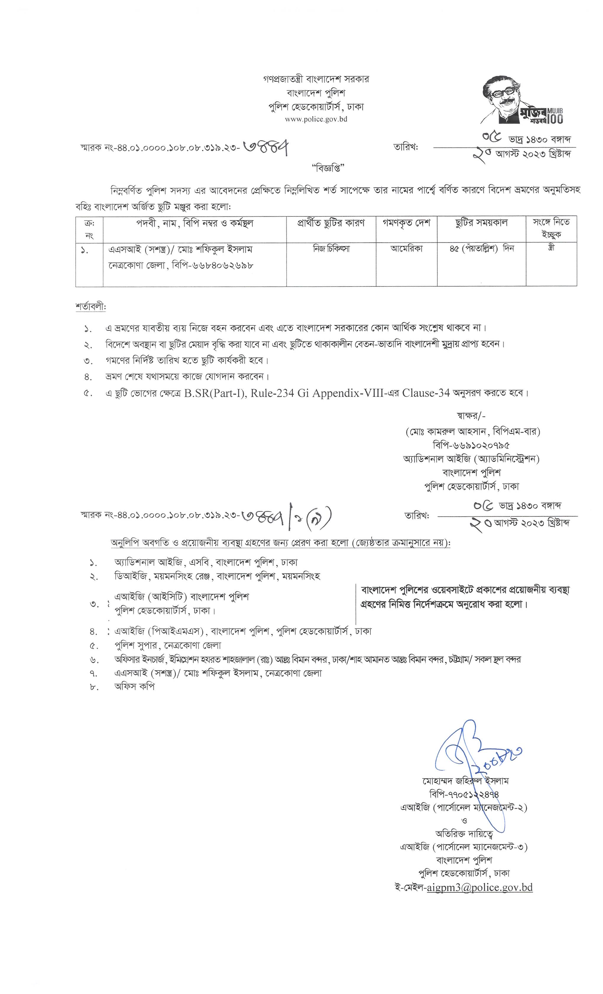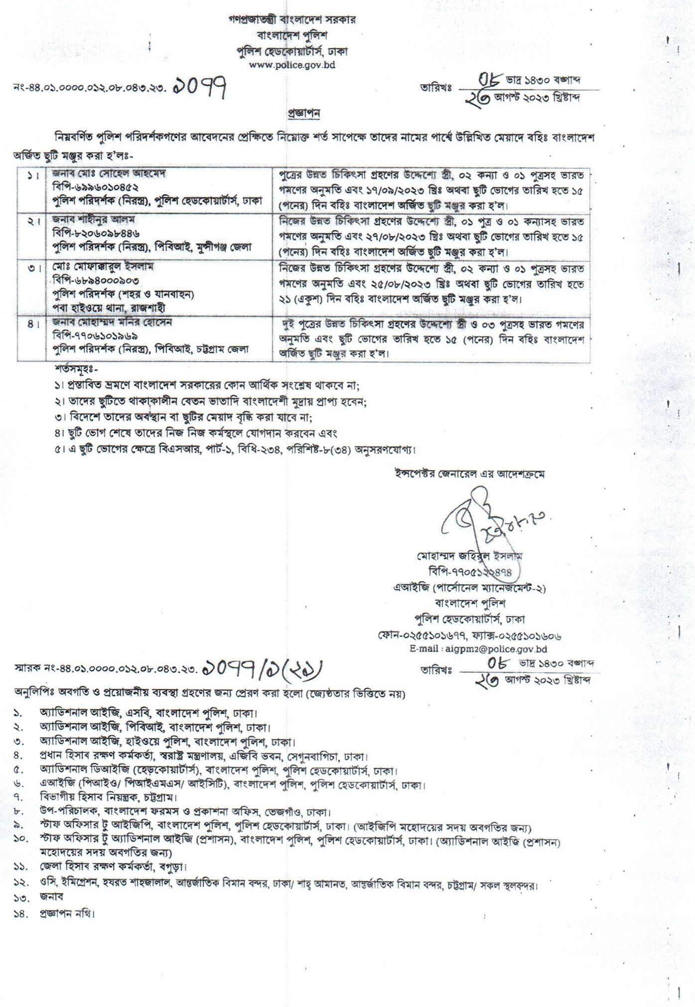 বহিঃ বাংলাদেশ ছুটি, বিজ্ঞপ্তি নং-৩৪৪৭, তারিখঃ ২০/০৮/২০২৩ খ্রিঃ।