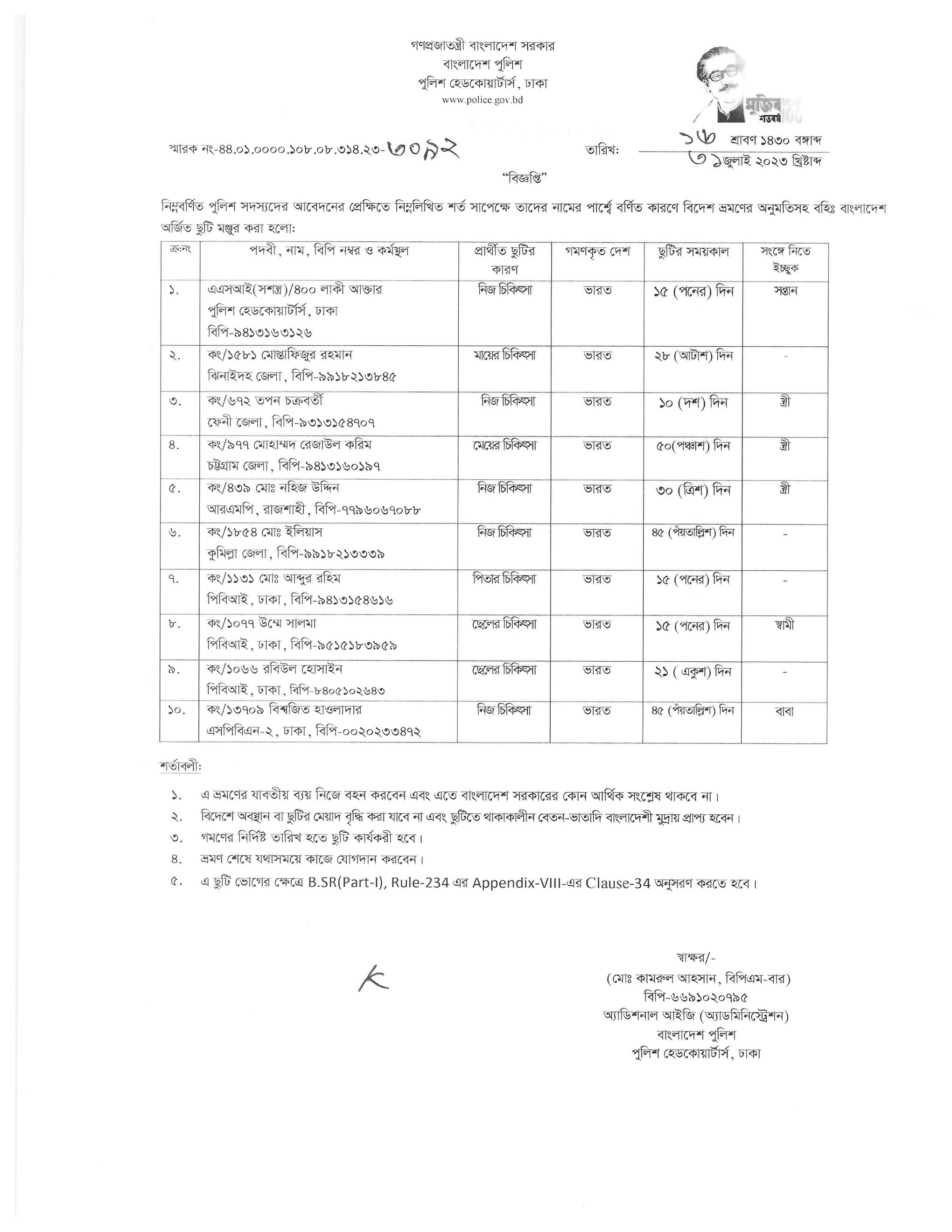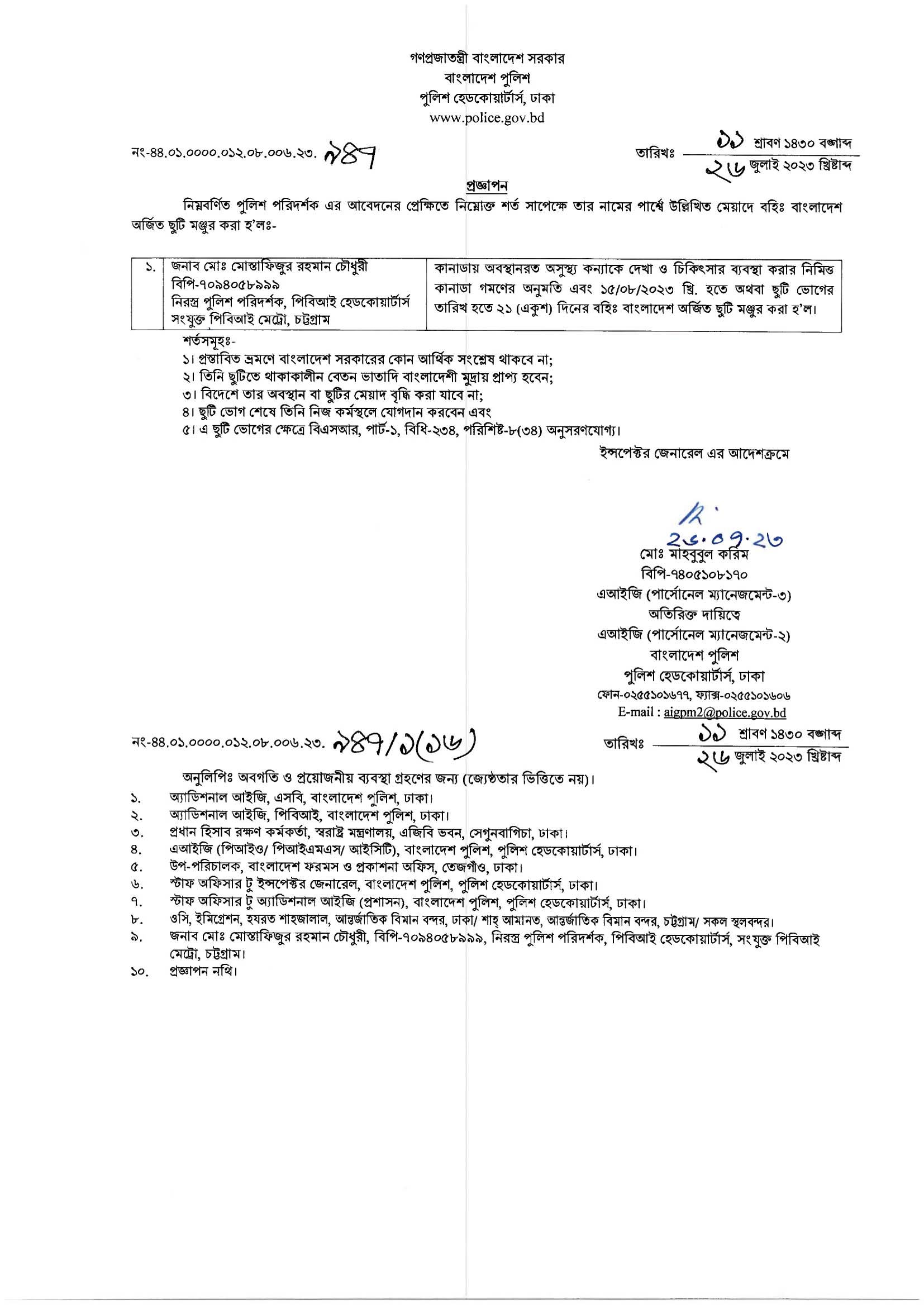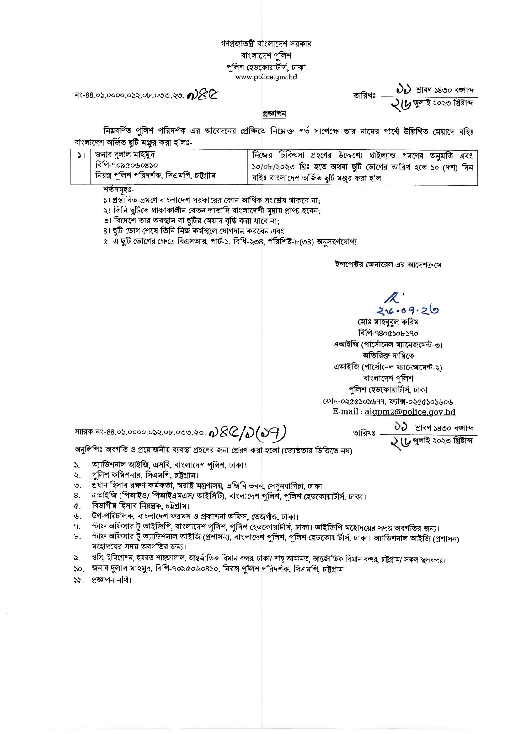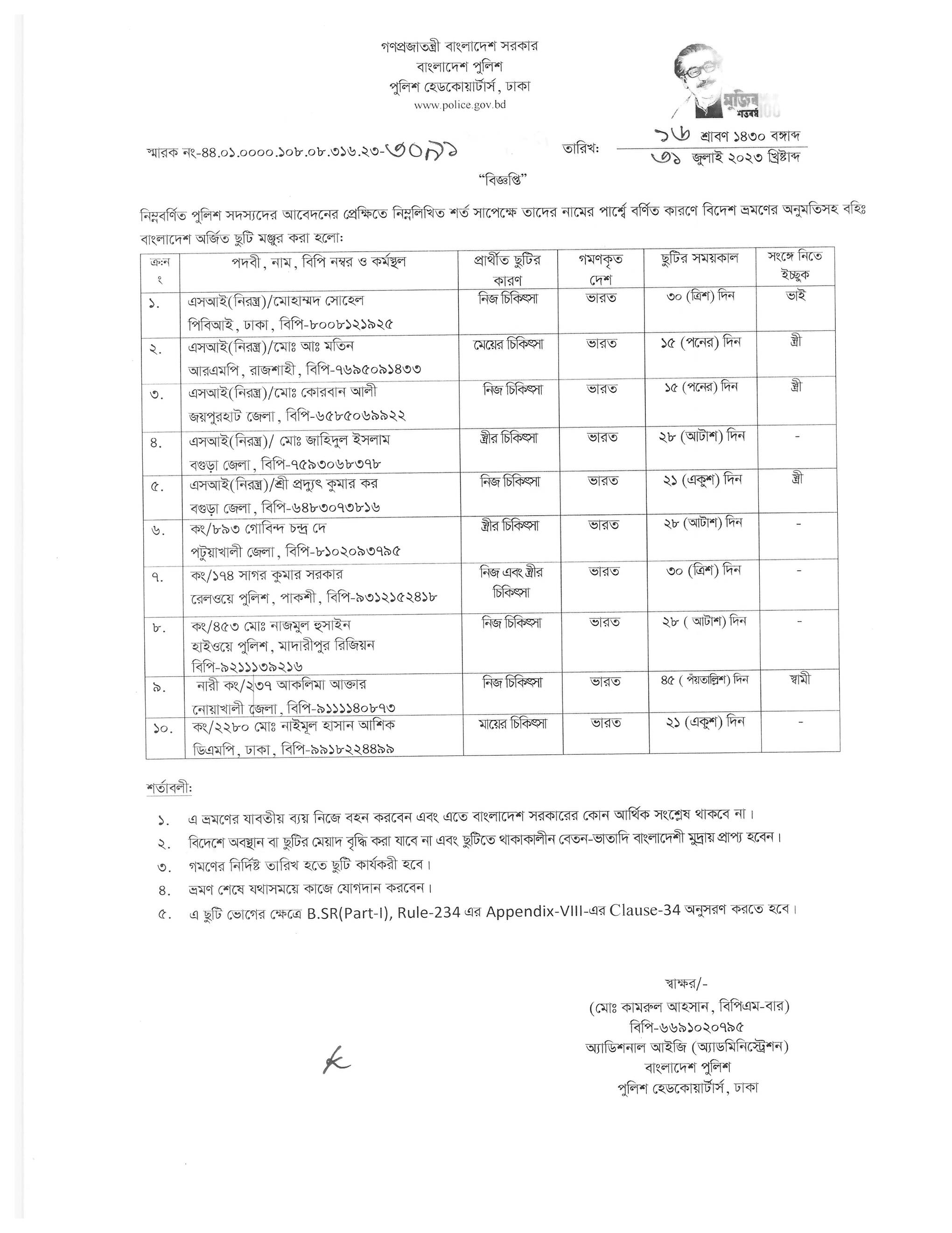 বহিঃ বাংলাদেশ ছুটি, বিজ্ঞপ্তি নং-৩০৮৯, তারিখঃ ৩১/০৭/২০২৩ খ্রিঃ।