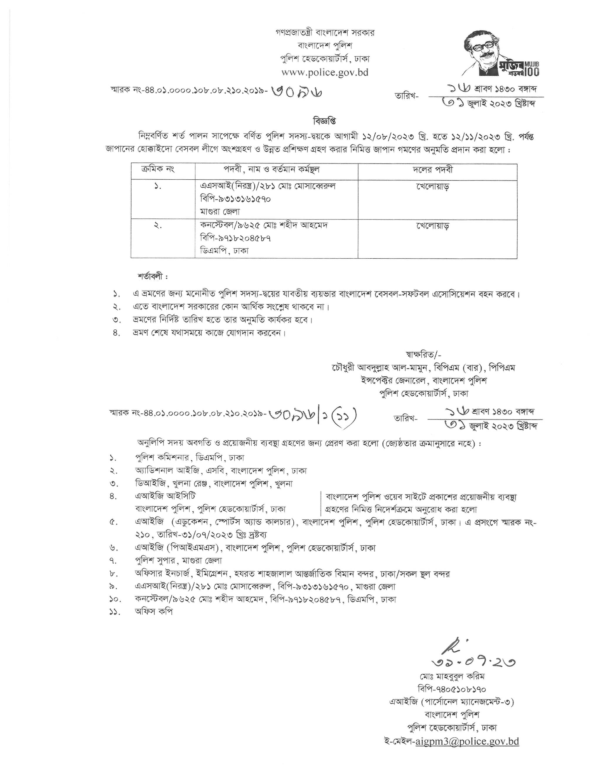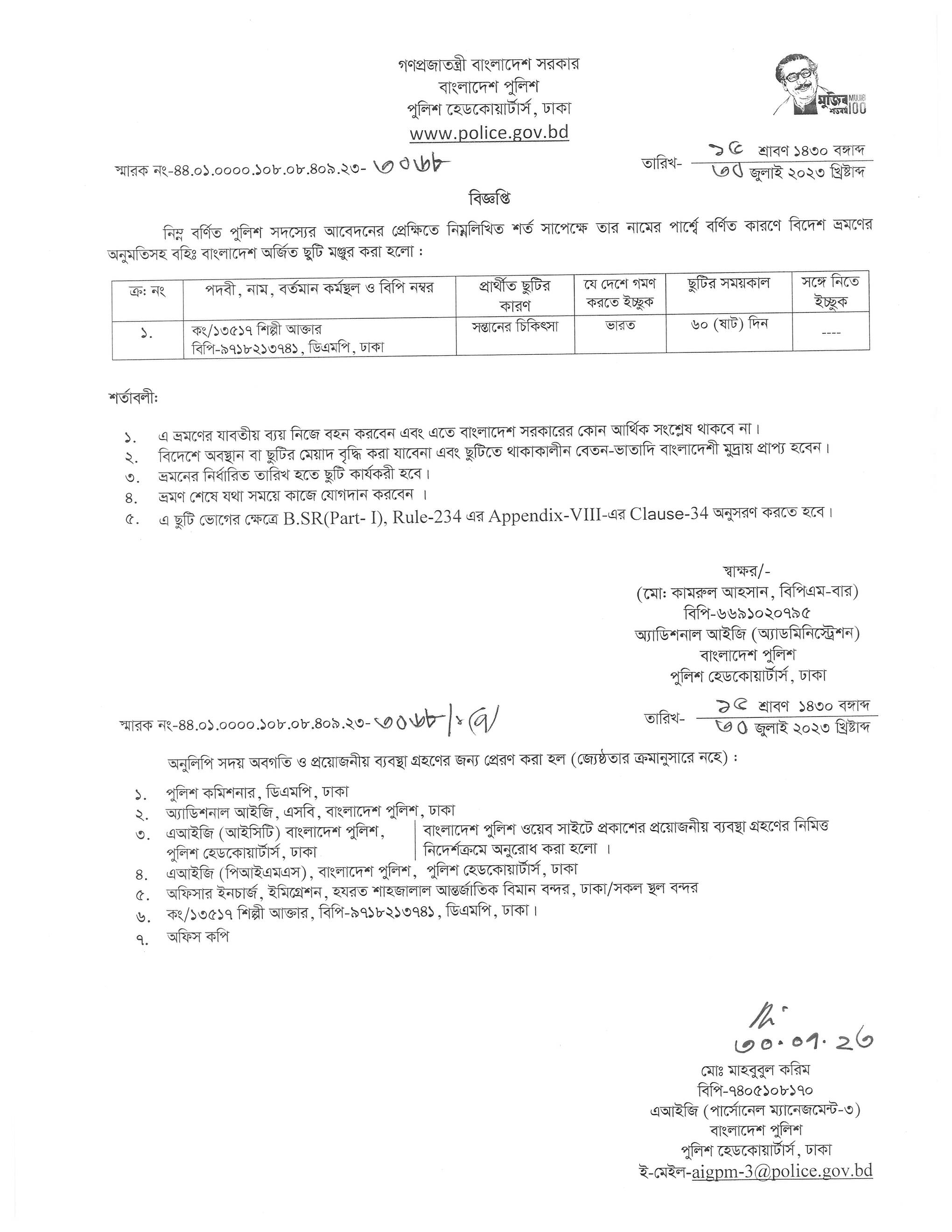 বহিঃ বাংলাদেশ ছুটি, বিজ্ঞপ্তি নং-৩০৮৬, তারিখঃ ৩১/০৭/২০২৩ খ্রিঃ।