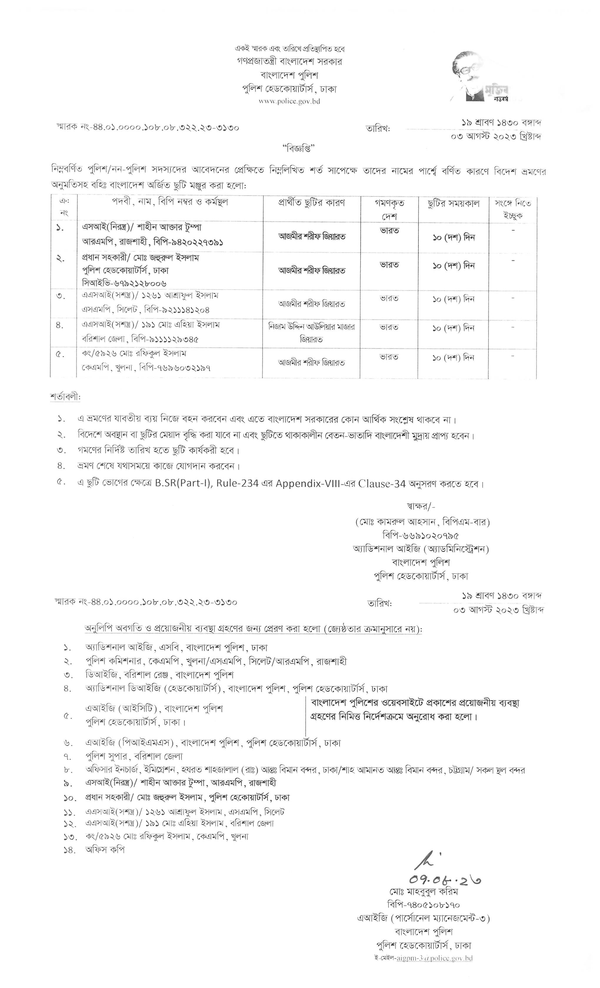 বহিঃ বাংলাদেশ ছুটি, বিজ্ঞপ্তি নং-৩১৩১, তারিখঃ ০৩/০৮/২০২৩ খ্রিঃ।