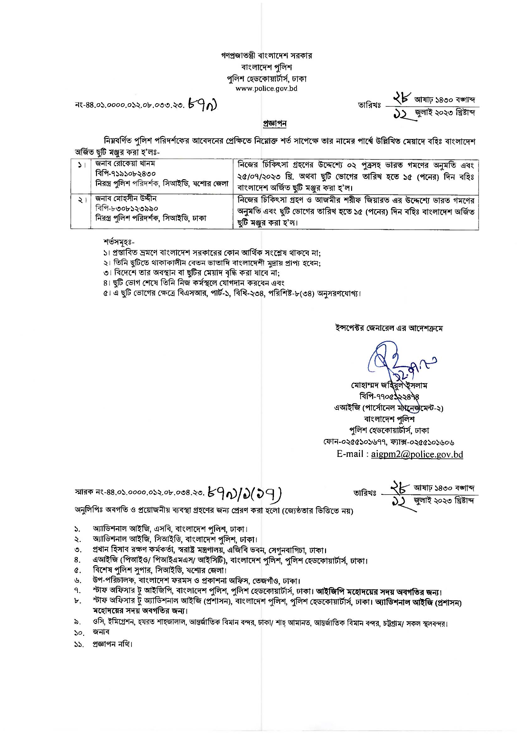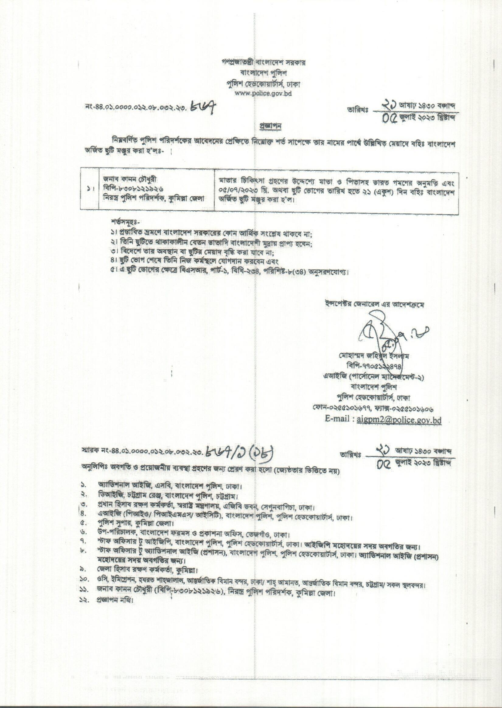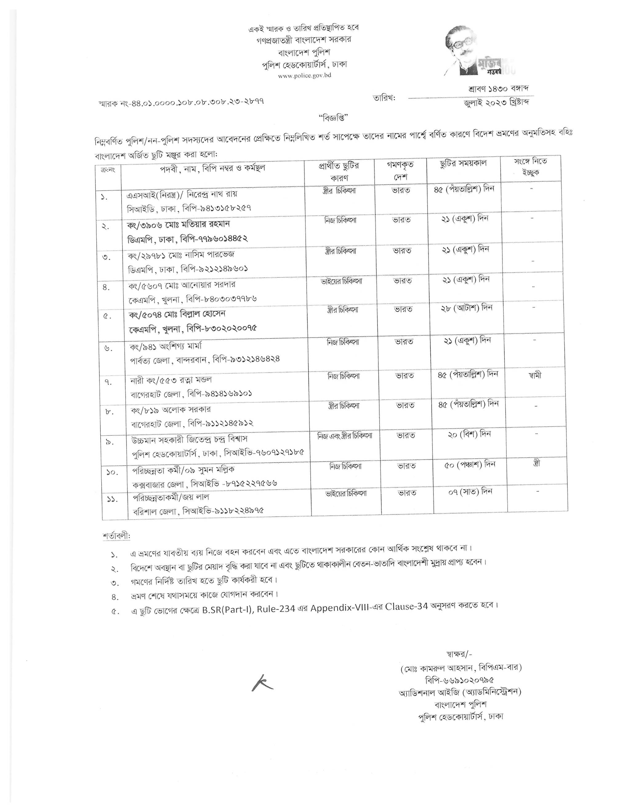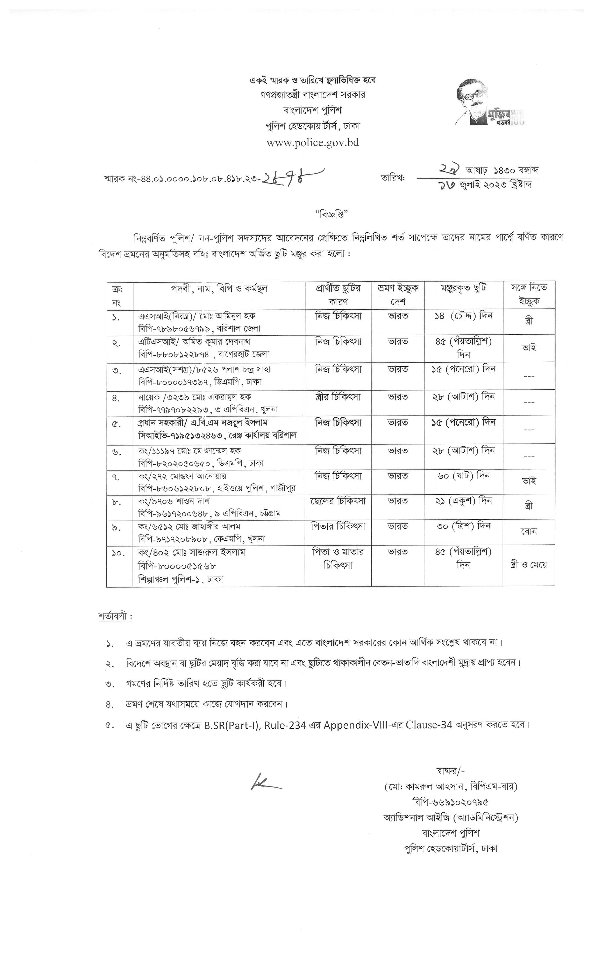 বহিঃ বাংলাদেশ ছুটি, বিজ্ঞপ্তি নং-২৮০৯, তারিখঃ ১১/০৭/২০২৩ খ্রিঃ।