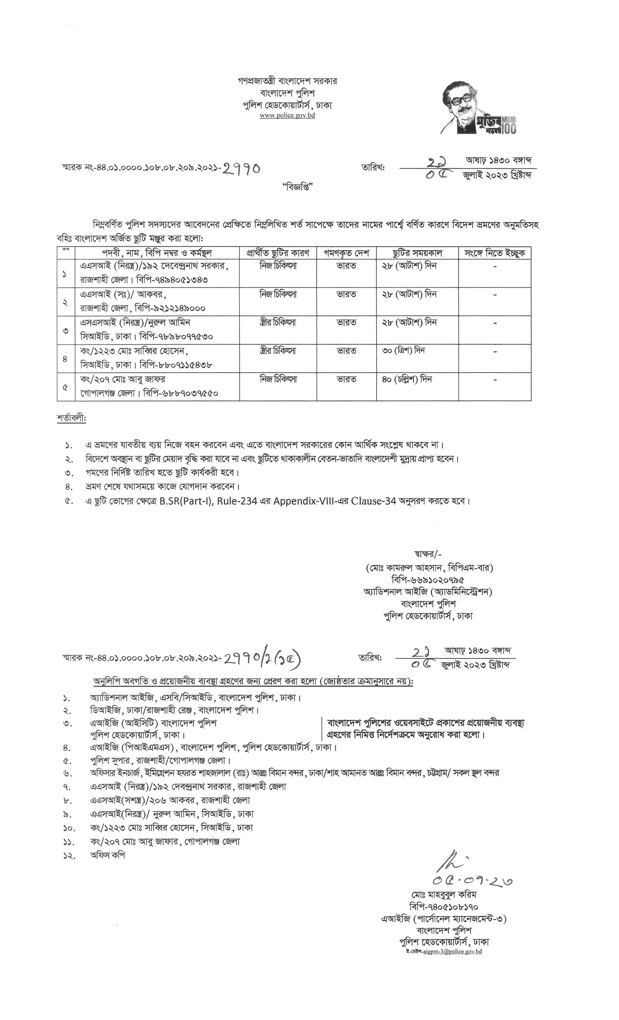 বহিঃ বাংলাদেশ ছুটি, বিজ্ঞপ্তি নং-২৭৭০, তারিখঃ ০৫/০৭/২০২৩ খ্রিঃ।