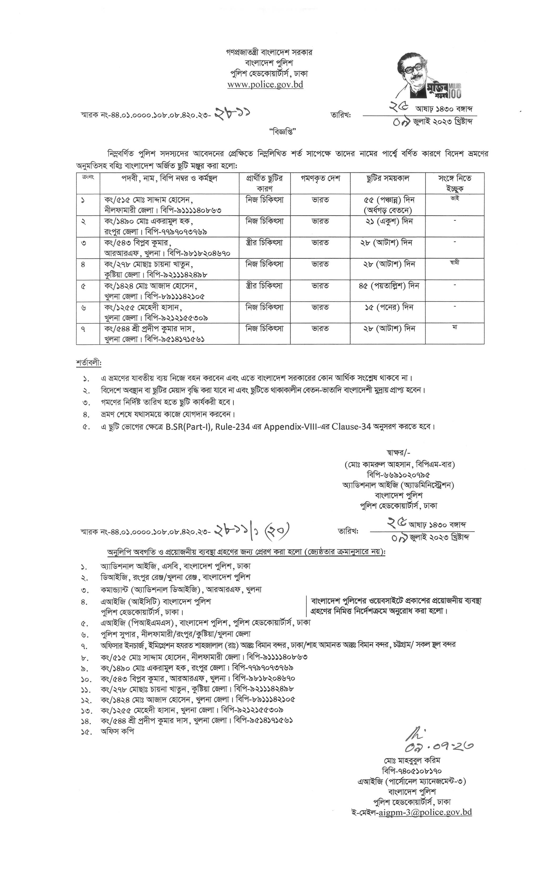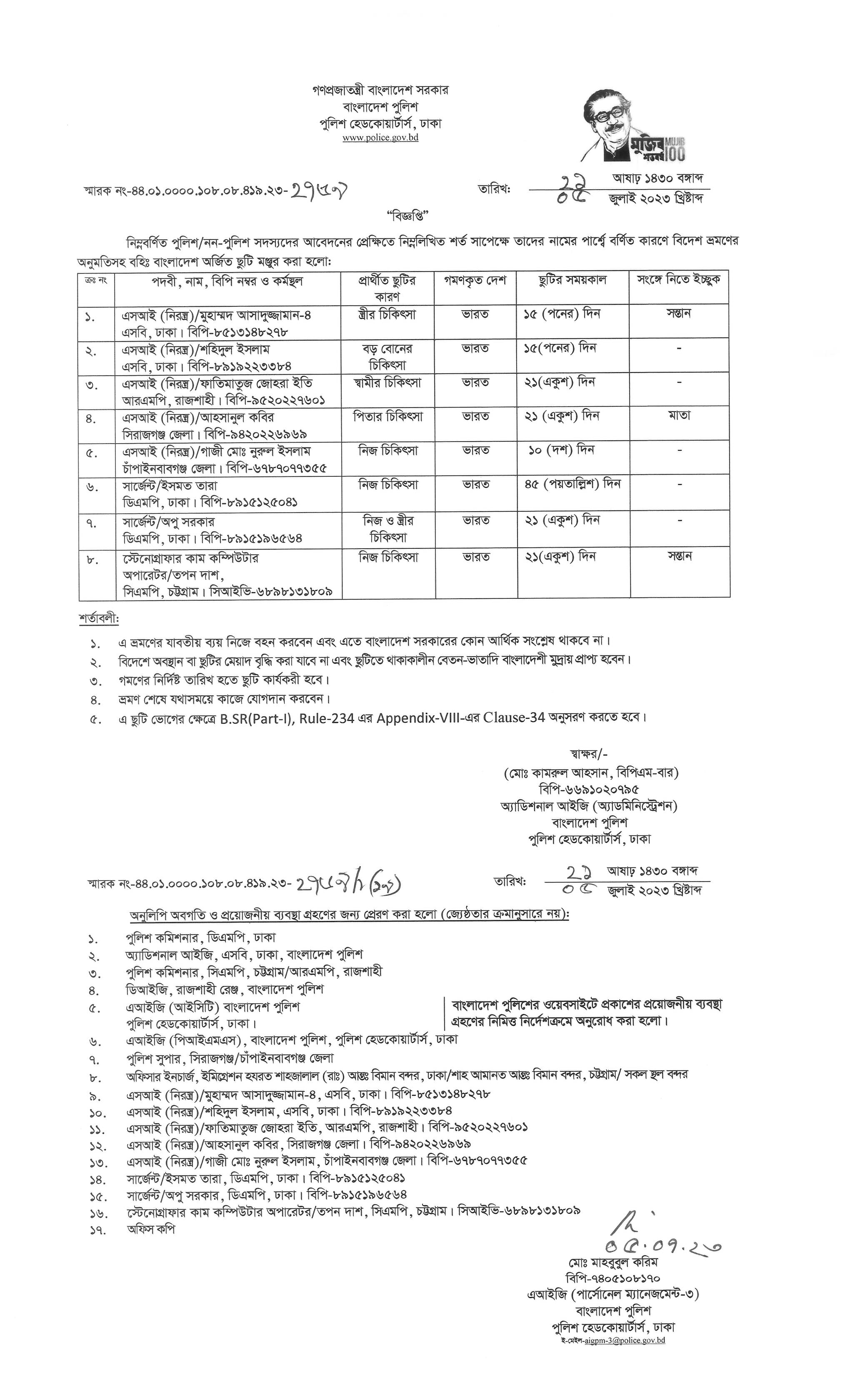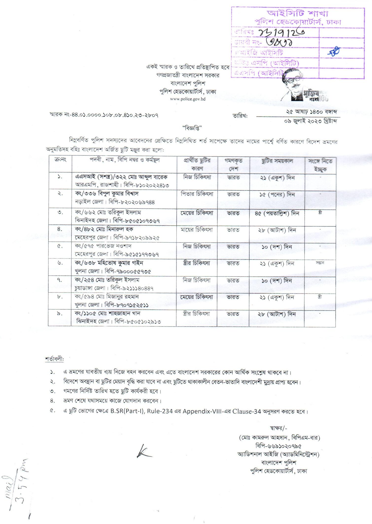 বহিঃ বাংলাদেশ ছুটি, বিজ্ঞপ্তি নং-২৮০৭, তারিখঃ ০৯/০৭/২০২৩ খ্রিঃ।