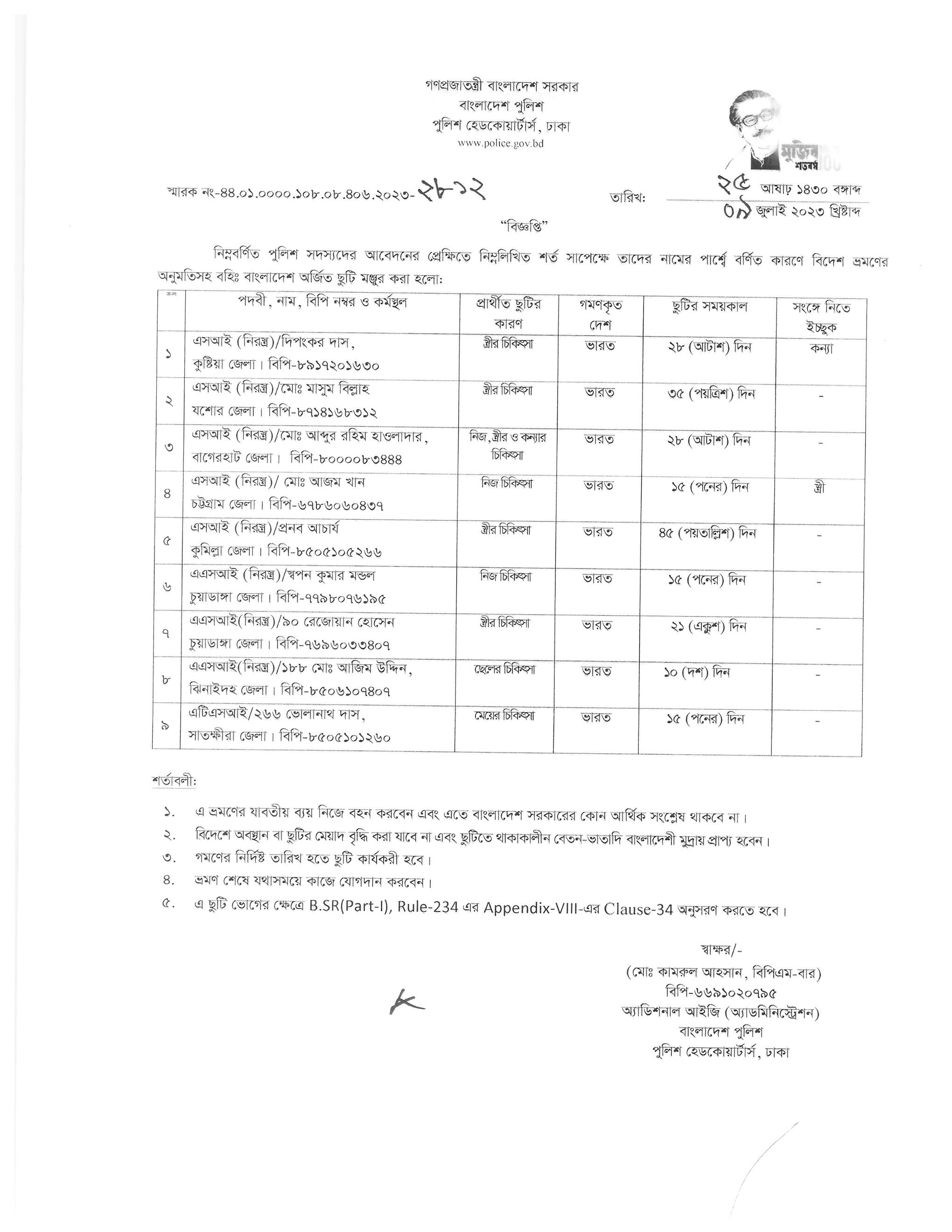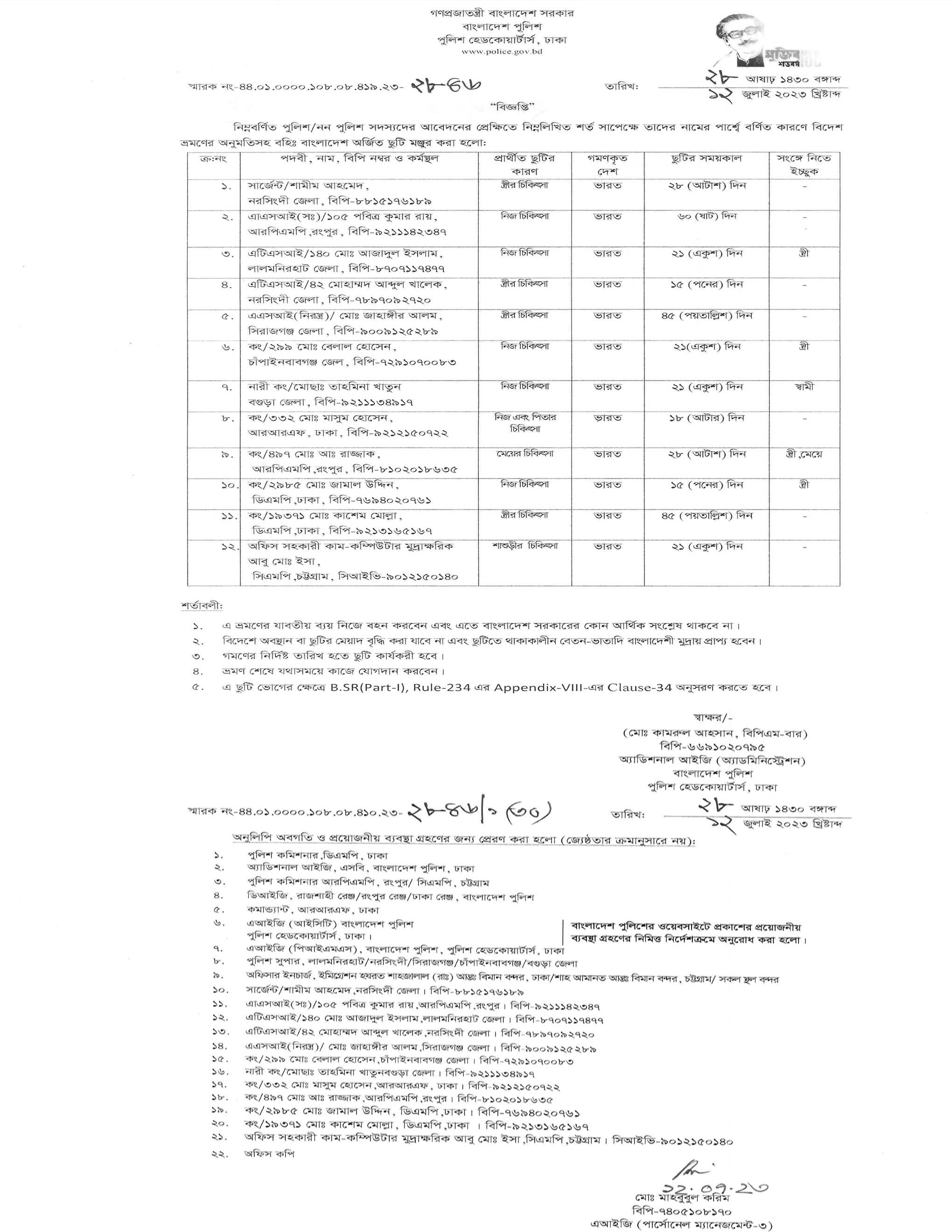 বহিঃ বাংলাদেশ ছুটি, বিজ্ঞপ্তি নং-২৮১২, তারিখঃ ০৯/০৭/২০২৩ খ্রিঃ।