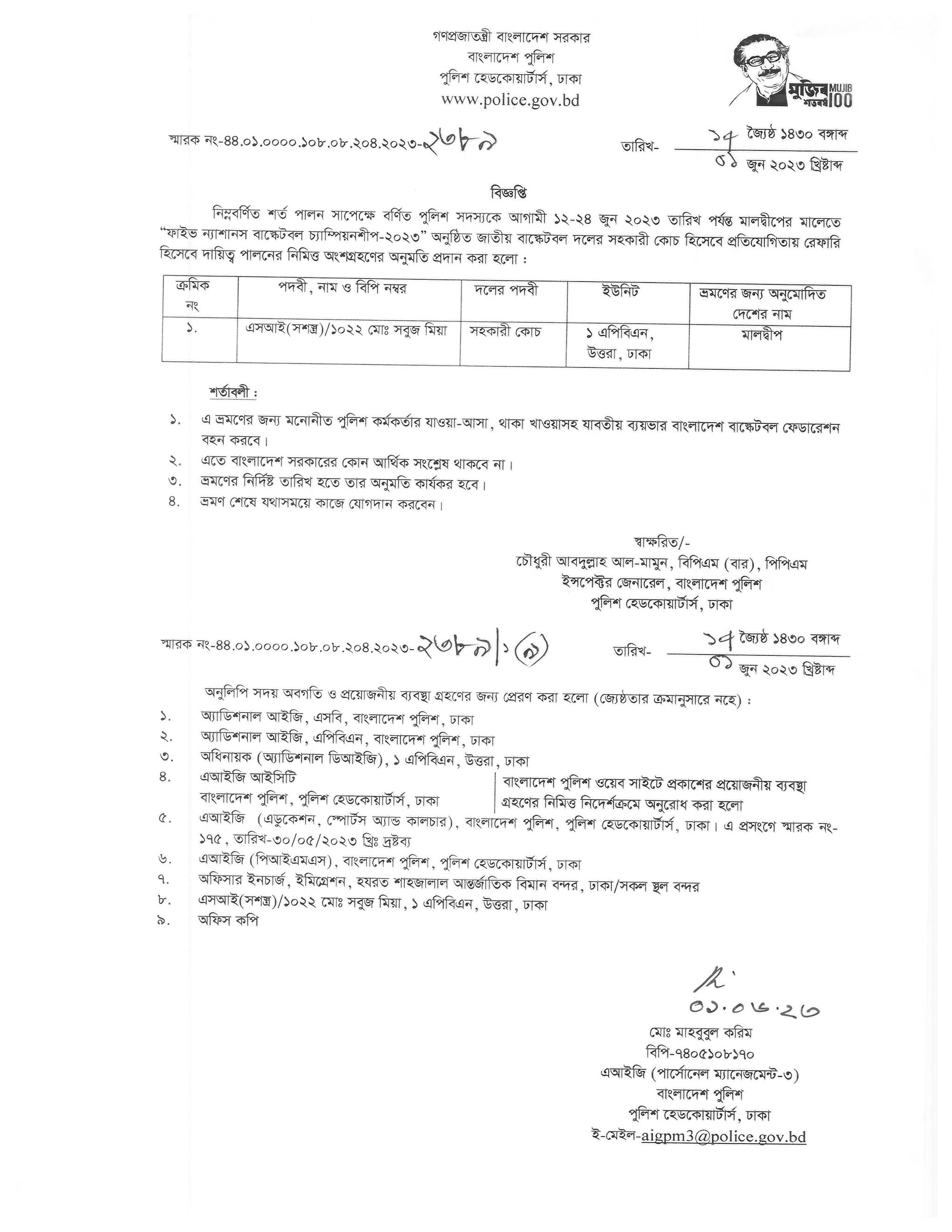 বহিঃ বাংলাদেশ ছুটি, বিজ্ঞপ্তি নং-২৩৭৫ , তারিখঃ ০১/০৬/২০২৩ খ্রিঃ।