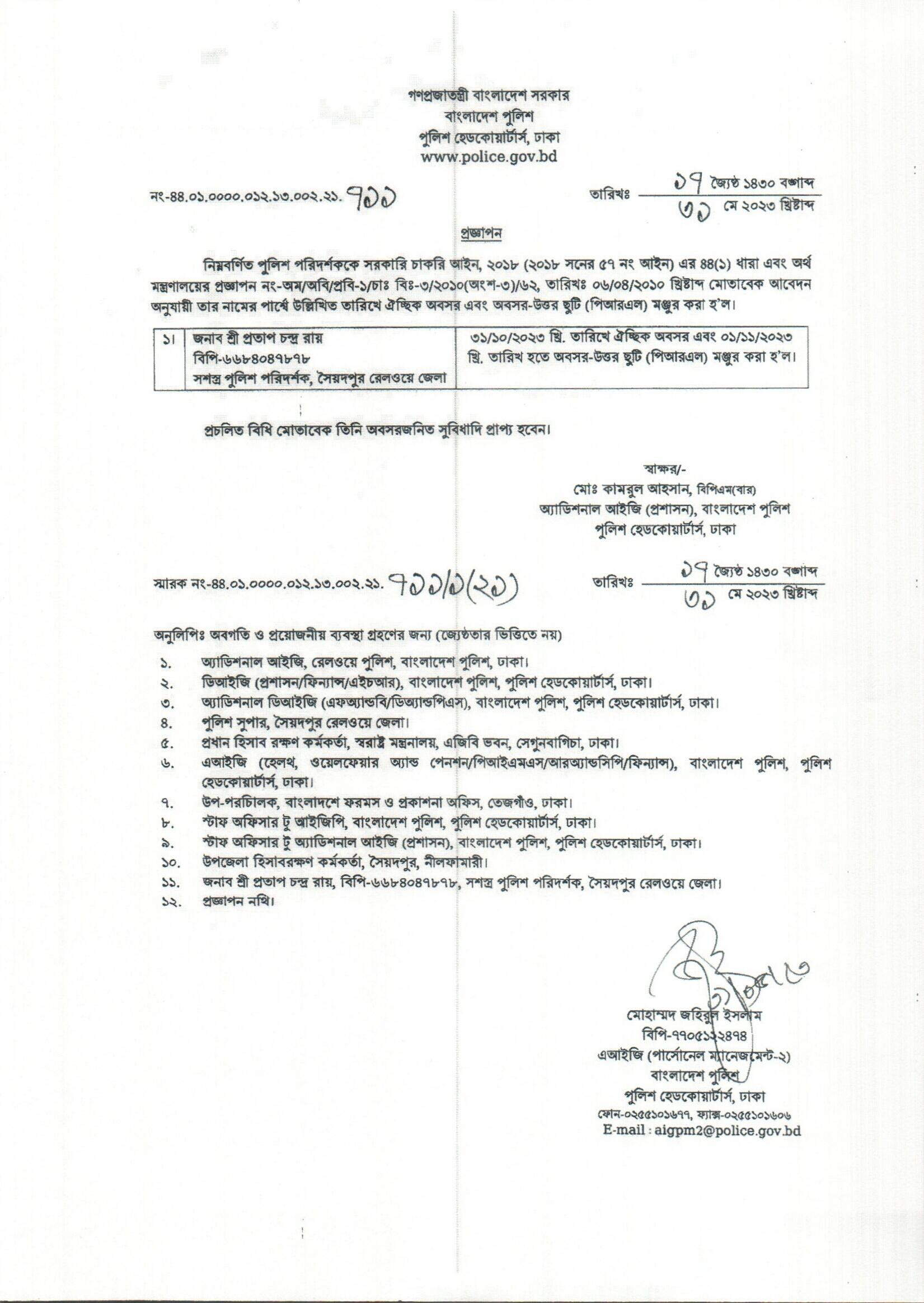 পিআরএল ছুটি, প্রজ্ঞাপন নং-৭১১, তারিখঃ ৩১/০৫/২০২৩ খ্রিঃ।