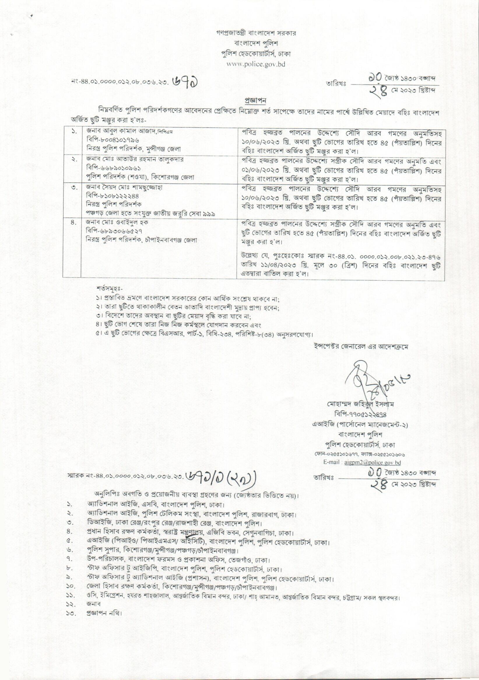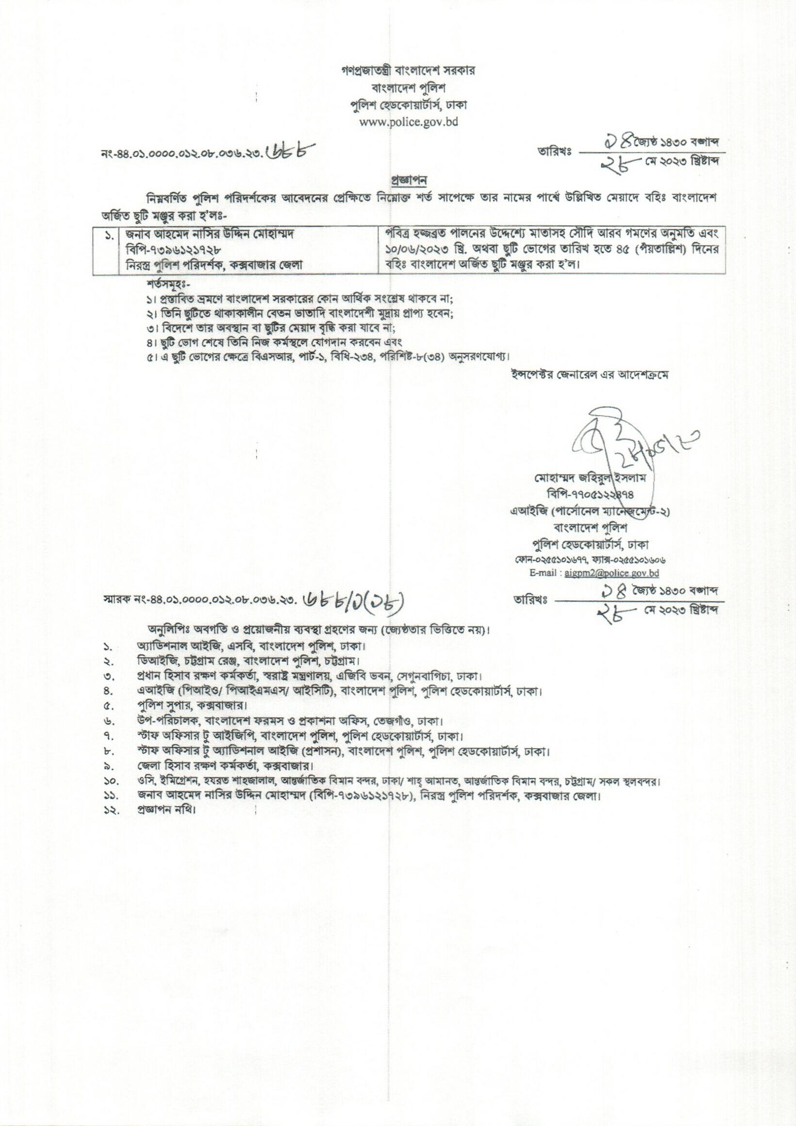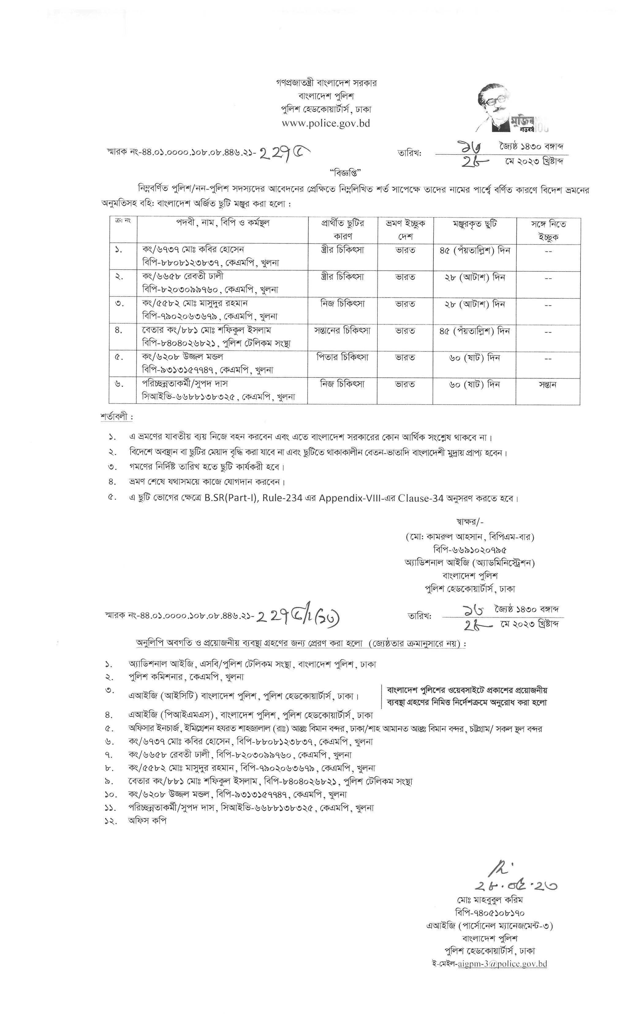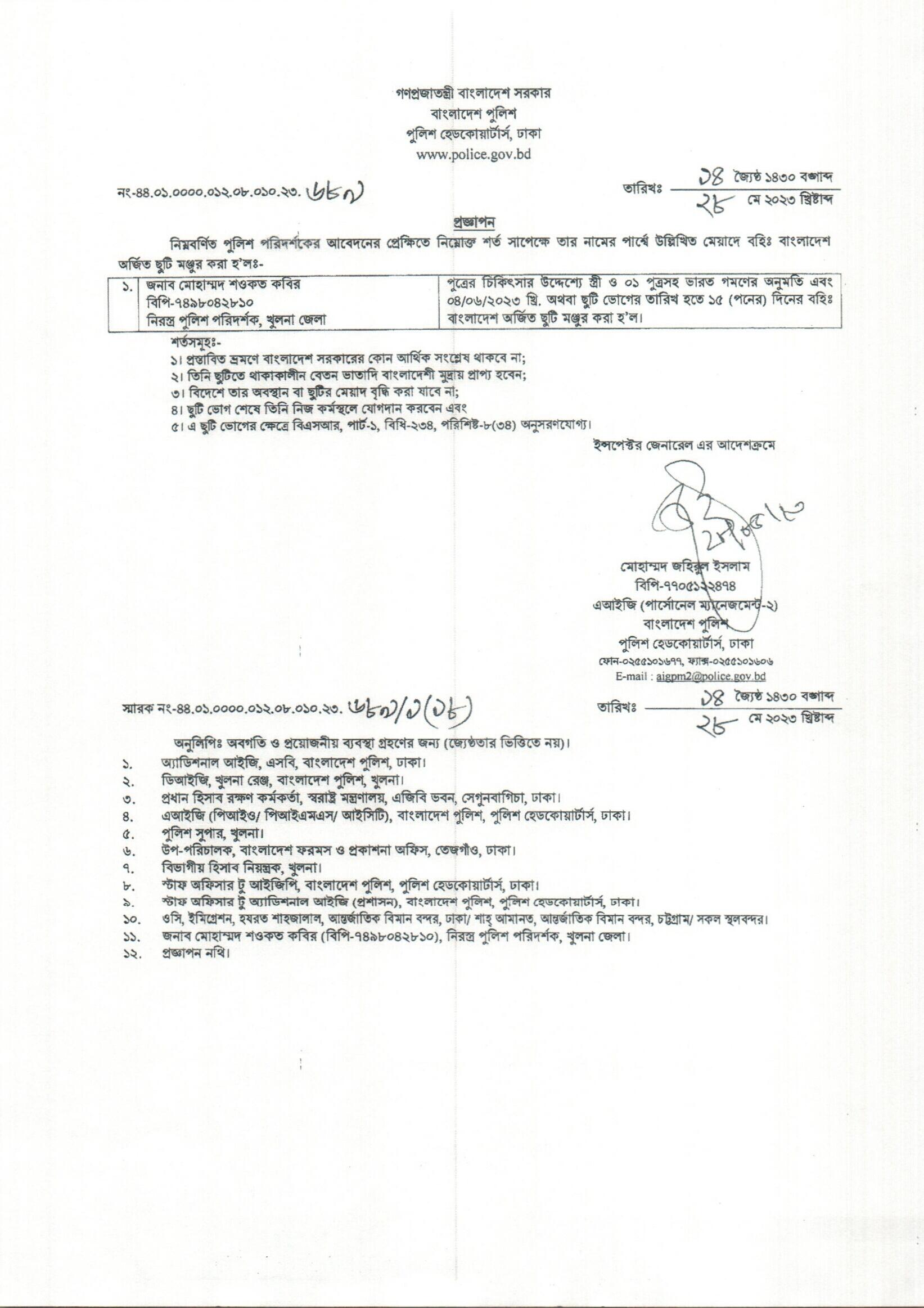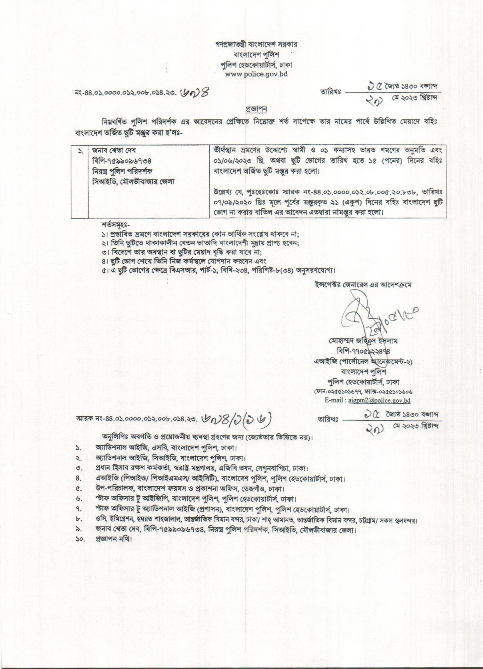 বহিঃ বাংলাদেশ ছুটি, বিজ্ঞপ্তি নং-২১৬৬ , তারিখঃ ২৩/০৫/২০২৩ খ্রিঃ।