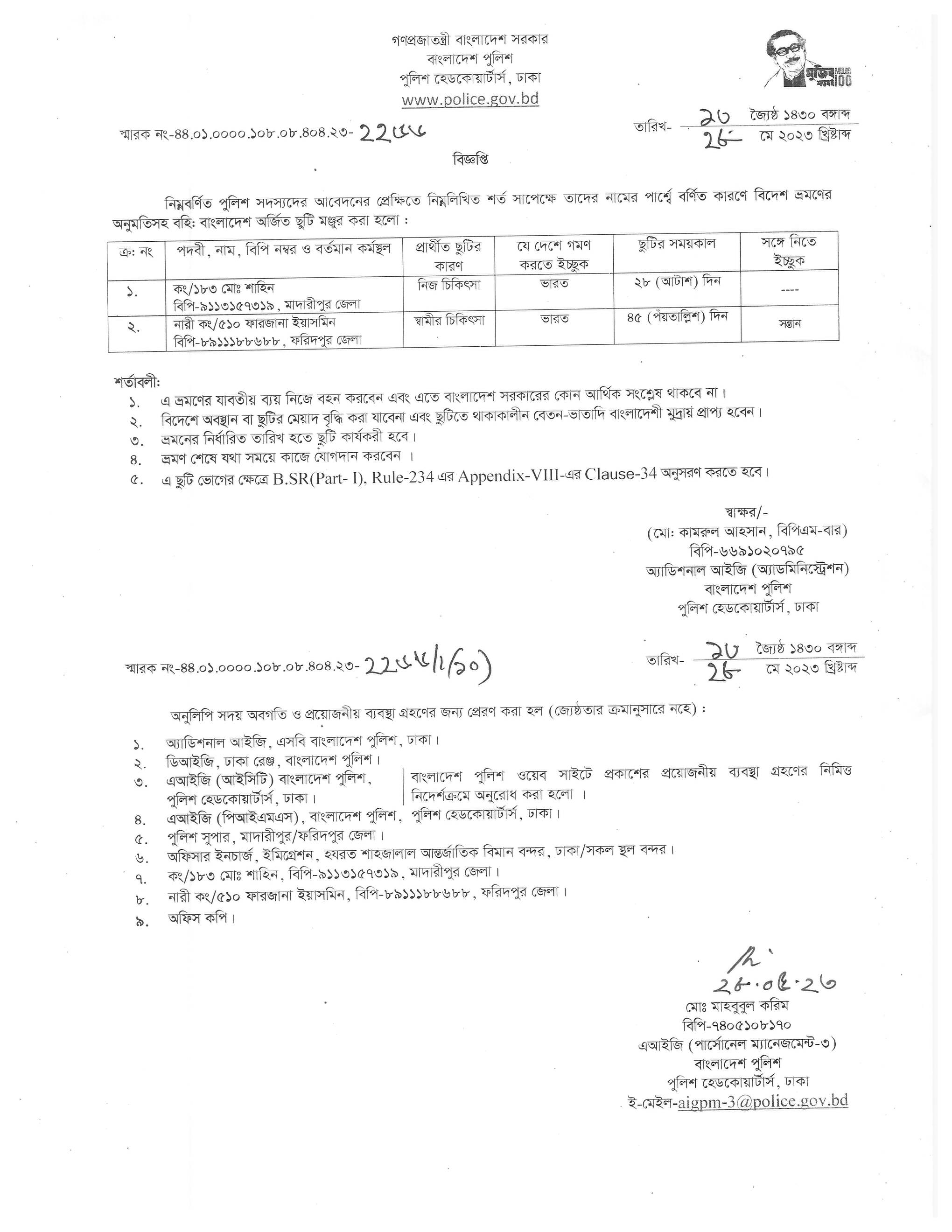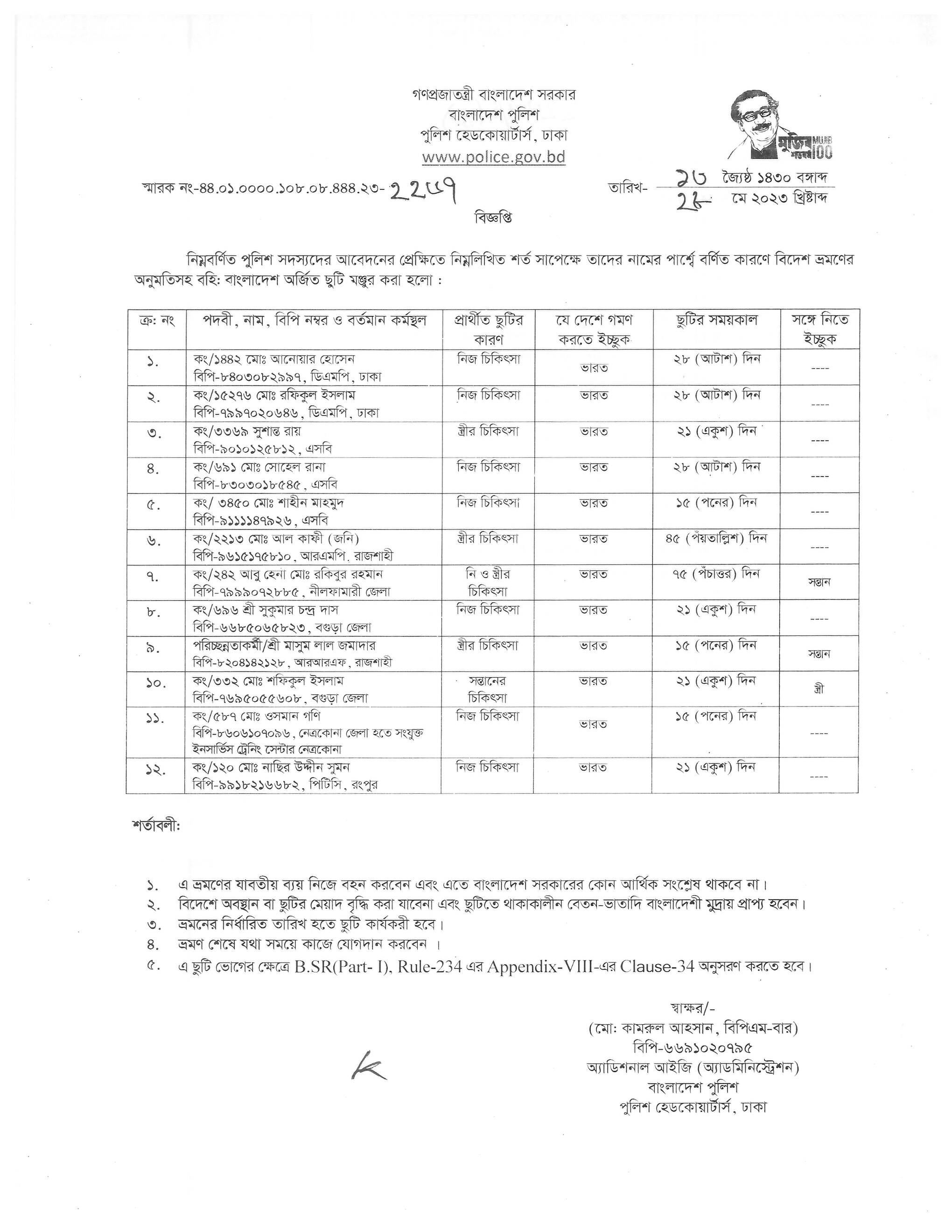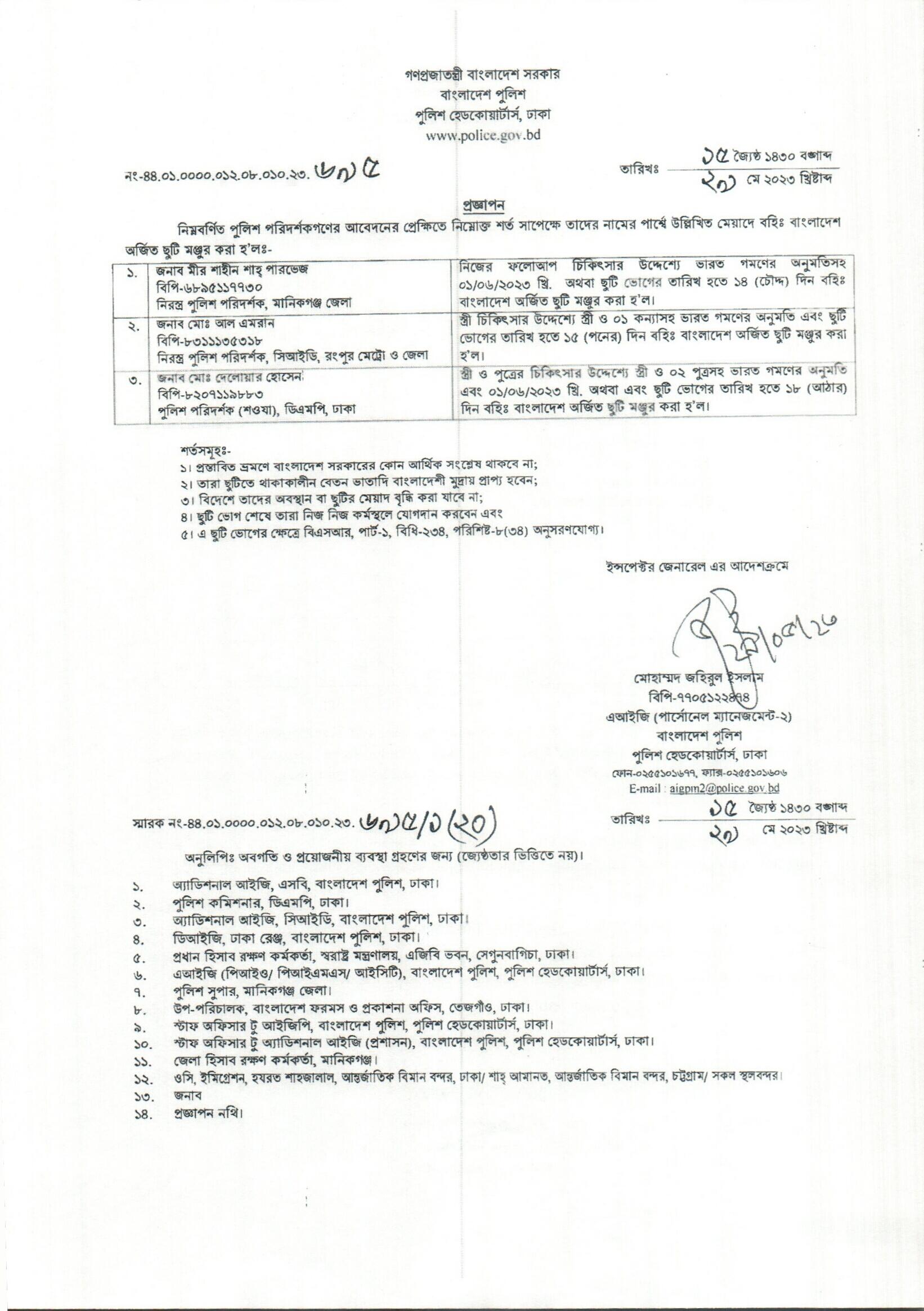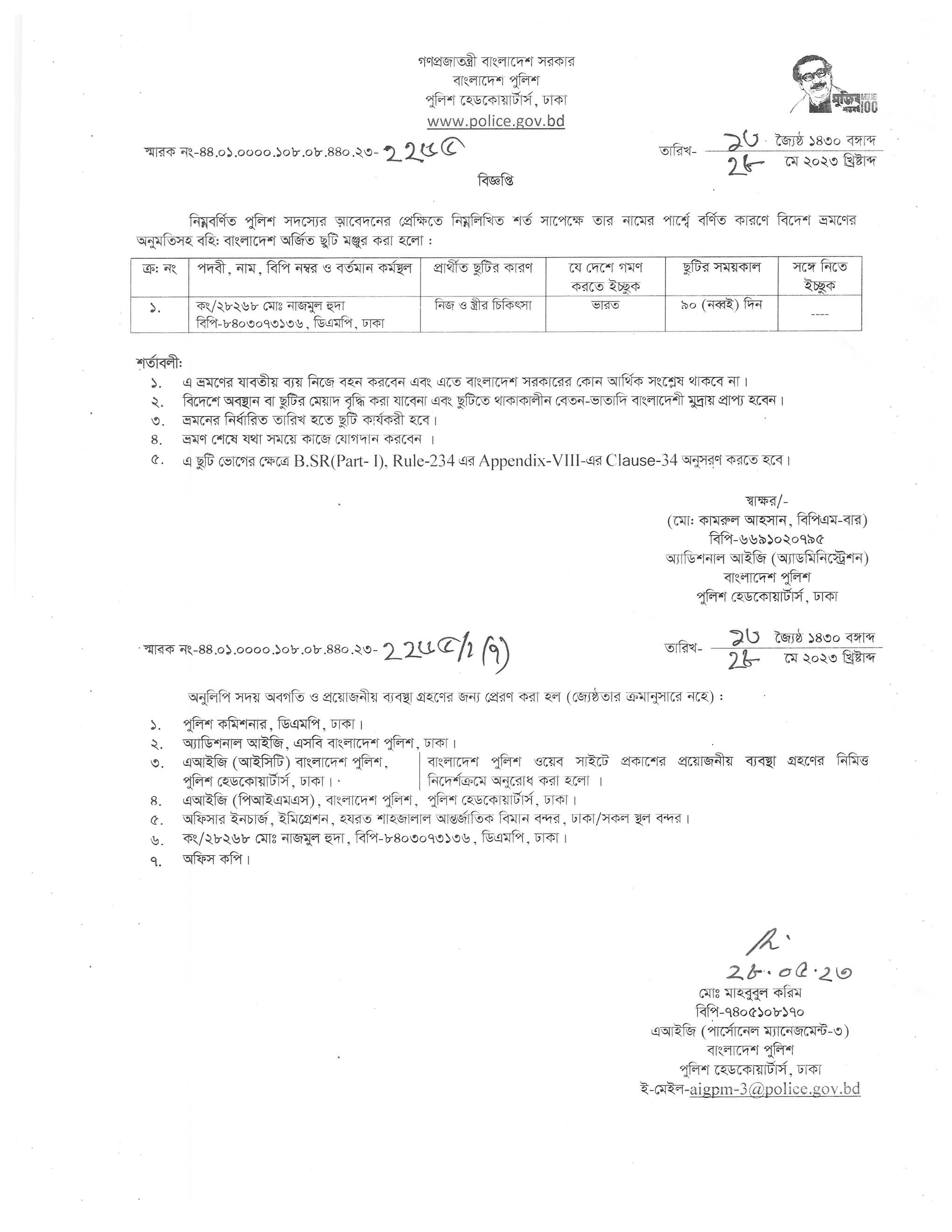 বহিঃ বাংলাদেশ ছুটি, বিজ্ঞপ্তি নং-২১৬৬ , তারিখঃ ২৩/০৫/২০২৩ খ্রিঃ।