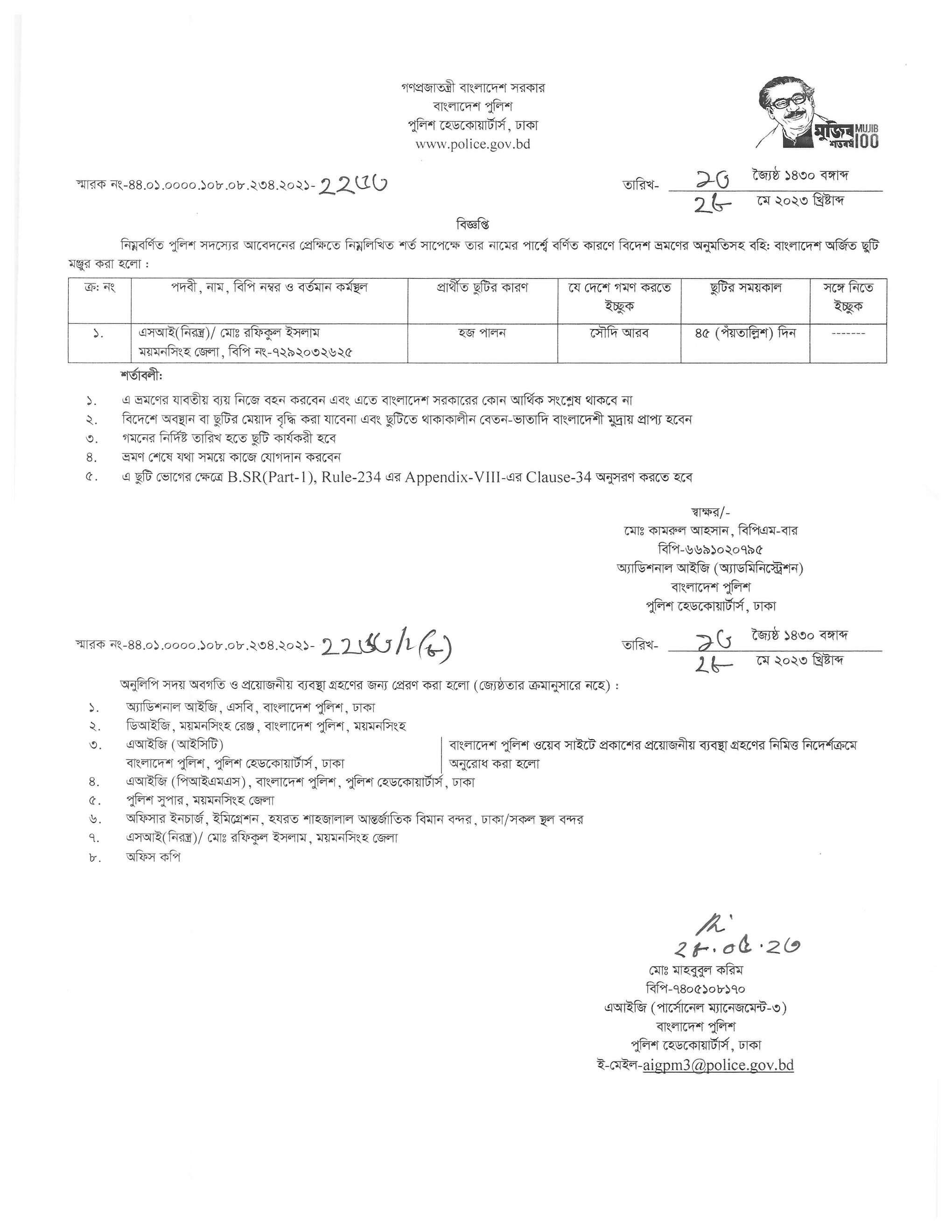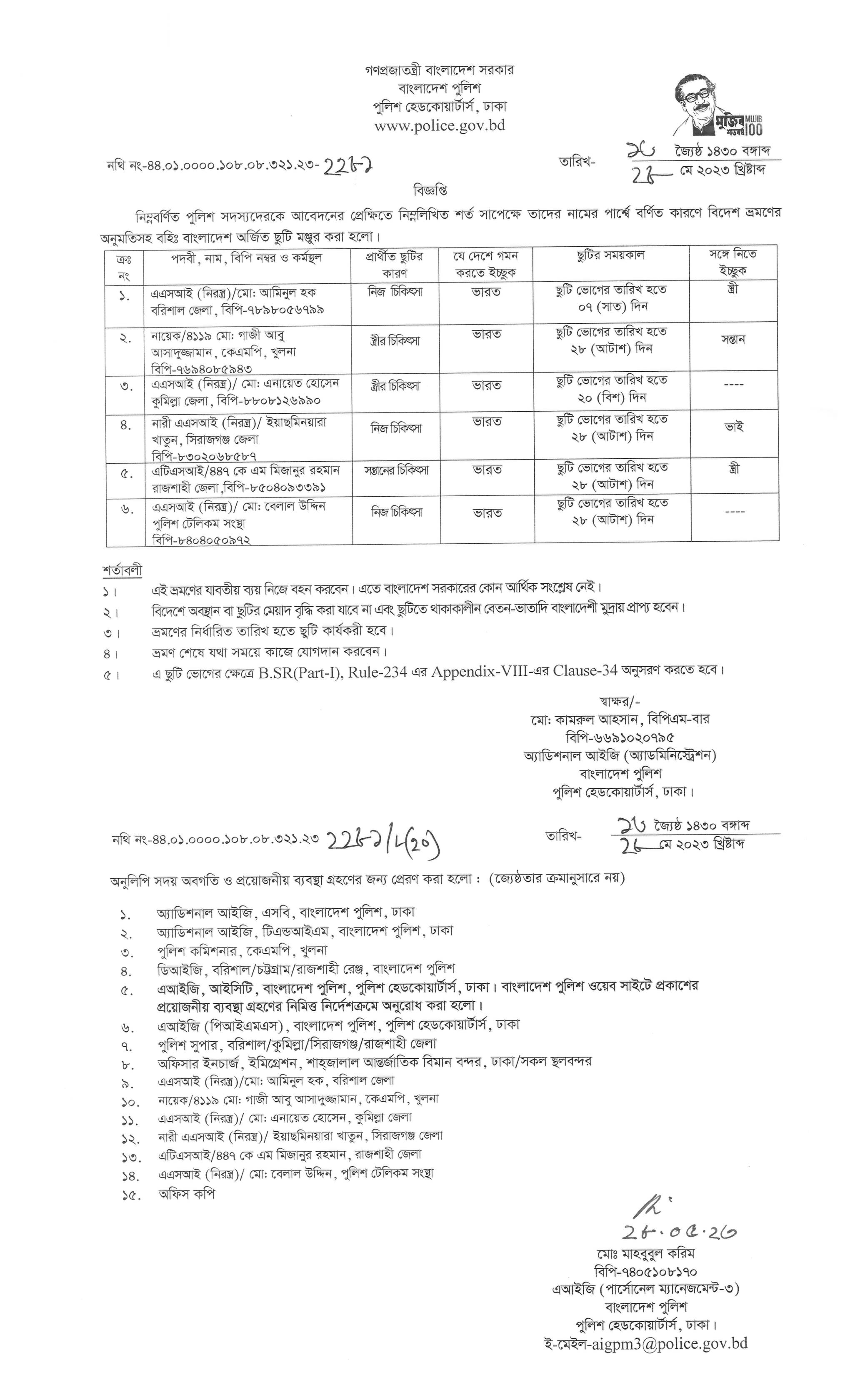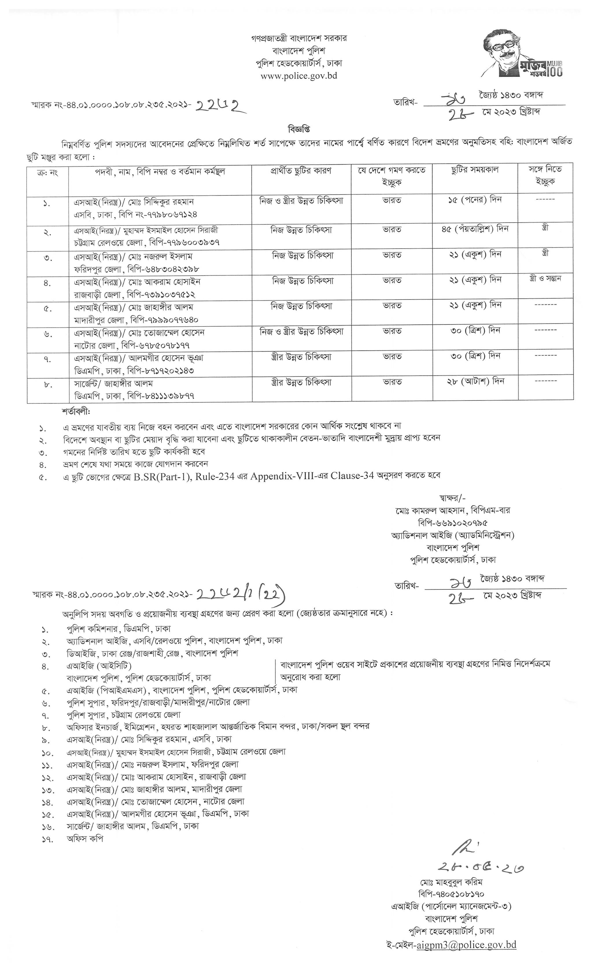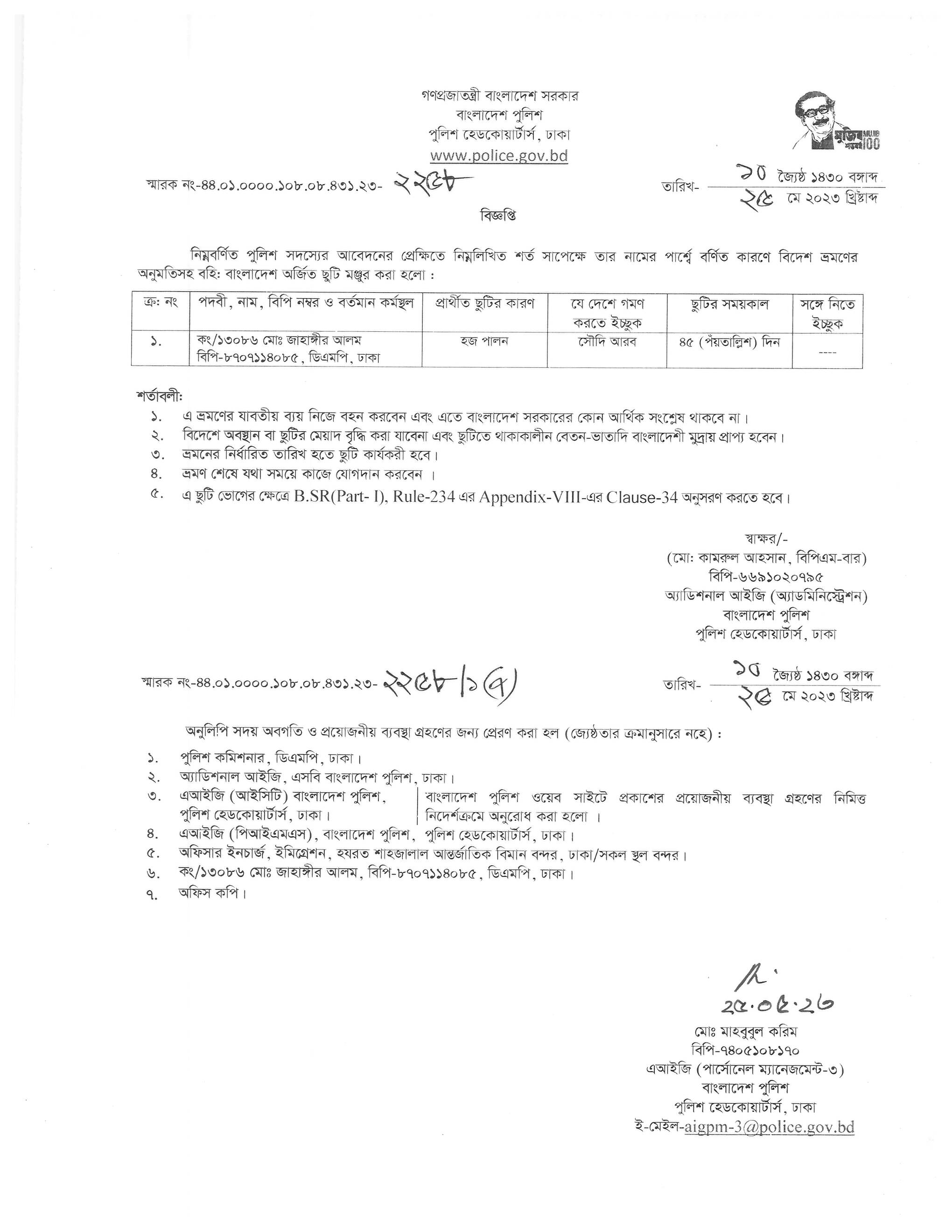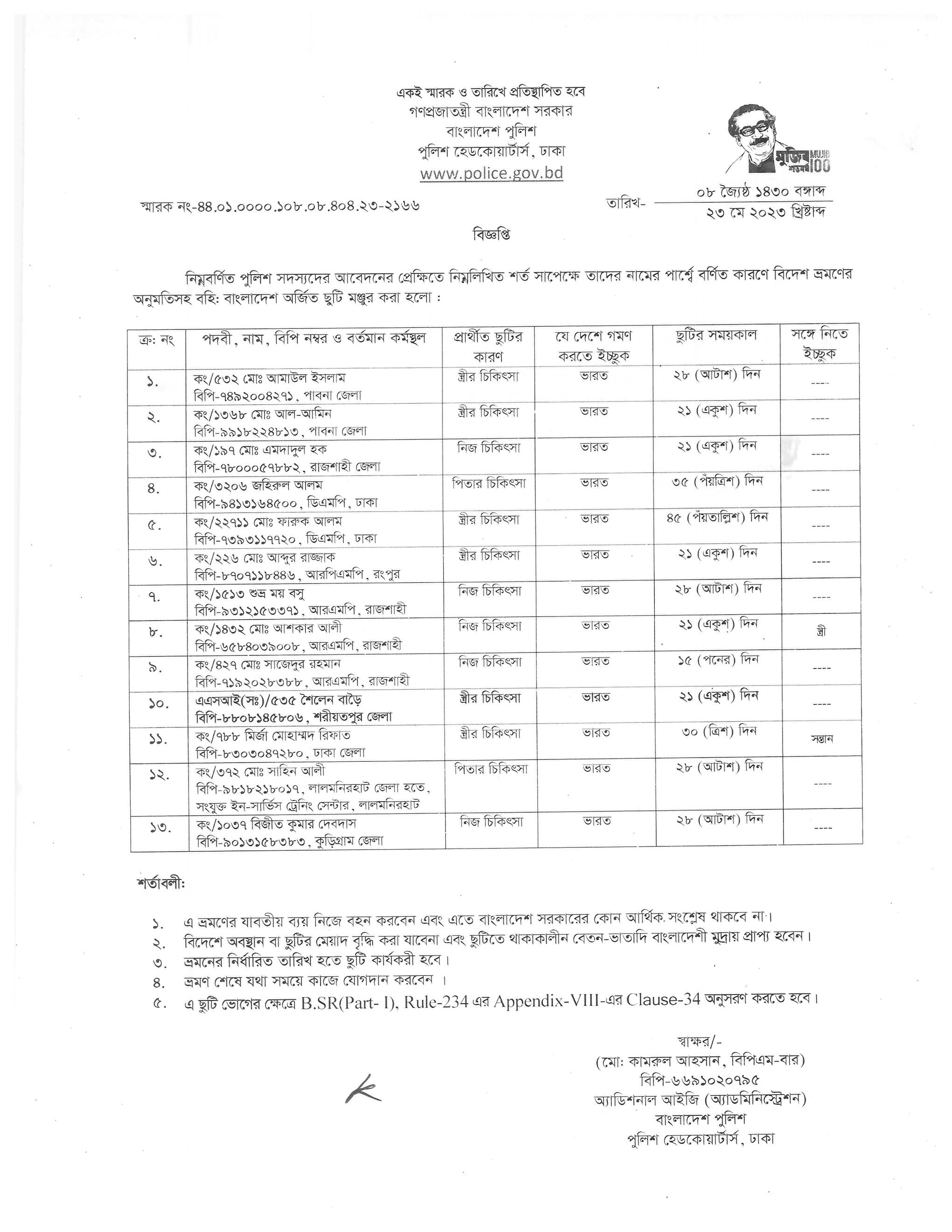 বহিঃ বাংলাদেশ ছুটি, বিজ্ঞপ্তি নং-২১৬৬ , তারিখঃ ২৩/০৫/২০২৩ খ্রিঃ।