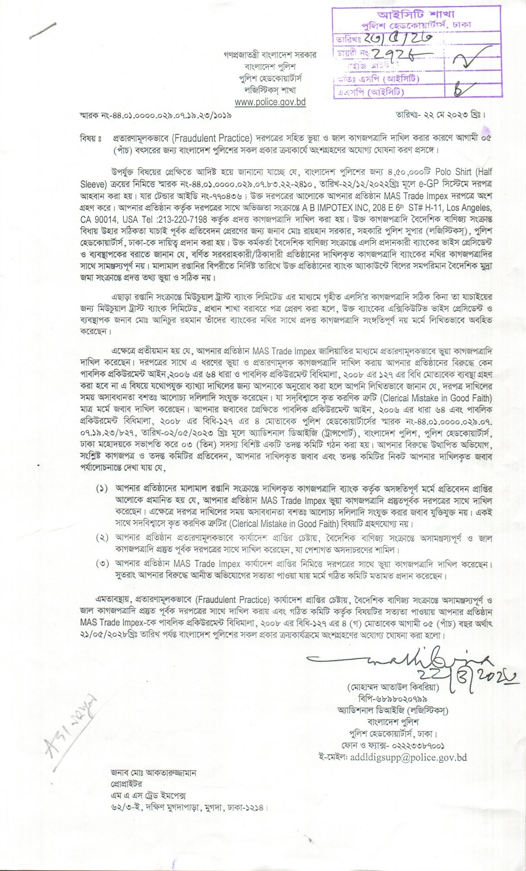 টেন্ডার থেকে অযোগ্য ঘোষনা , বিজ্ঞপ্তি নং-১০১৯ , তারিখঃ ২২/০৫/২০২৩ খ্রিঃ।