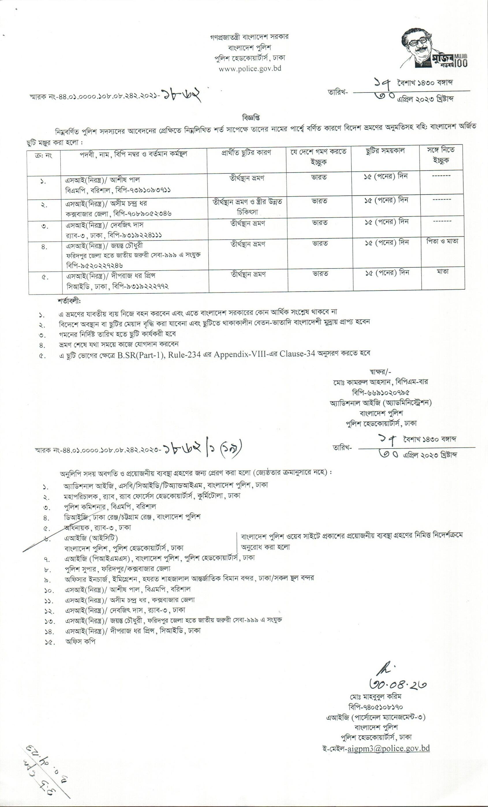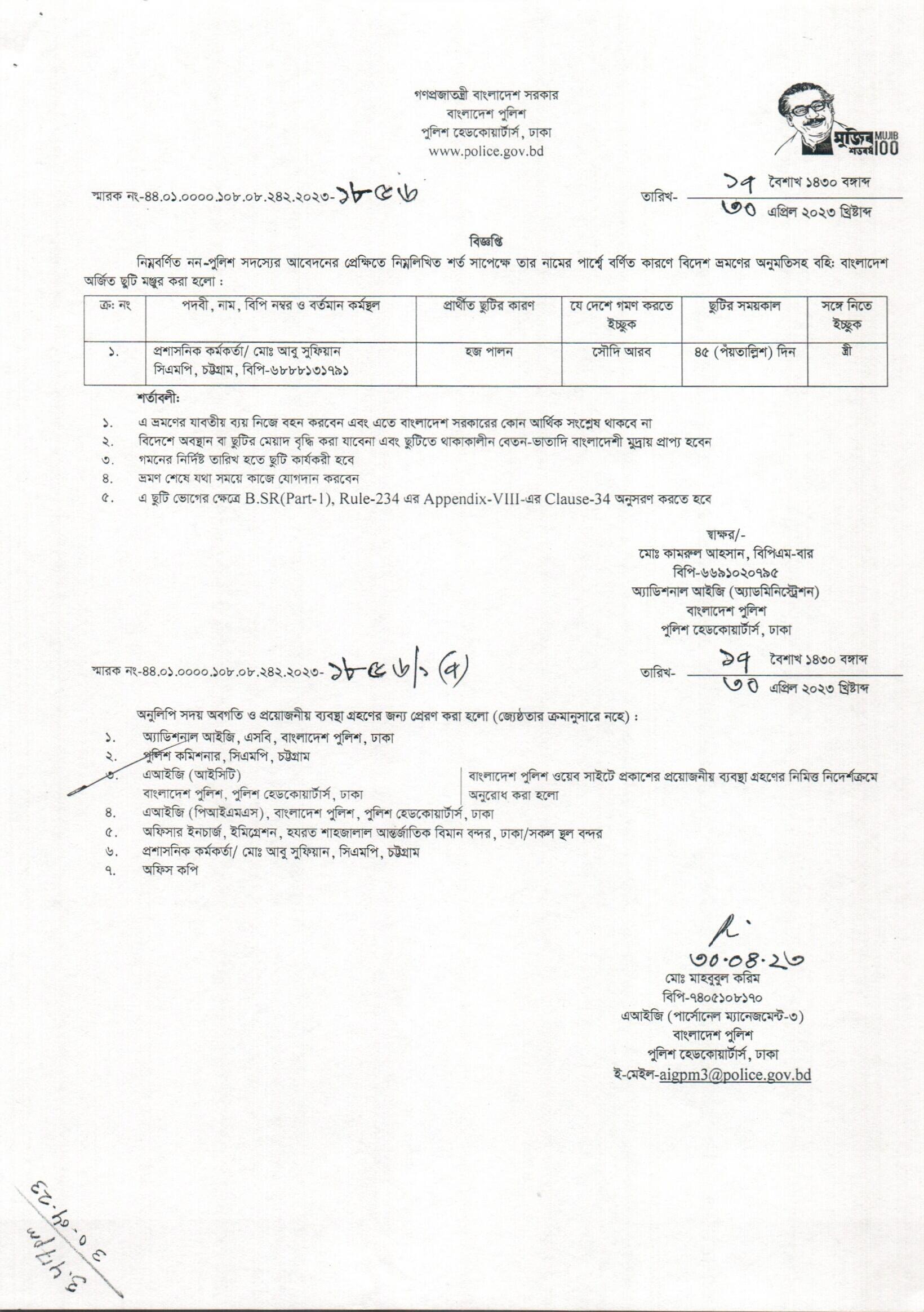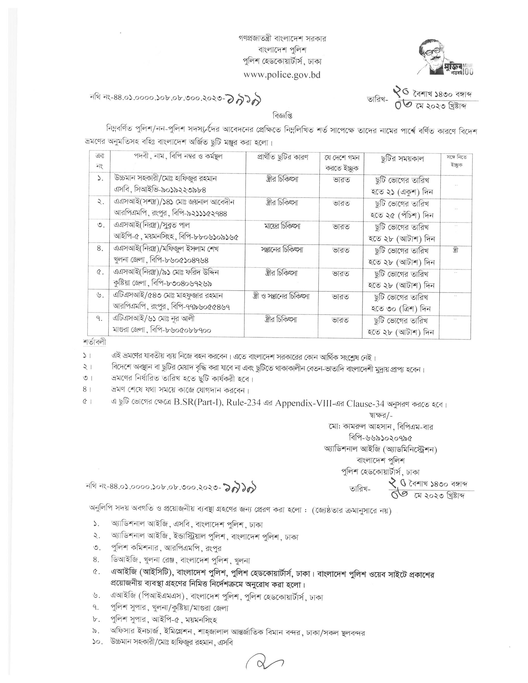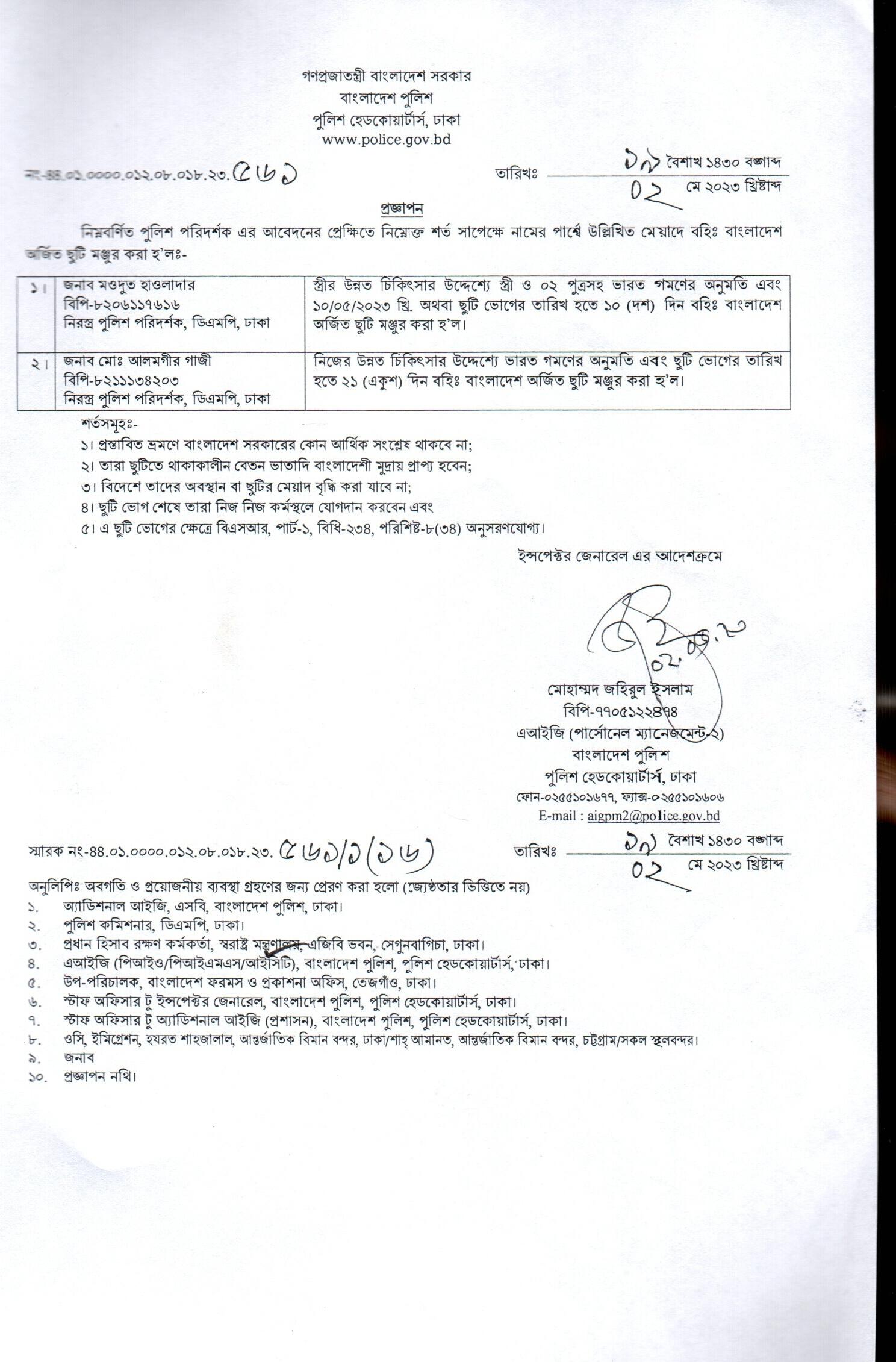 বহিঃ বাংলাদেশ ছুটি, বিজ্ঞপ্তি নং- ১৯২৯, তারিখঃ ০৭/০৫/২০২৩ খ্রিঃ।
