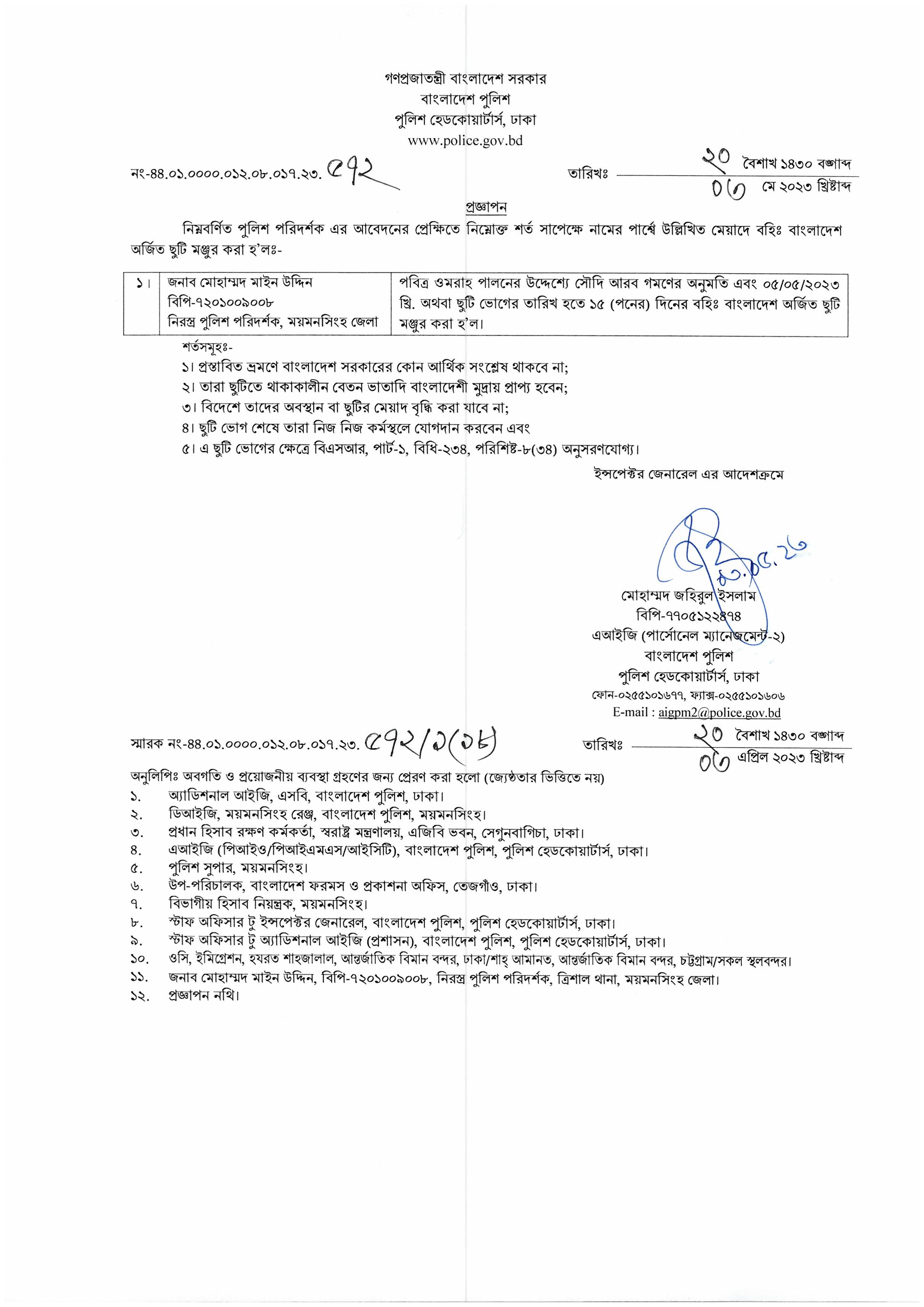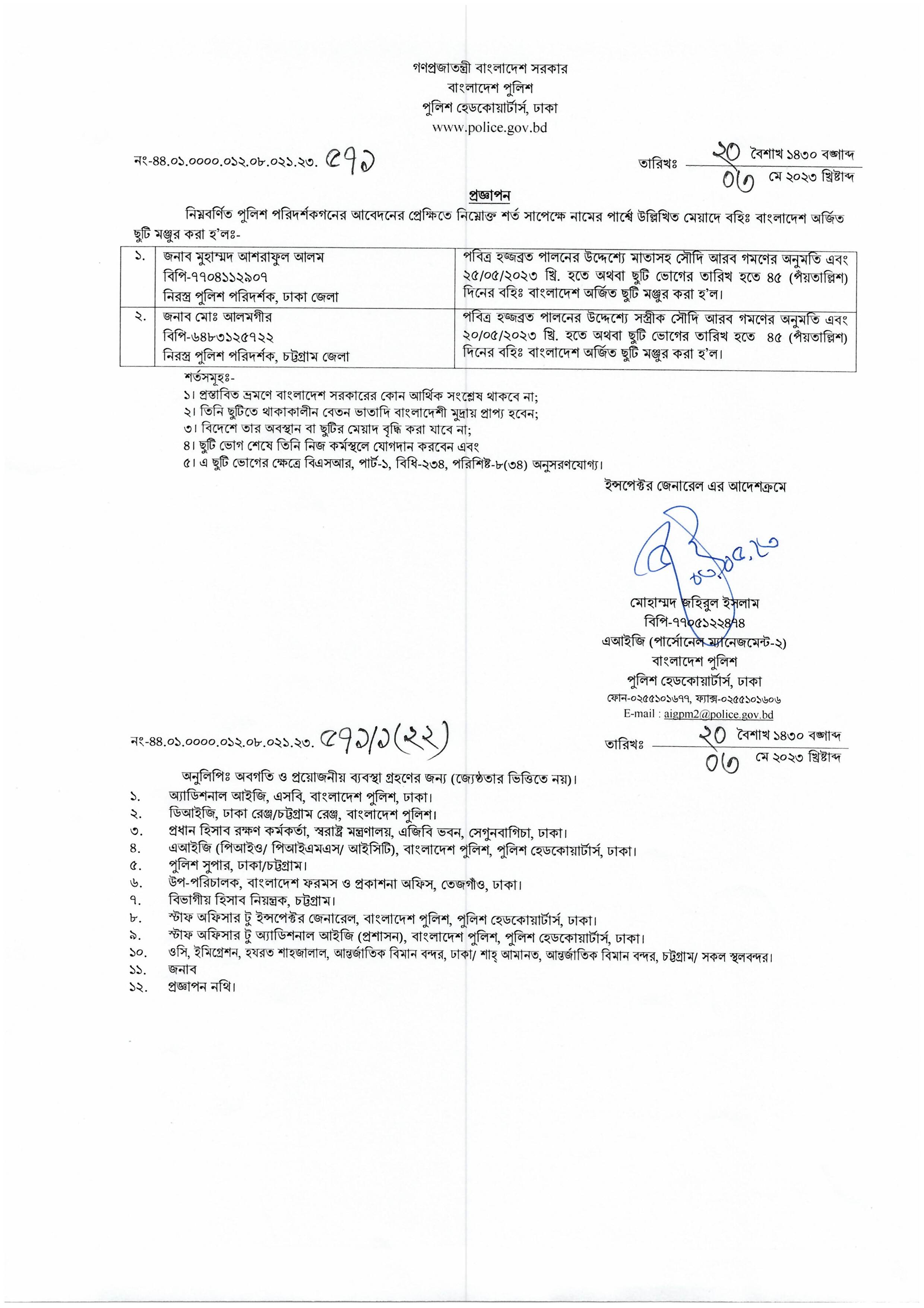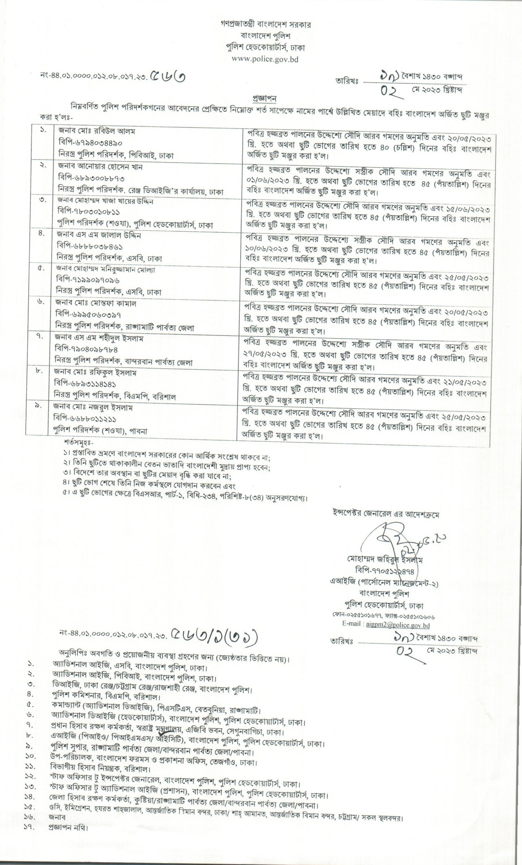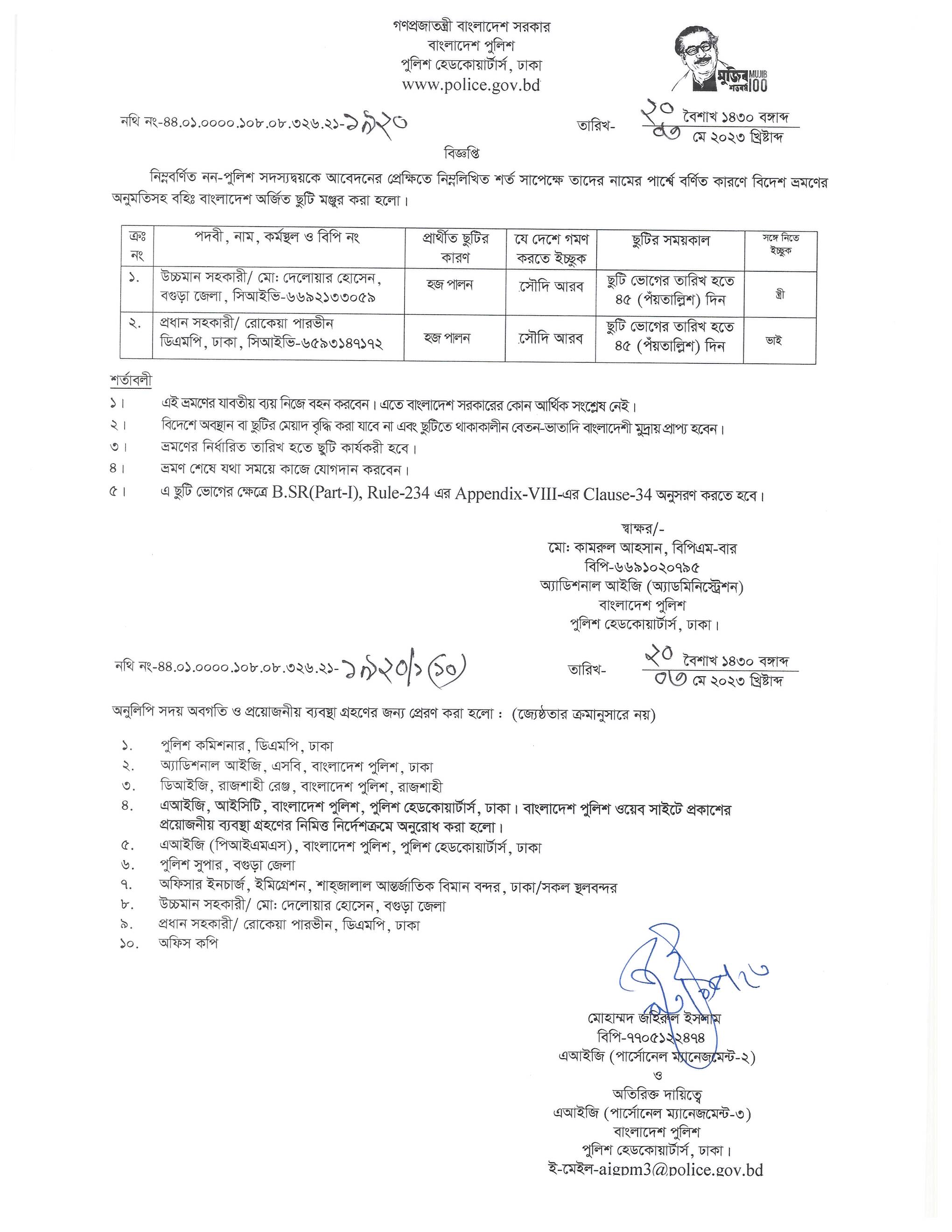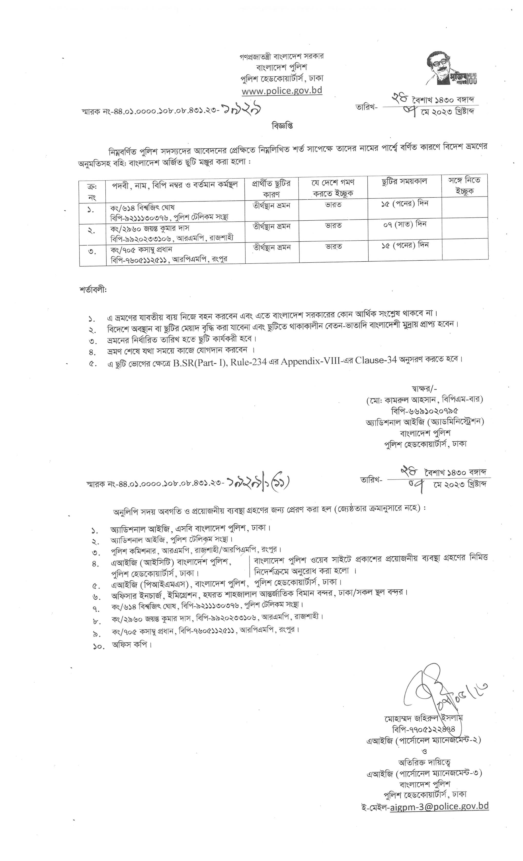 বহিঃ বাংলাদেশ ছুটি, বিজ্ঞপ্তি নং- ১৯২৮, তারিখঃ ০৭/০৫/২০২৩ খ্রিঃ।