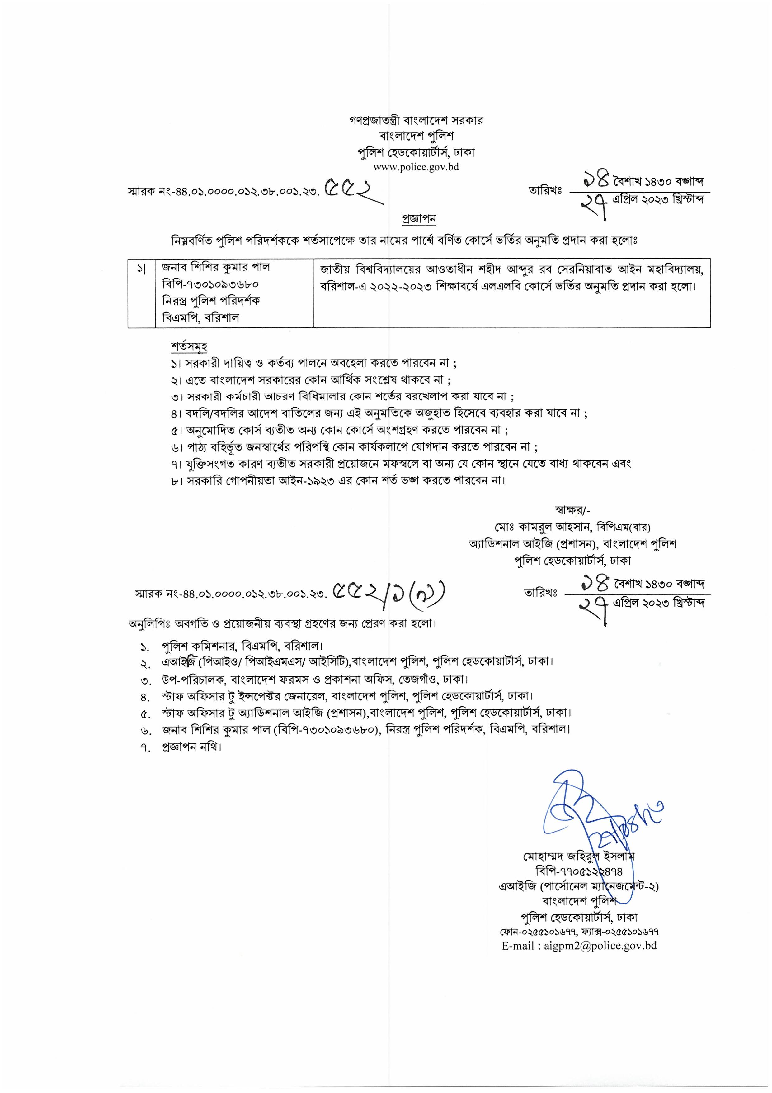 কোর্সে ভর্তি অনুমতি, প্রজ্ঞাপন নং- ৫৫২, তারিখঃ ২৭/০৪/২০২৩ খ্রিঃ।