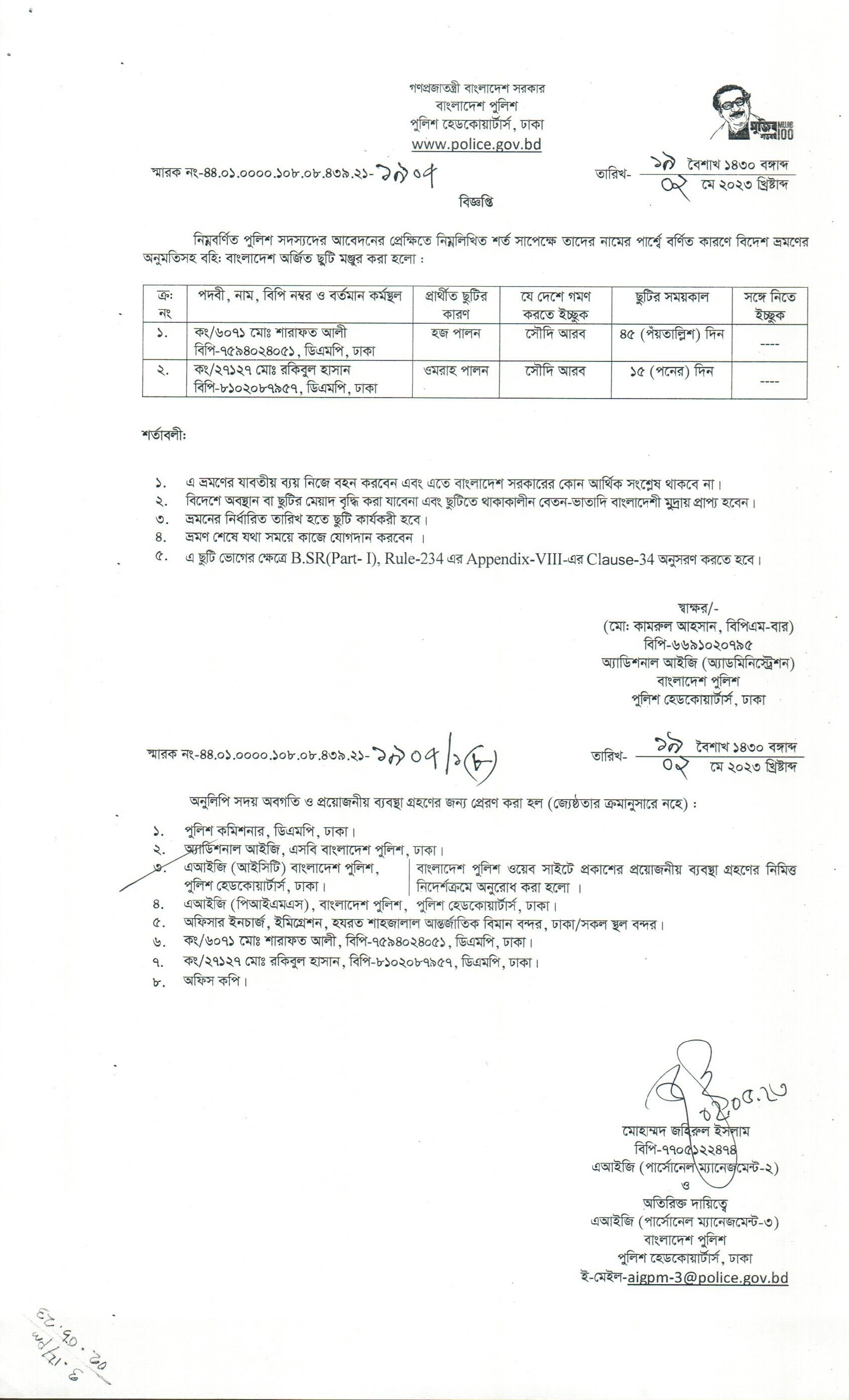 বহিঃ বাংলাদেশ ছুটি, বিজ্ঞপ্তি নং- ১৯০৭, তারিখঃ ০২/০৫/২০২৩ খ্রিঃ।