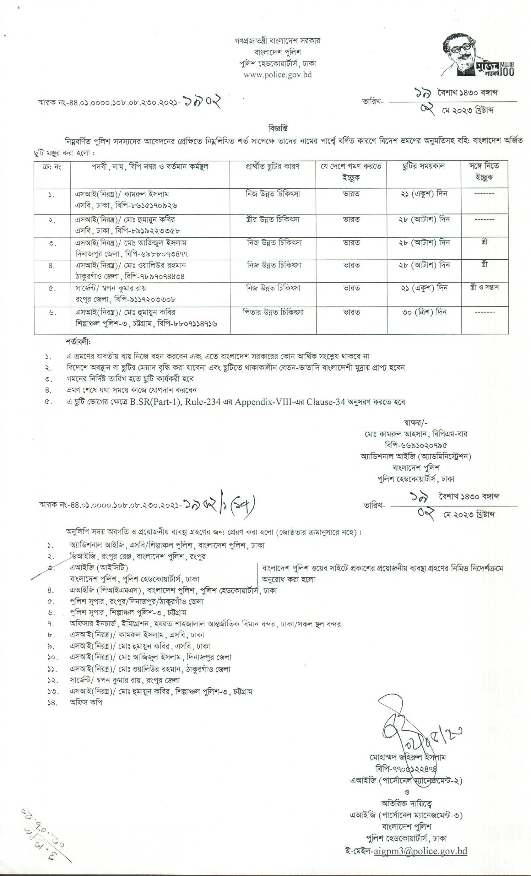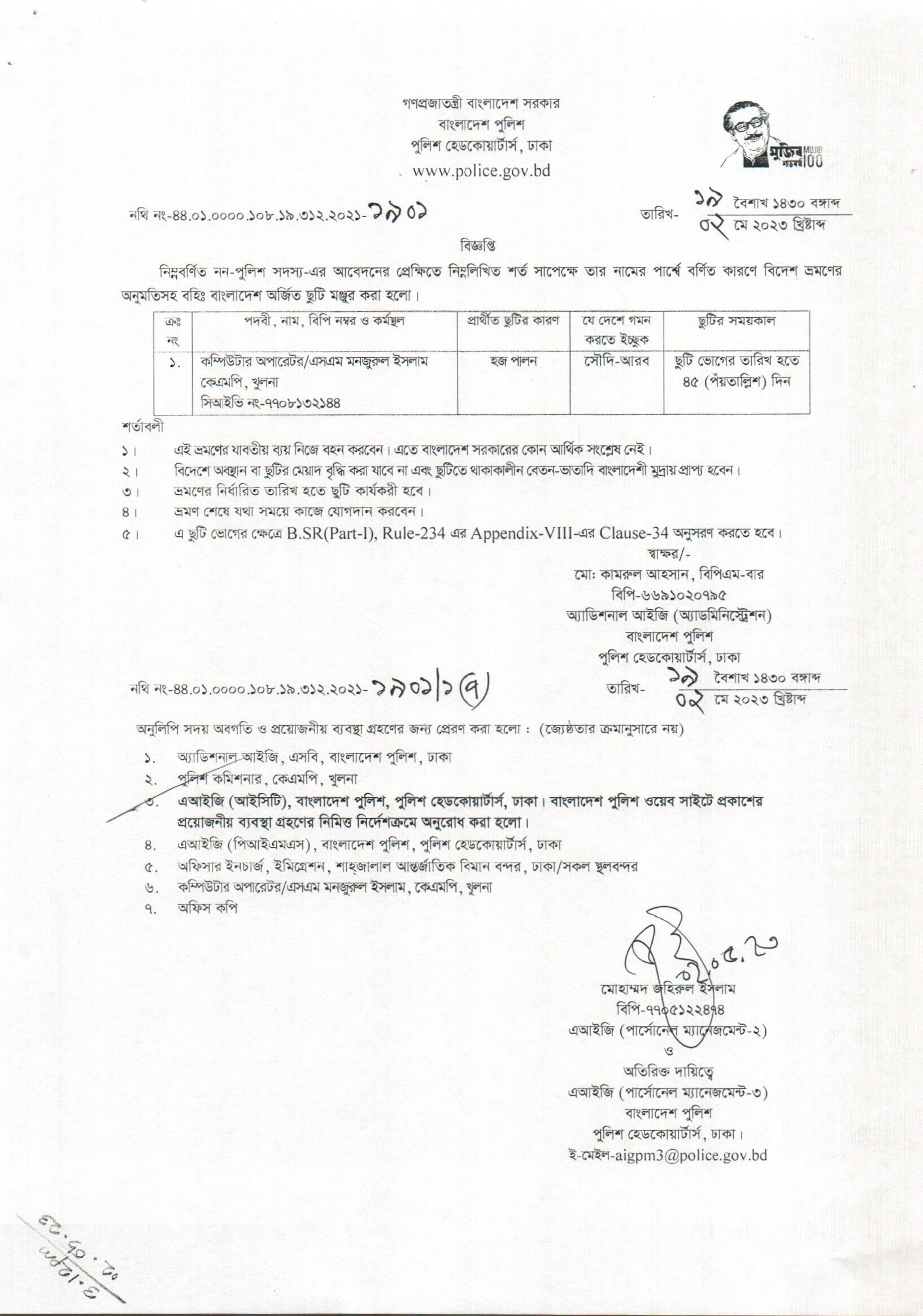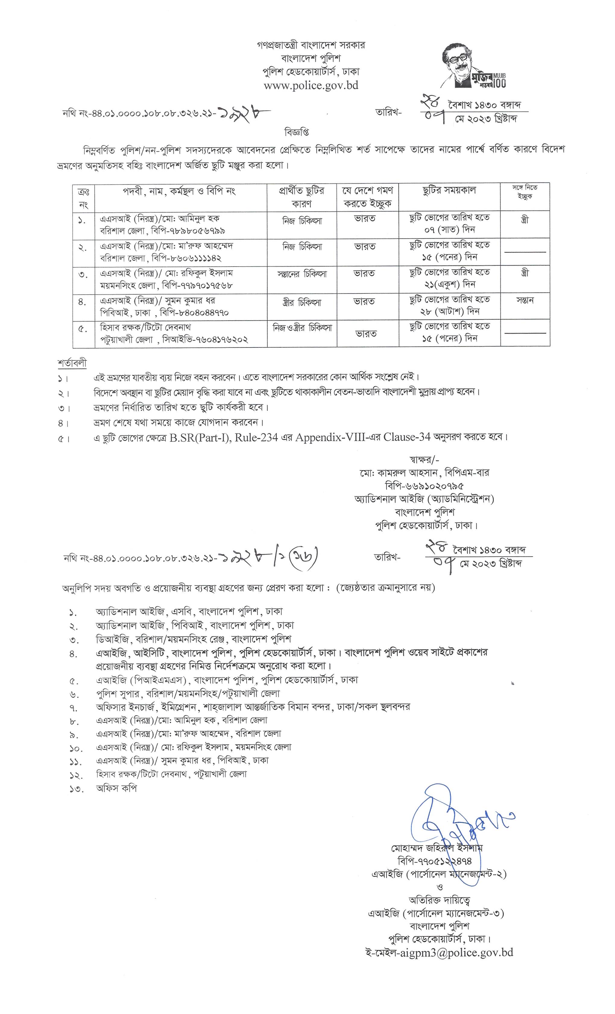 বহিঃ বাংলাদেশ ছুটি, বিজ্ঞপ্তি নং- ১৯১৯, তারিখঃ ০৩/০৫/২০২৩ খ্রিঃ।
