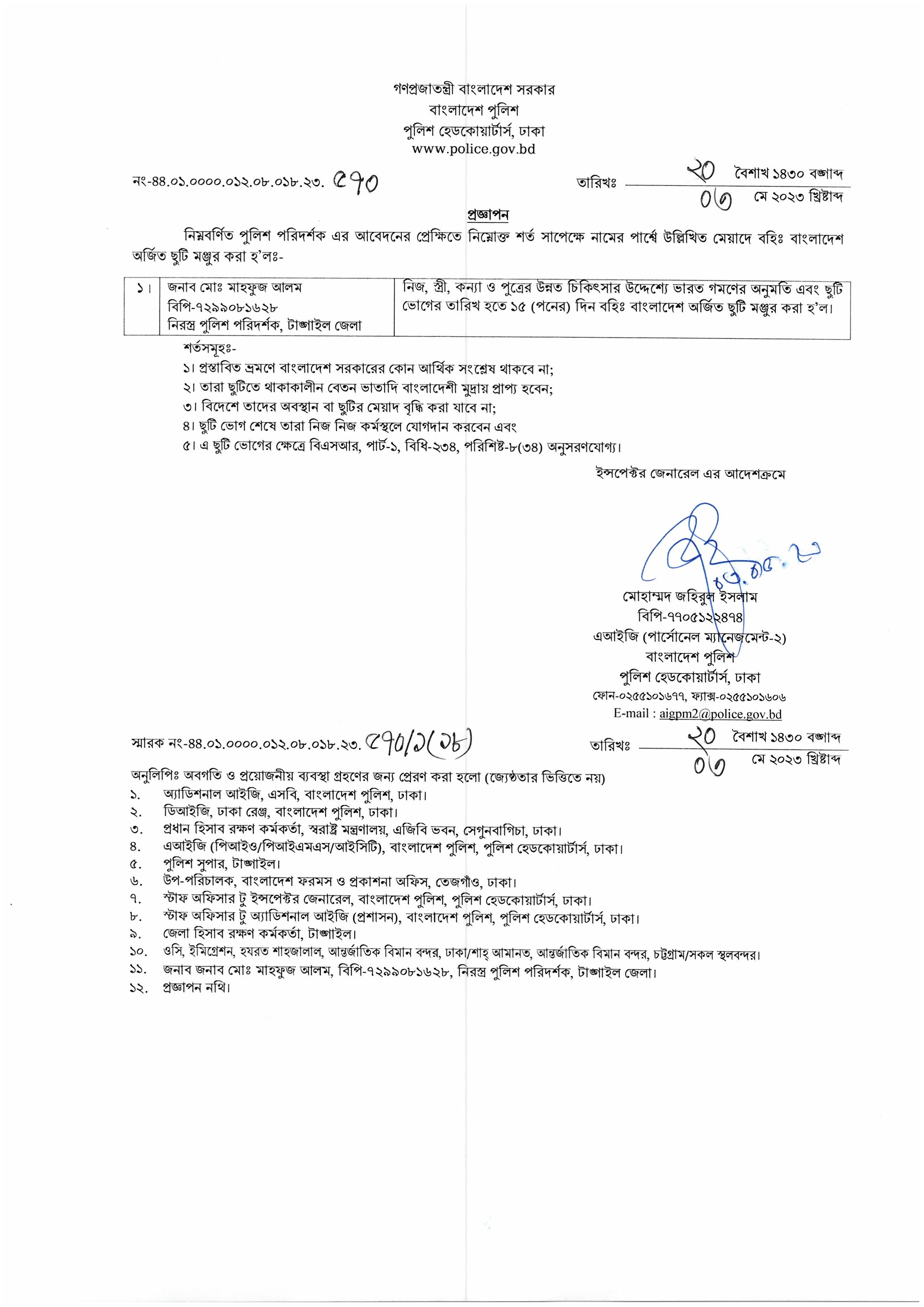 বহিঃ বাংলাদেশ ছুটি, বিজ্ঞপ্তি নং- ১৯৩২, তারিখঃ ০৭/০৫/২০২৩ খ্রিঃ।