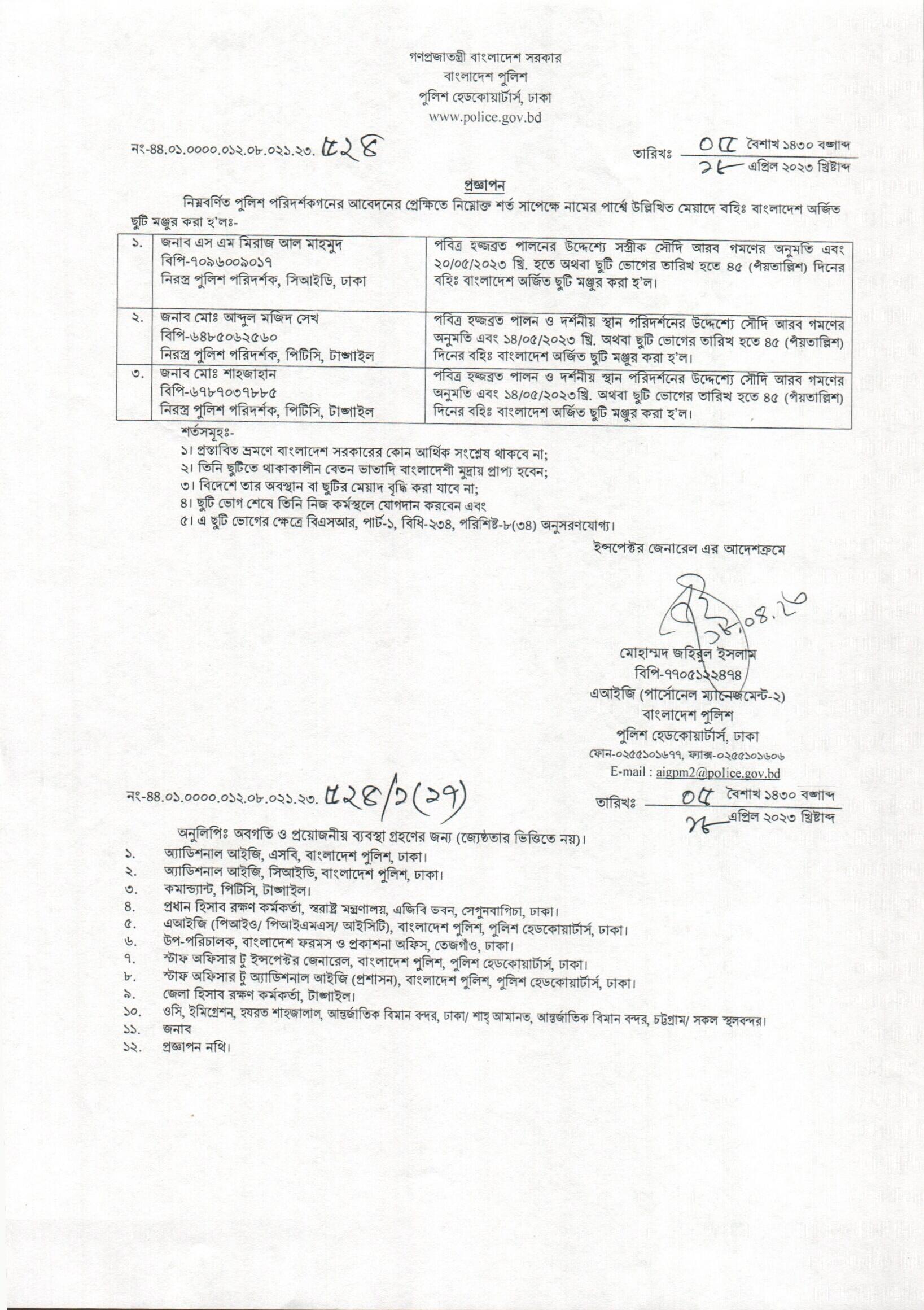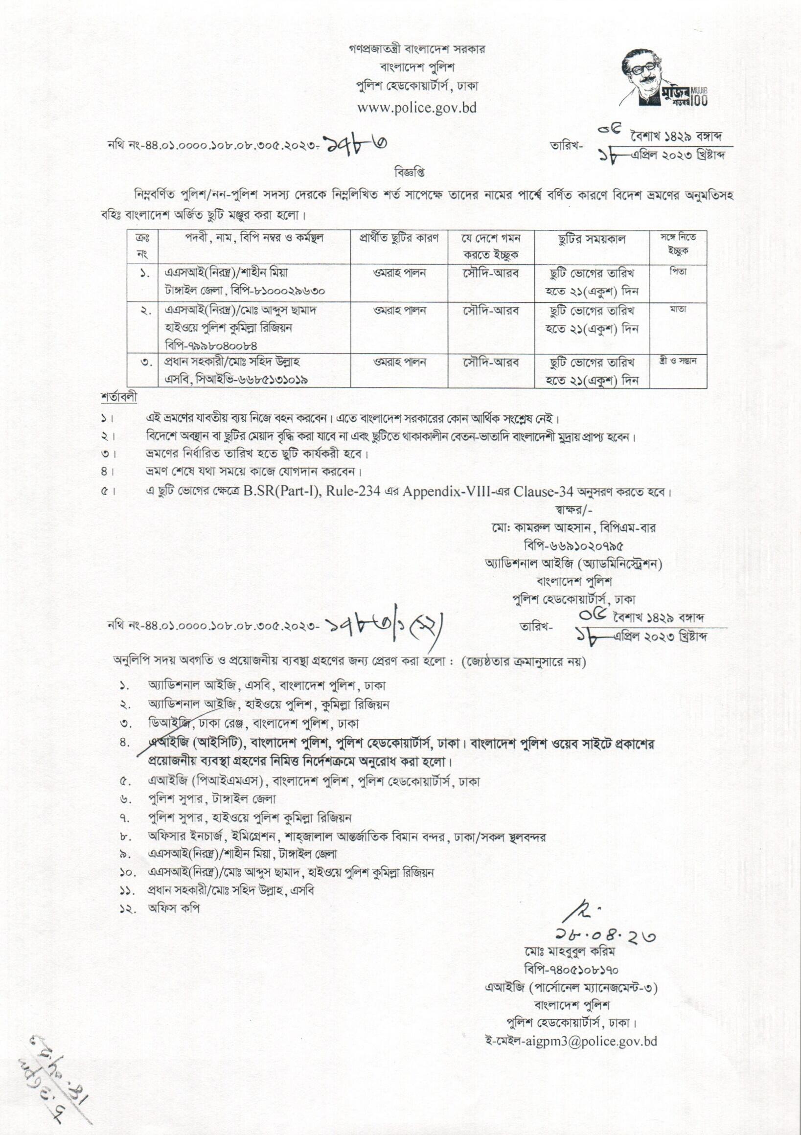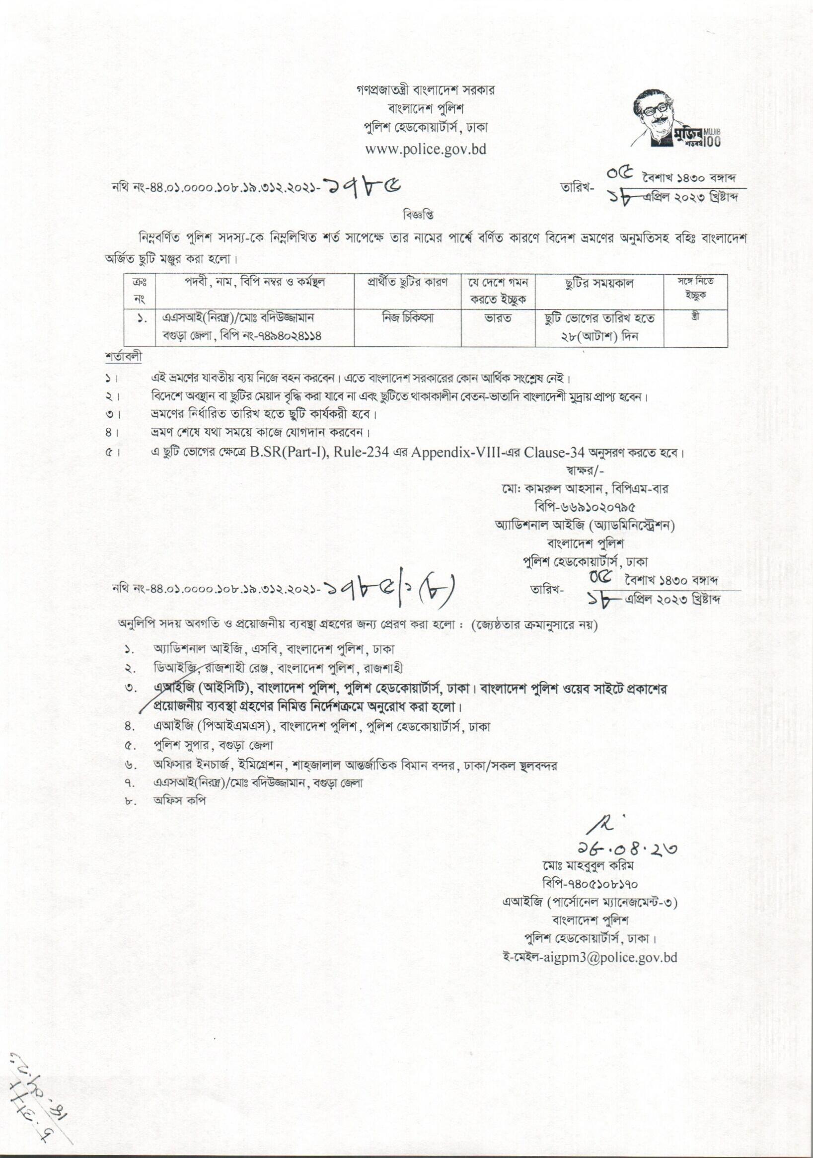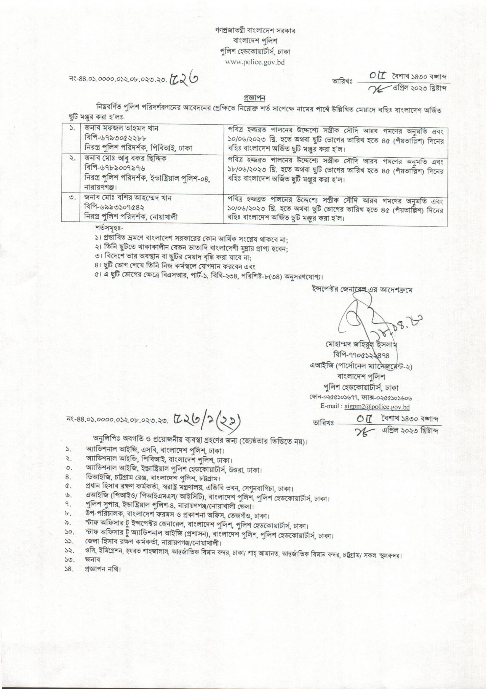 বহিঃ বাংলাদেশ ছুটি, বিজ্ঞপ্তি নং-১৭৮৫, তারিখঃ ১৮/০৪/২০২৩ খ্রিঃ।