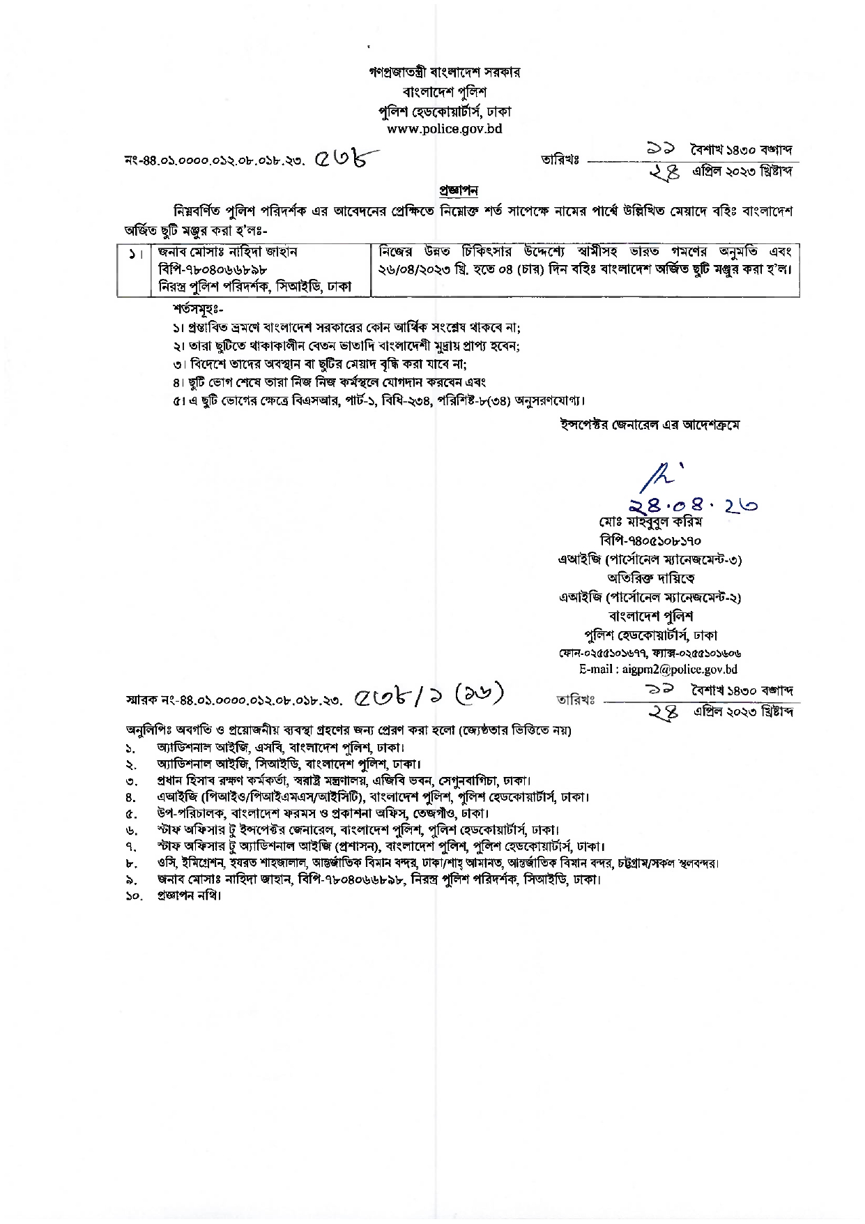 বহিঃ বাংলাদেশ ছুটি, বিজ্ঞপ্তি নং-১৭৮৪, তারিখঃ ১৮/০৪/২০২৩ খ্রিঃ।