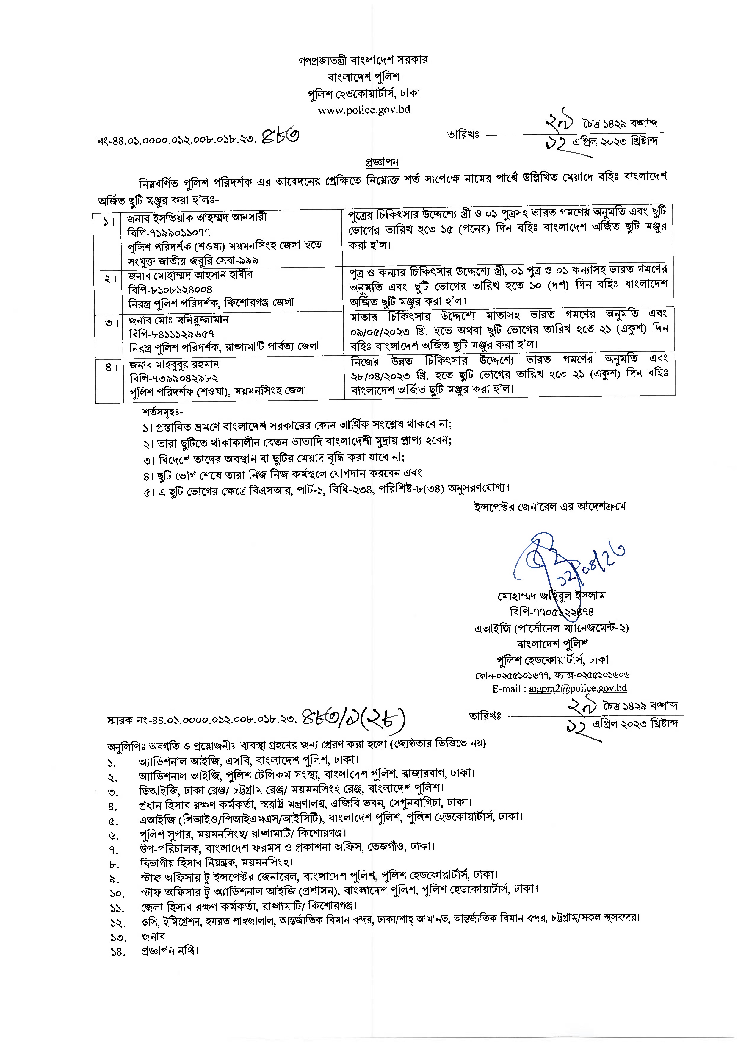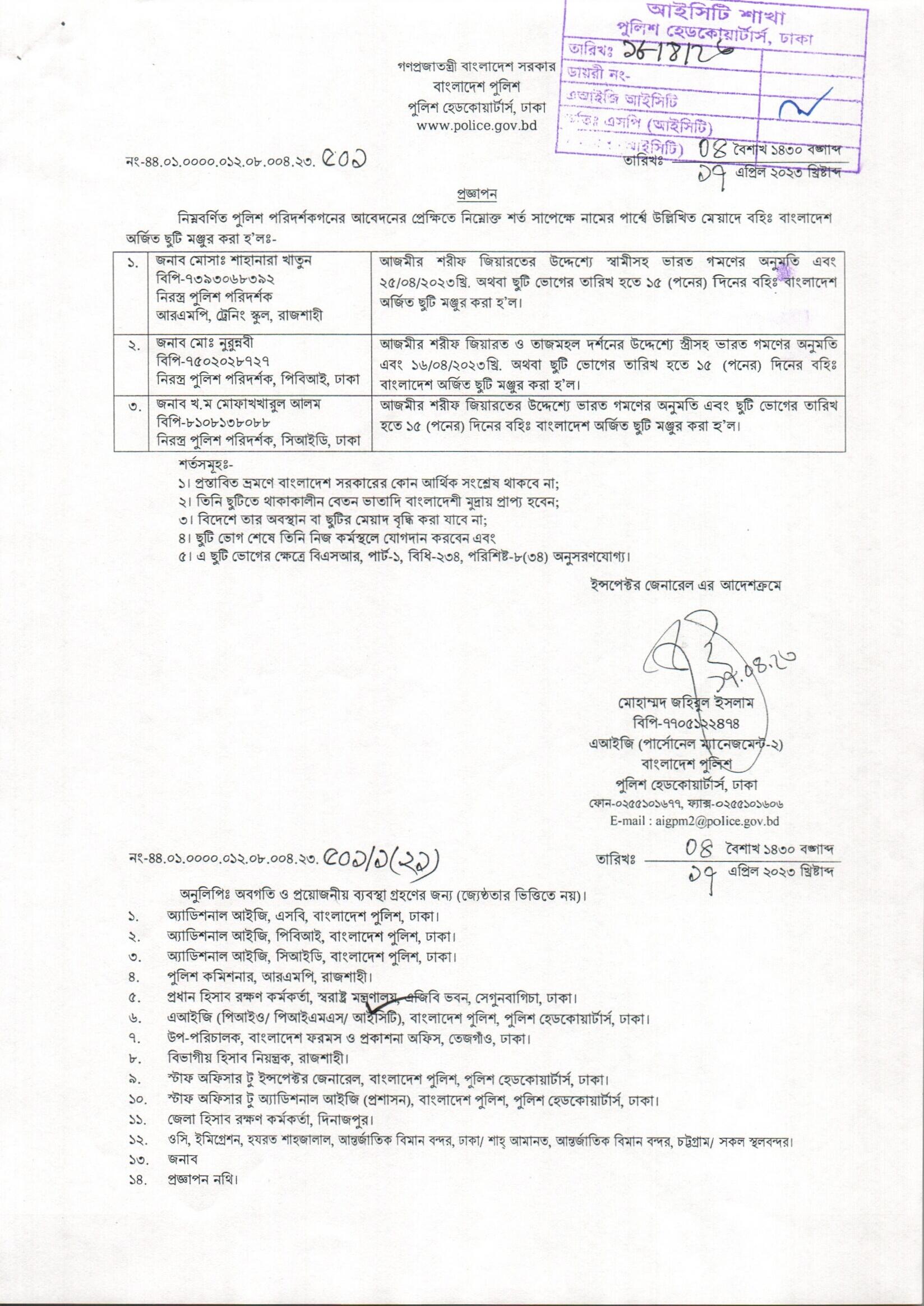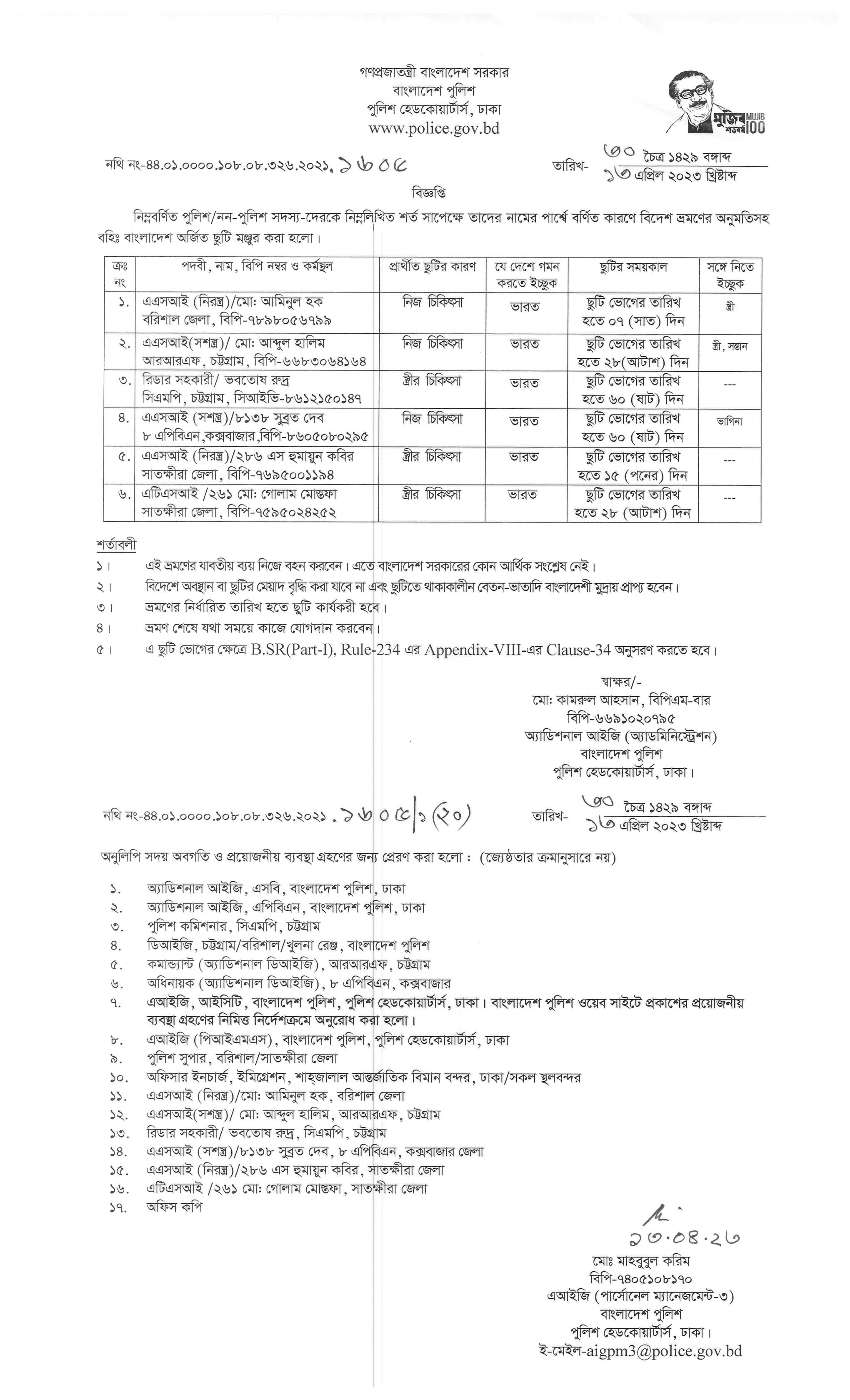 বহিঃ বাংলাদেশ ছুটি, বিজ্ঞপ্তি নং- ১৭৬৯, তারিখঃ ১৮/০৪/২০২৩ খ্রিঃ।