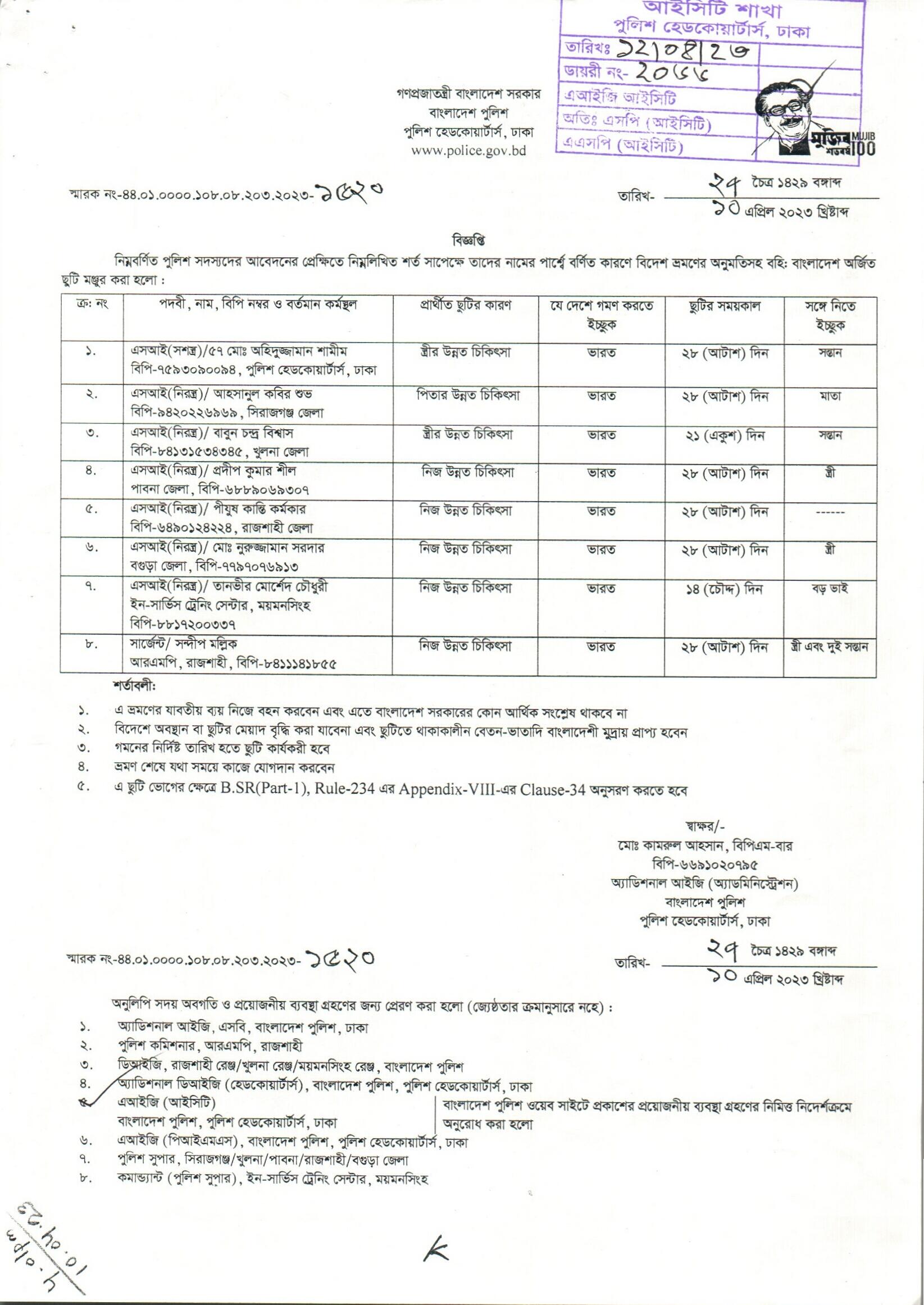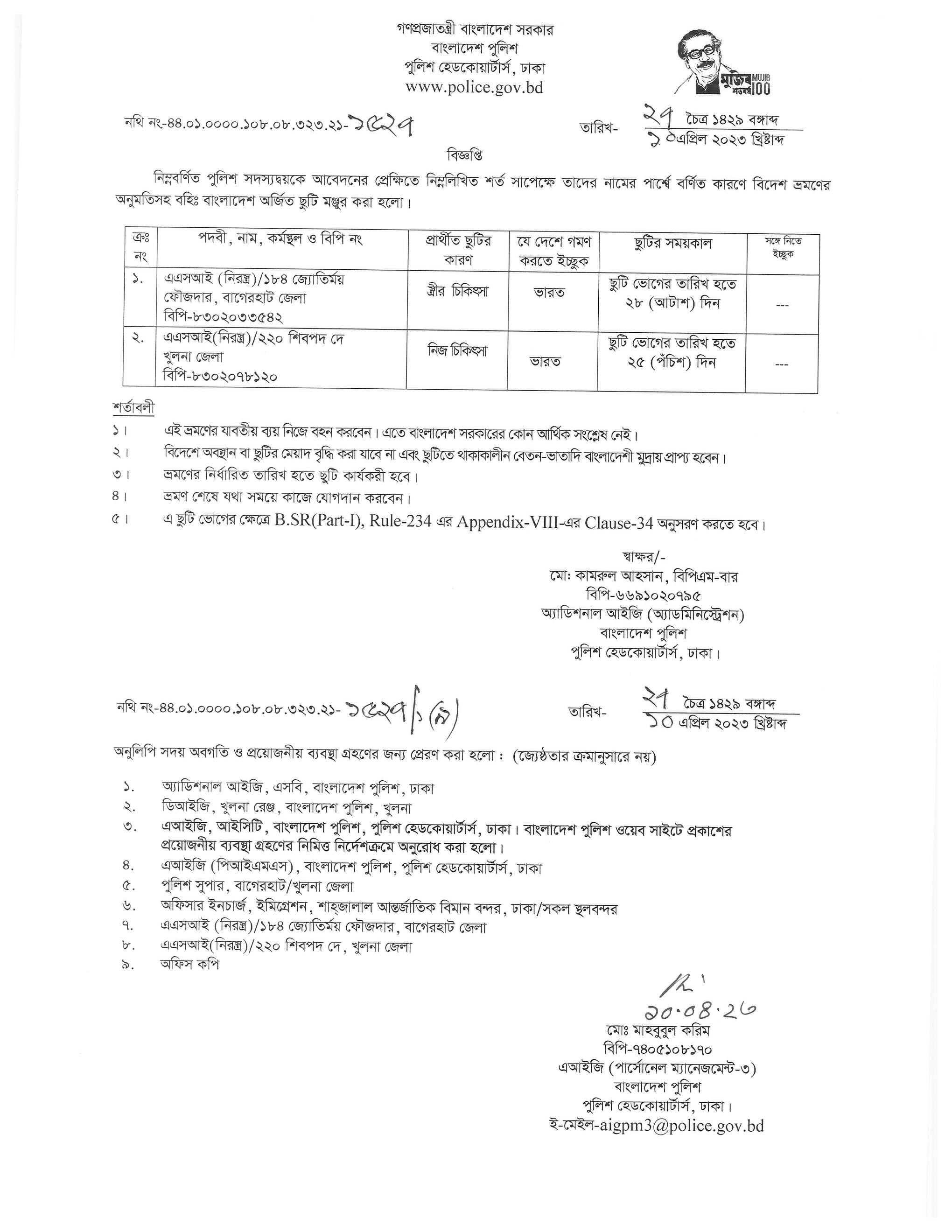 বহিঃ বাংলাদেশ ছুটি, বিজ্ঞপ্তি নং- ১৫২০, তারিখঃ ১০/০৪/২০২৩ খ্রিঃ।