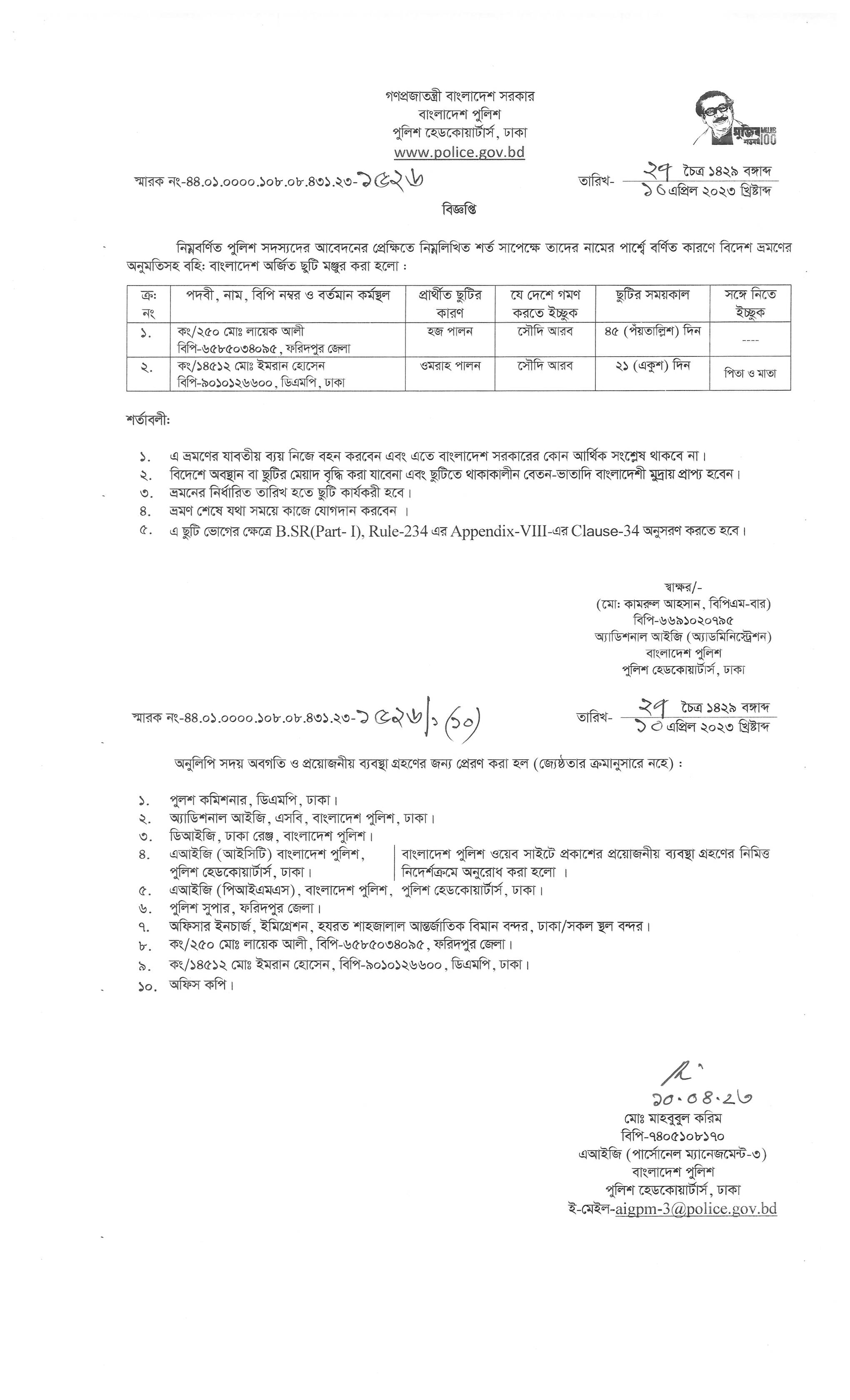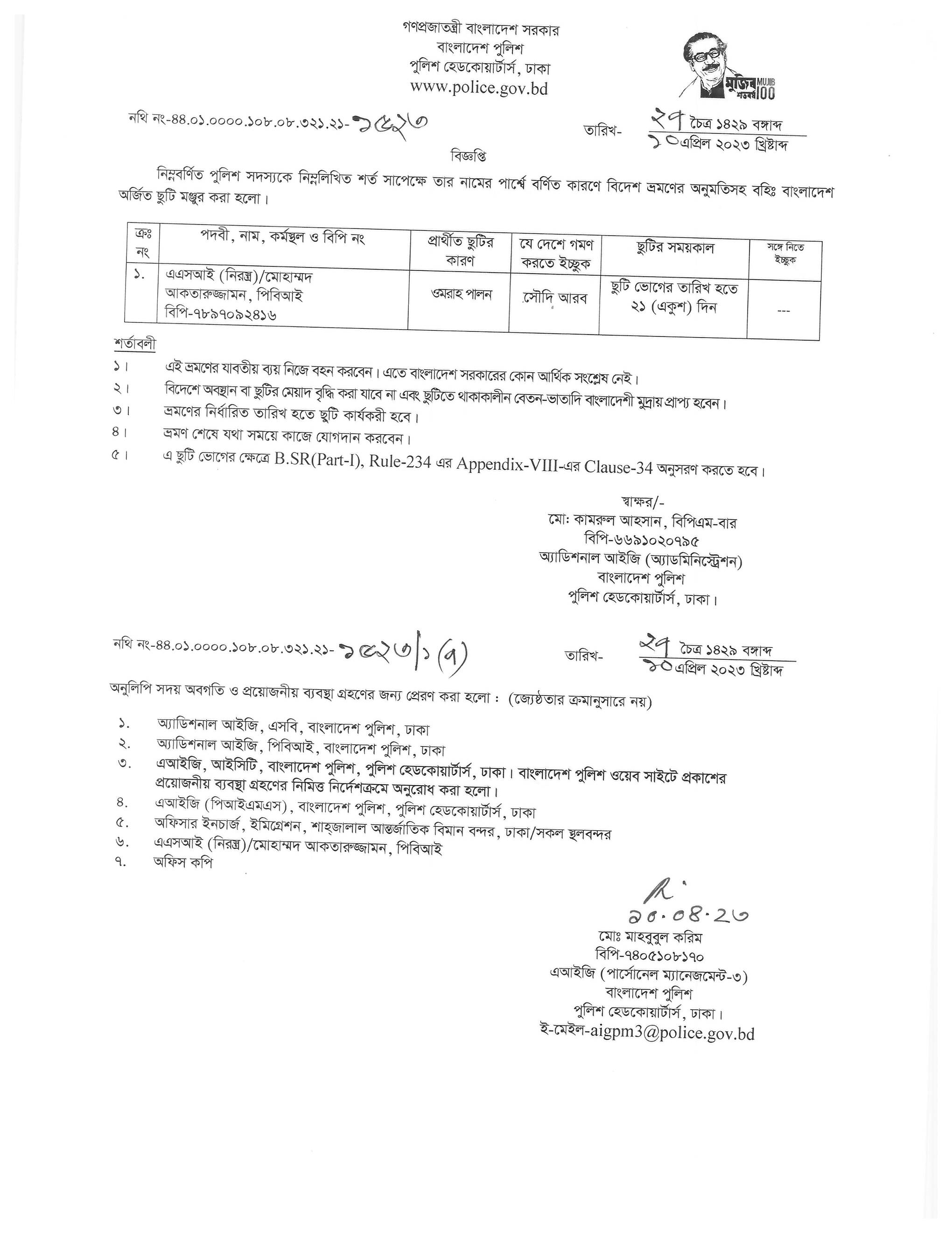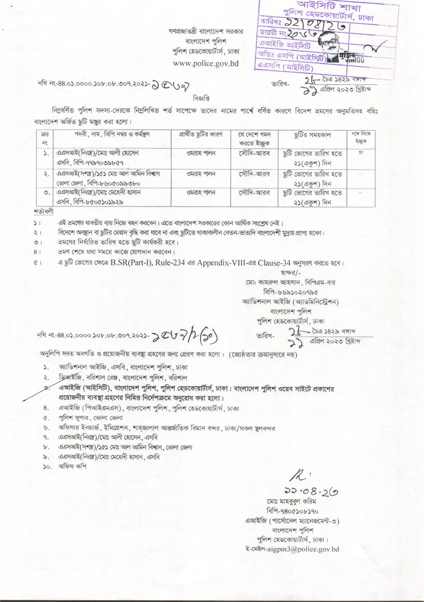 বহিঃ বাংলাদেশ ছুটি, বিজ্ঞপ্তি নং-১৫২৩, তারিখঃ ১০/০৪/২০২৩