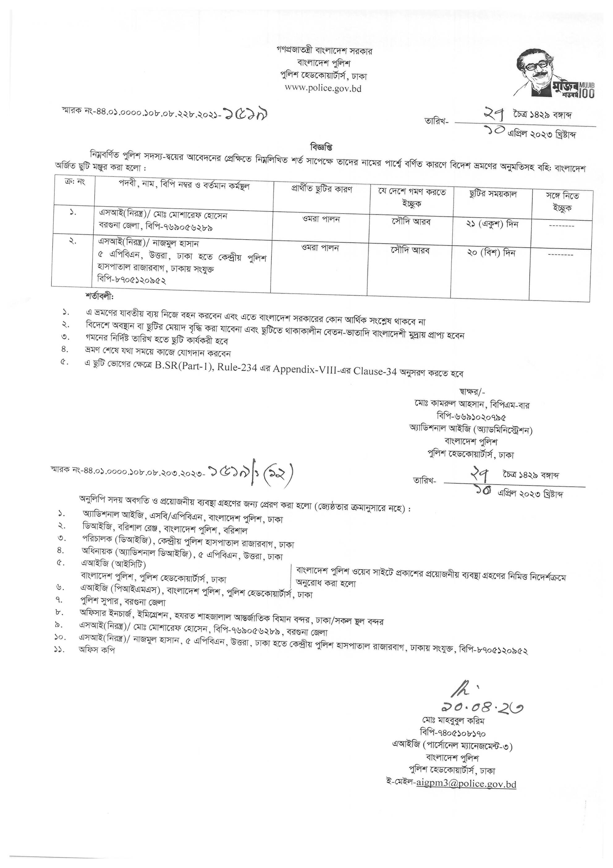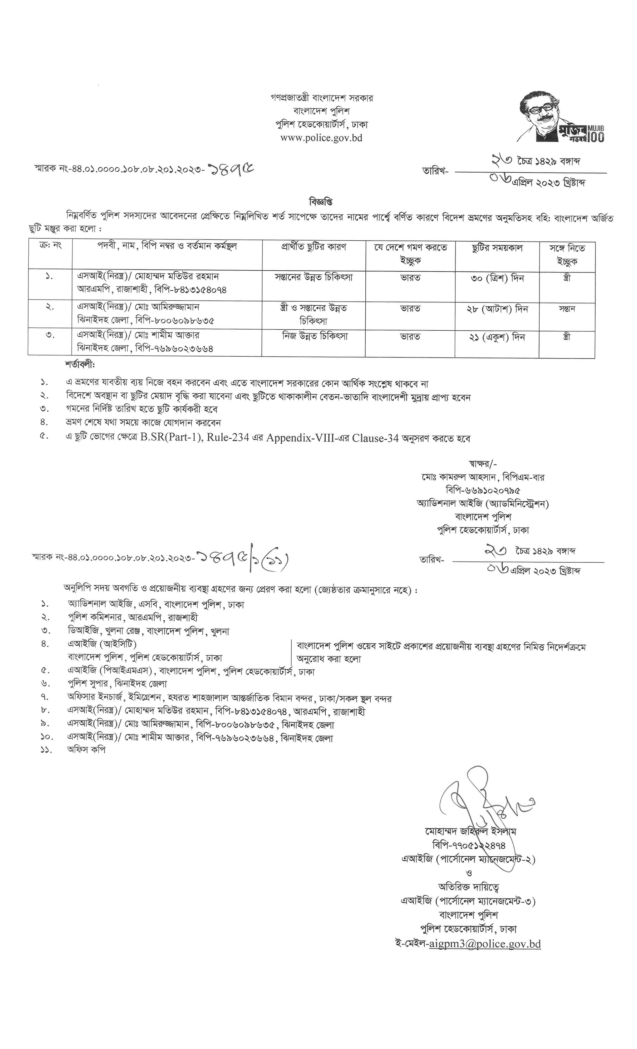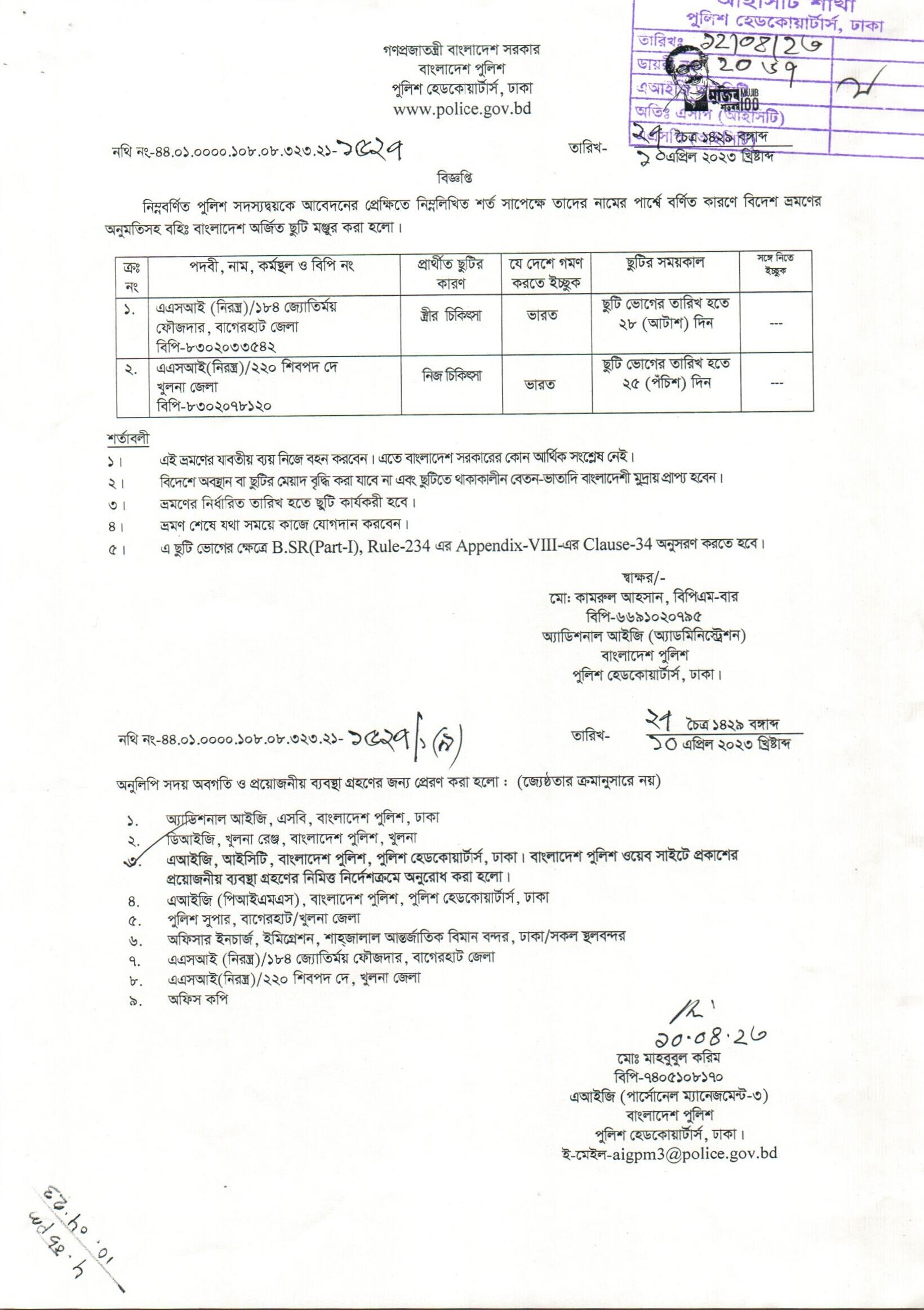 বহিঃ বাংলাদেশ ছুটি, বিজ্ঞপ্তি নং-১৫২৩, তারিখঃ ১০/০৪/২০২৩