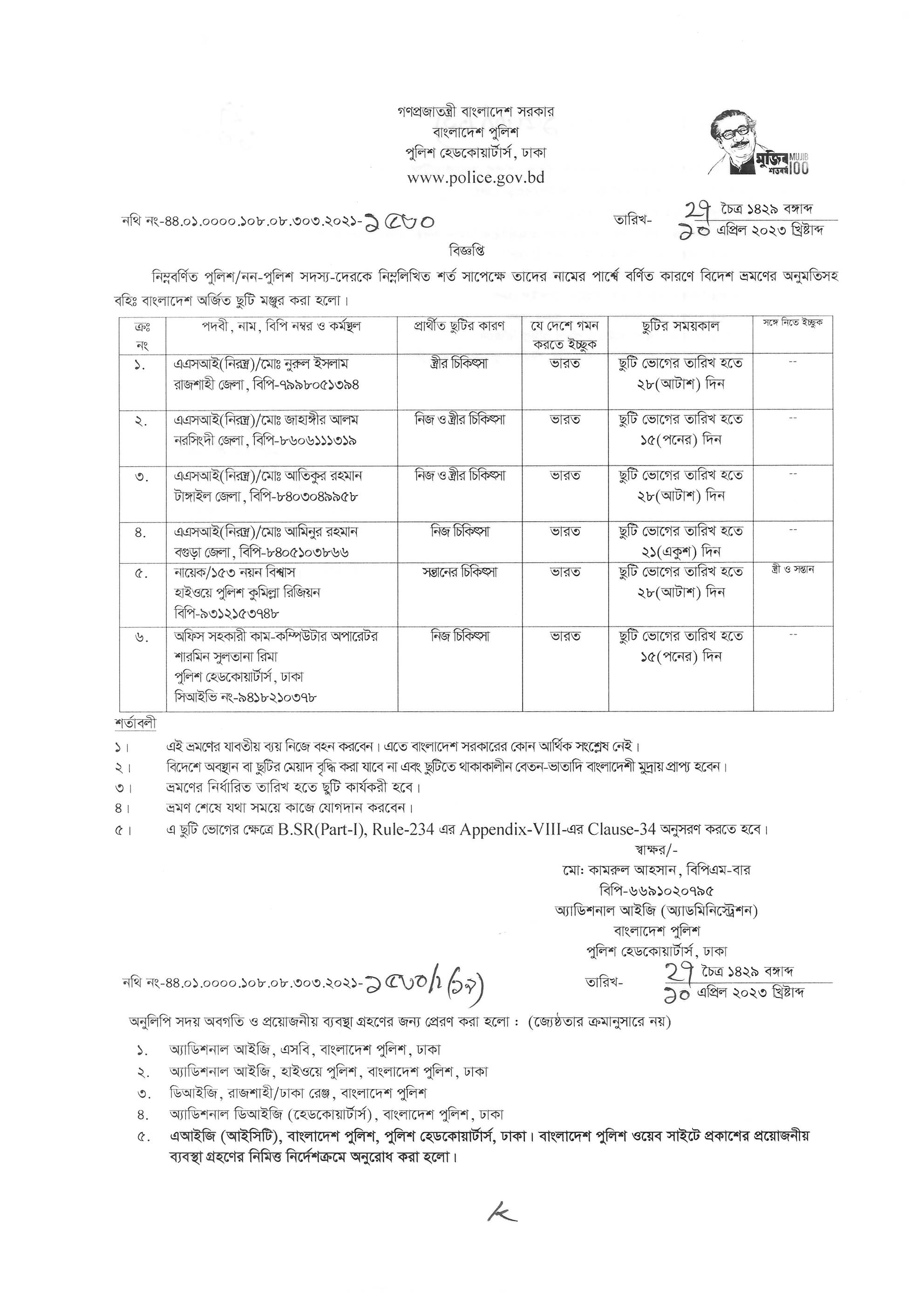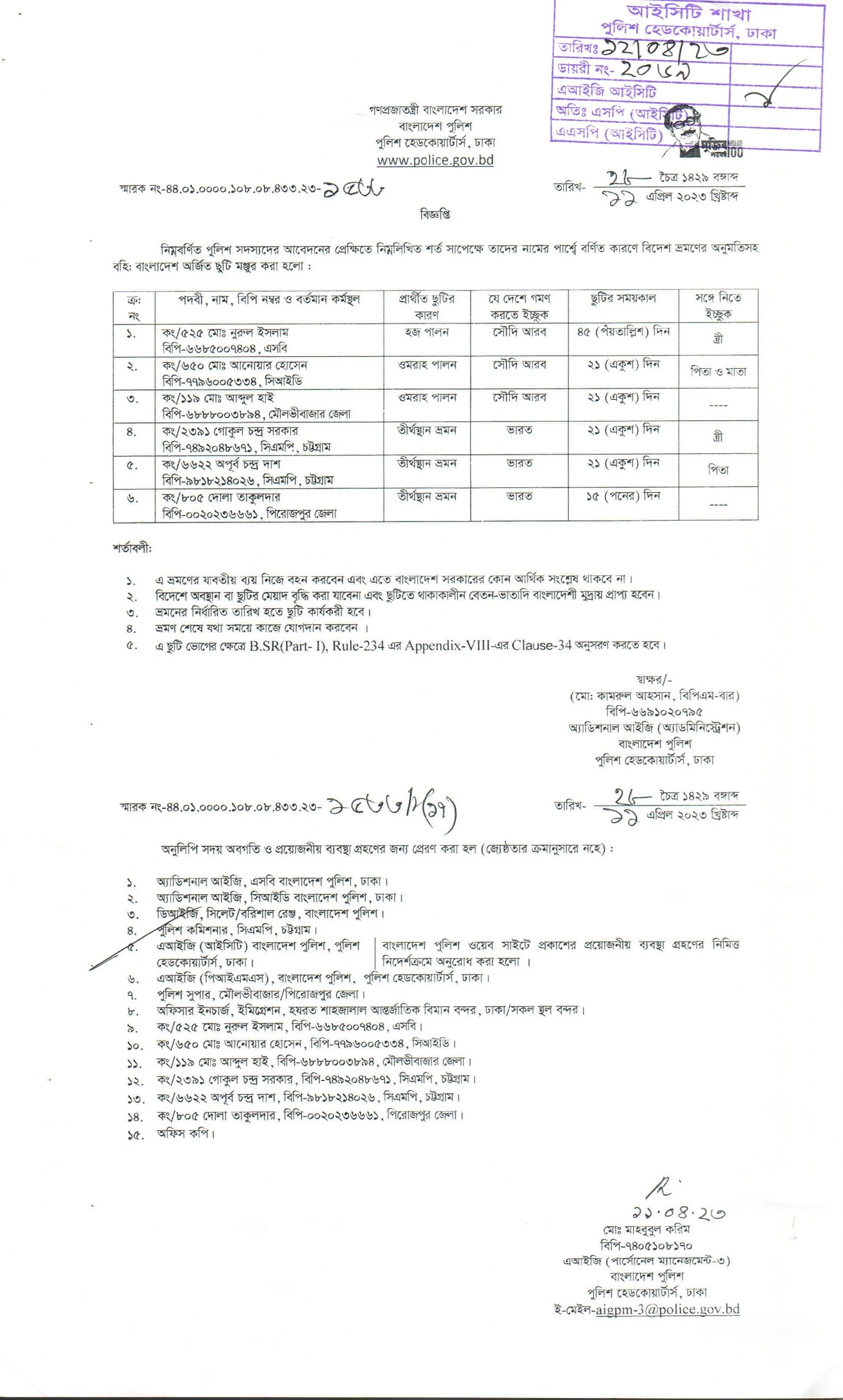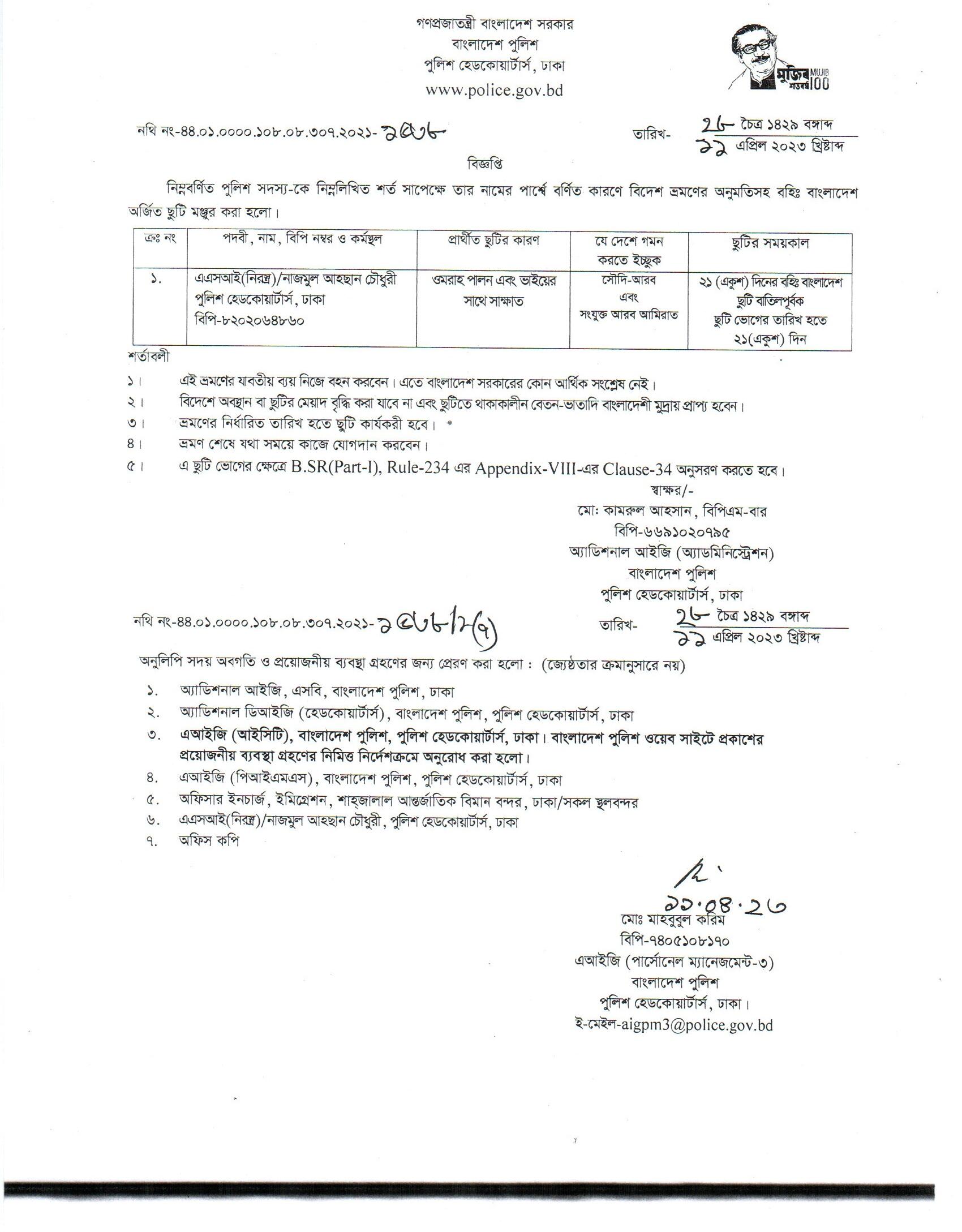 বহিঃ বাংলাদেশ ছুটি, বিজ্ঞপ্তি নং-১৪৮৭, তারিখঃ ০৬/০৪/২০২৩