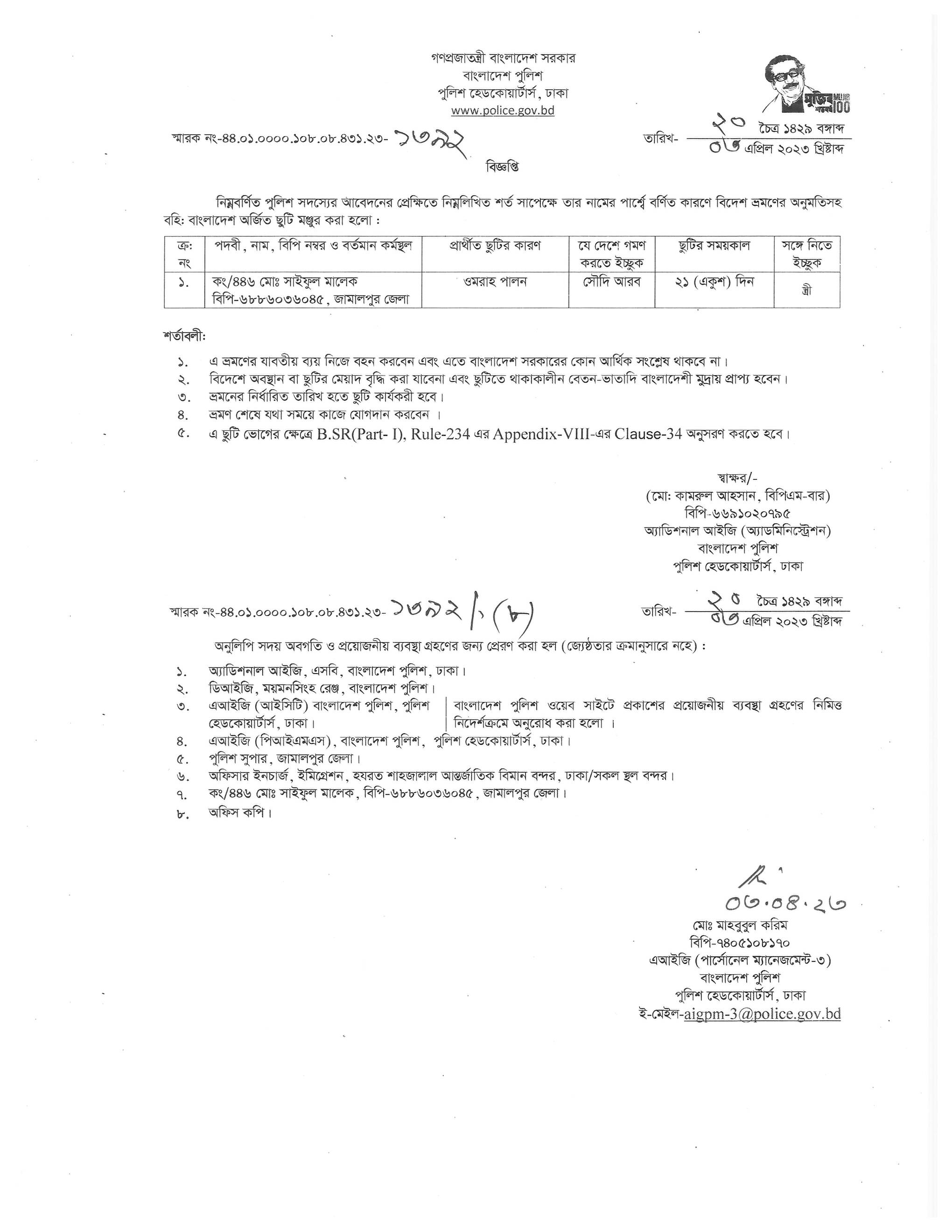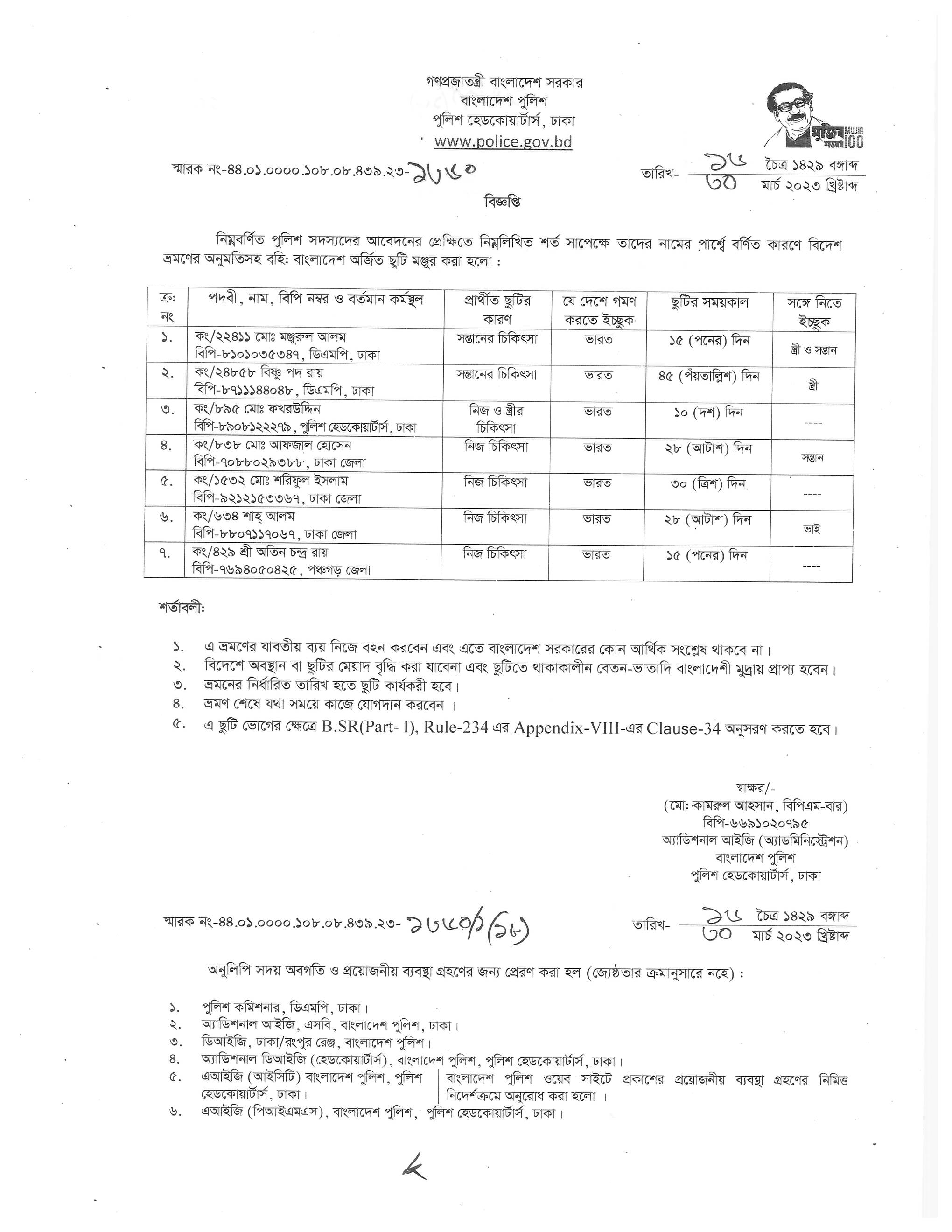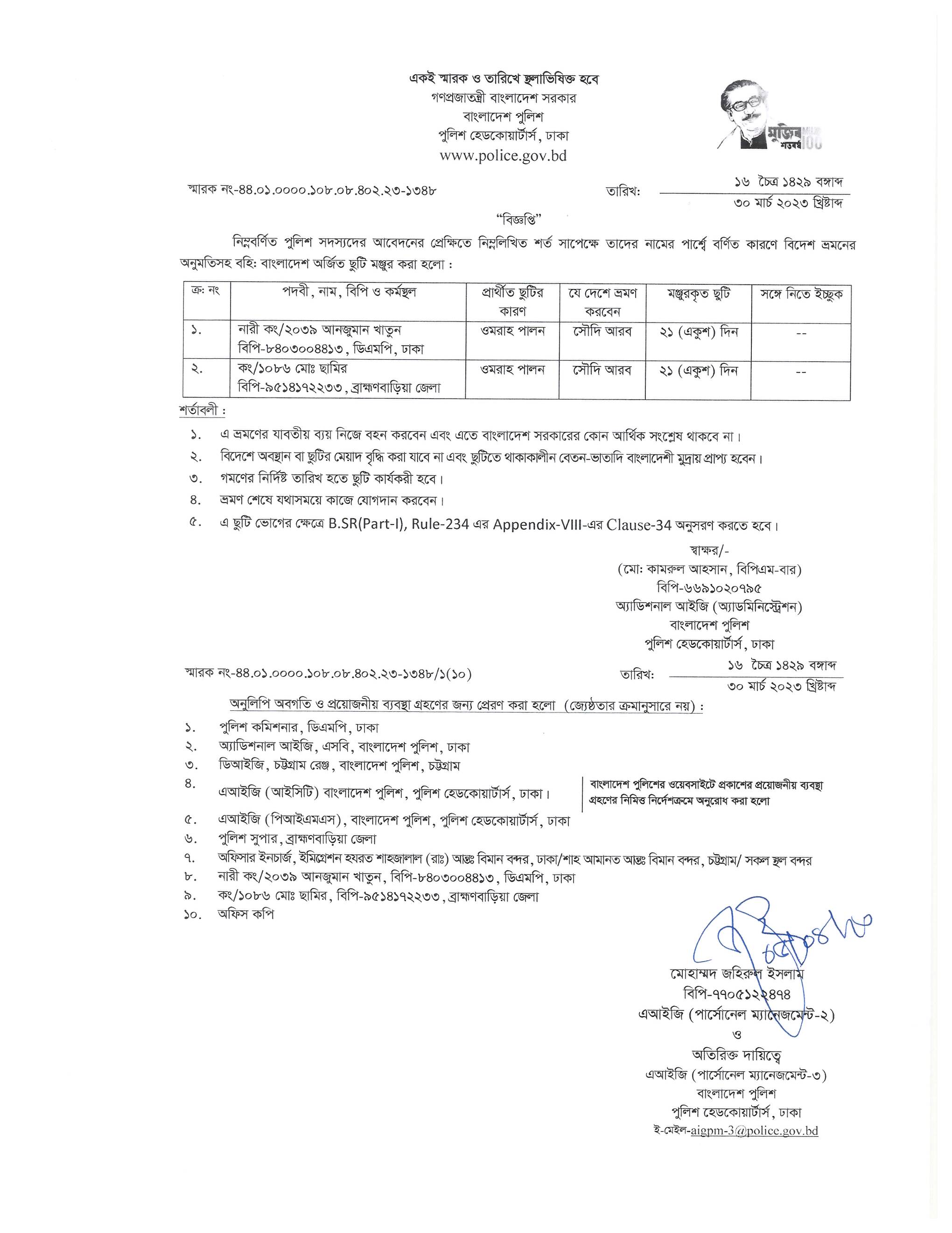 বহিঃ বাংলাদেশ ছুটি, বিজ্ঞপ্তি নং-১৩৫২, তারিখঃ ৩০/০৩/২০২৩