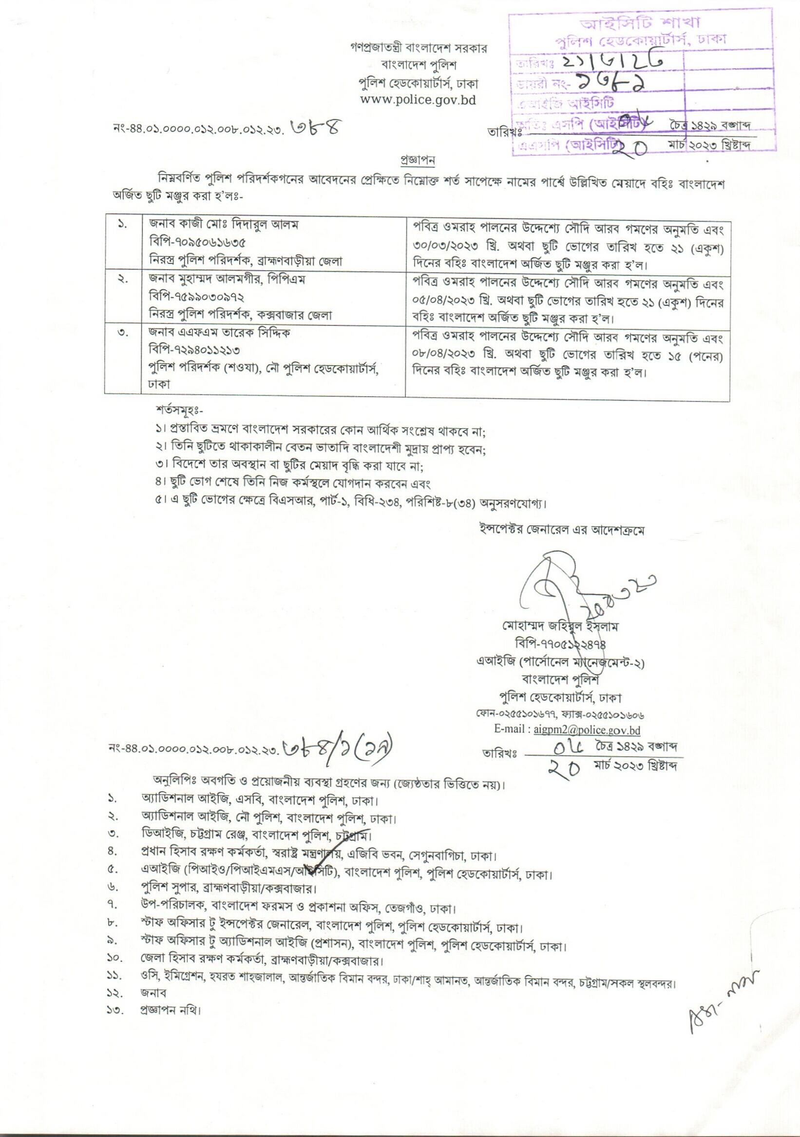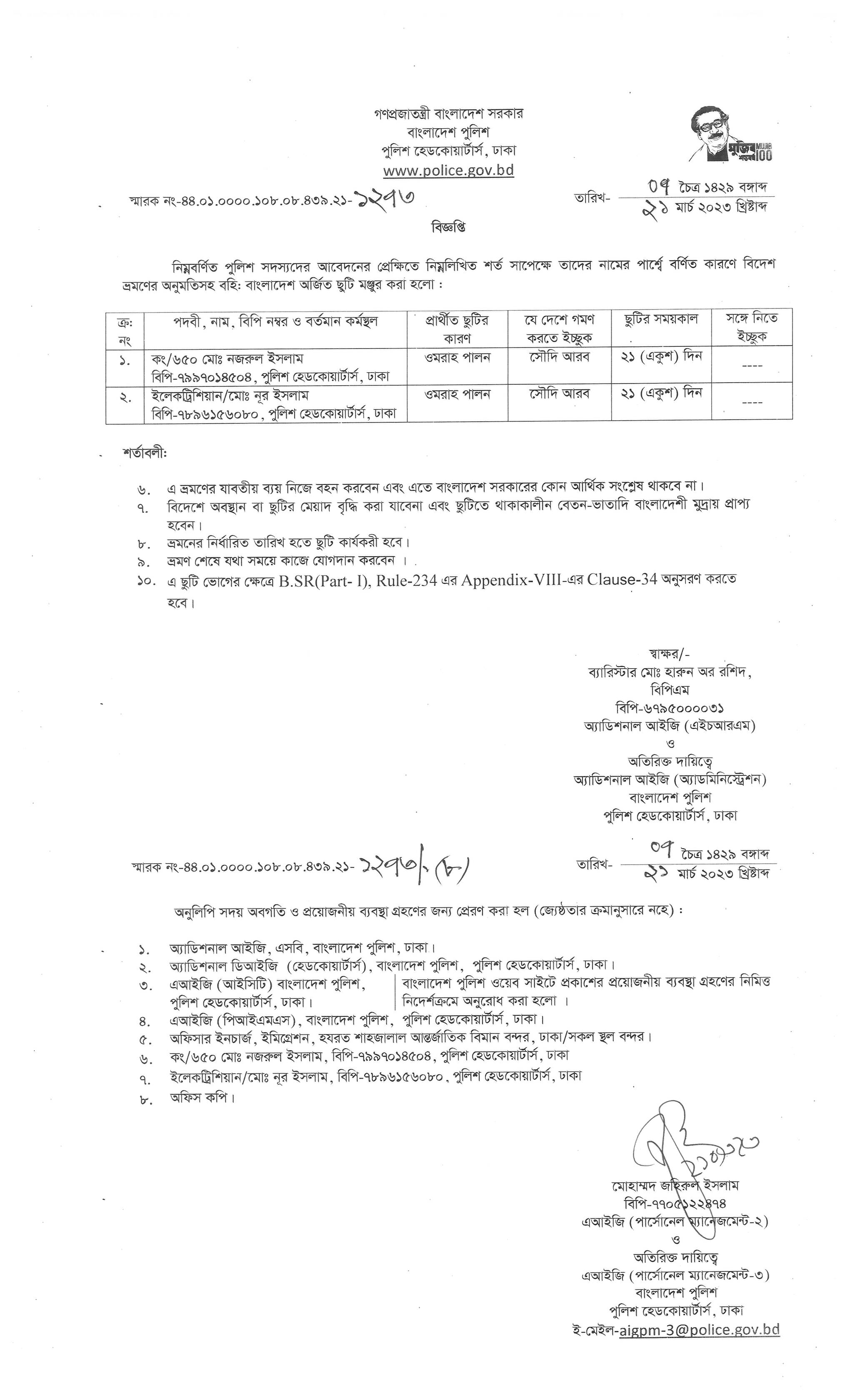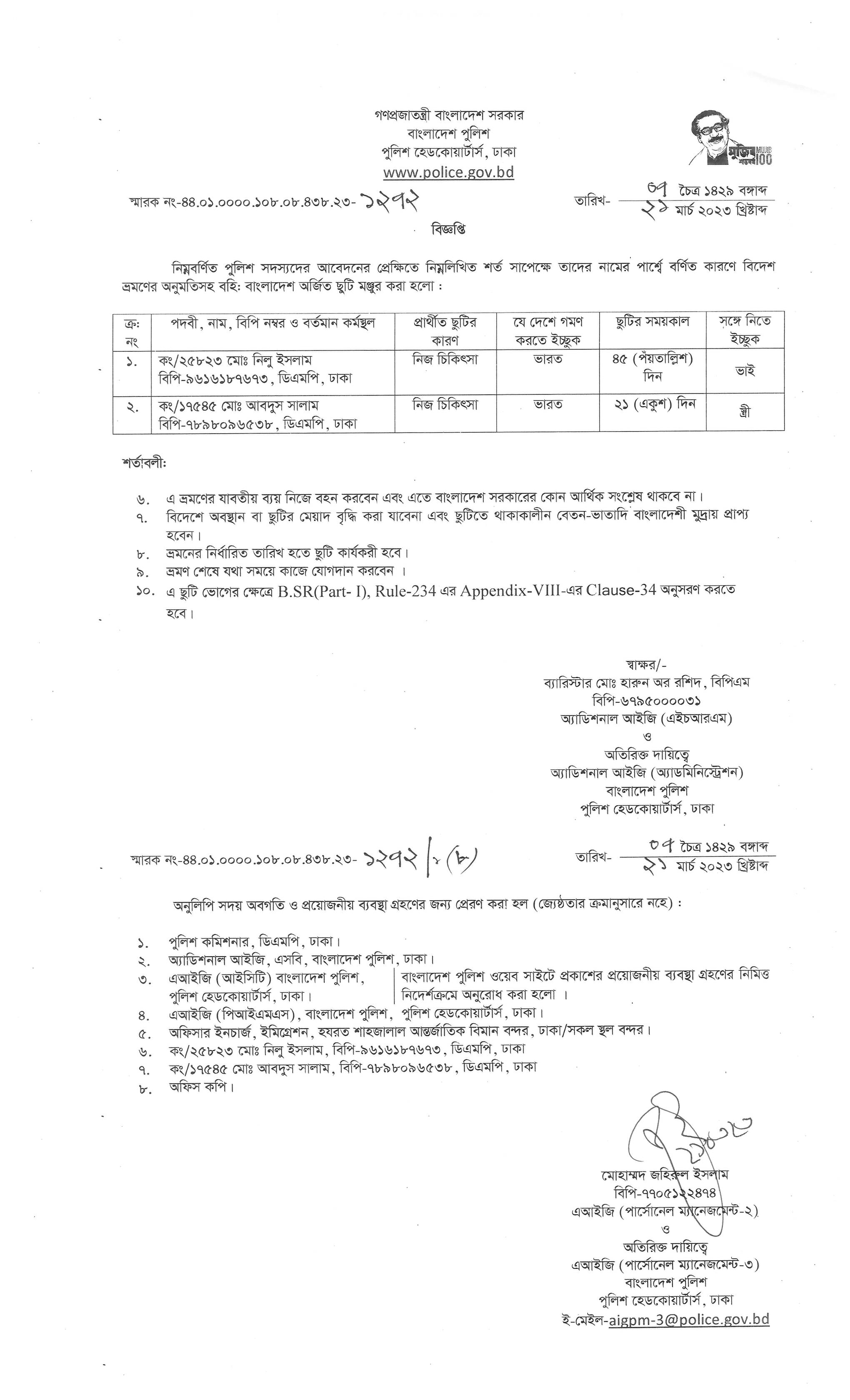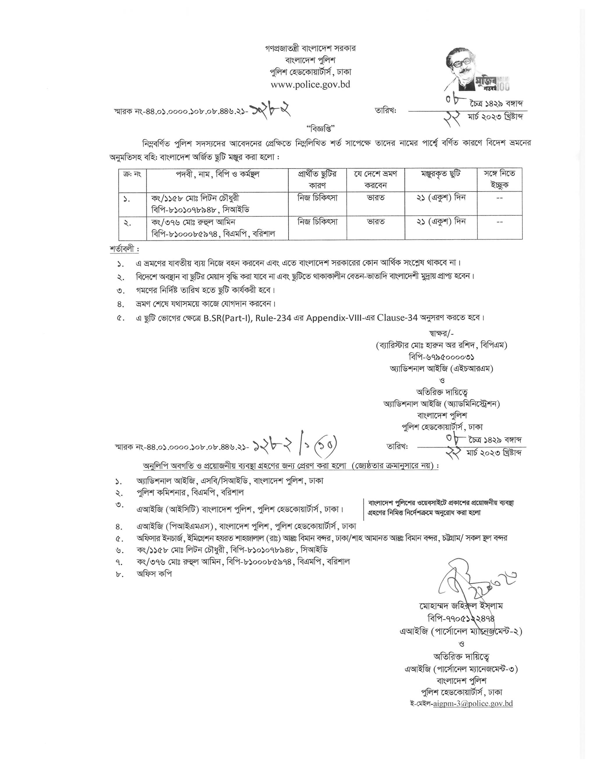 বহিঃ বাংলাদেশ ছুটি, বিজ্ঞপ্তি নং-১২৭৫, তারিখঃ ২১/০৩/২০২৩