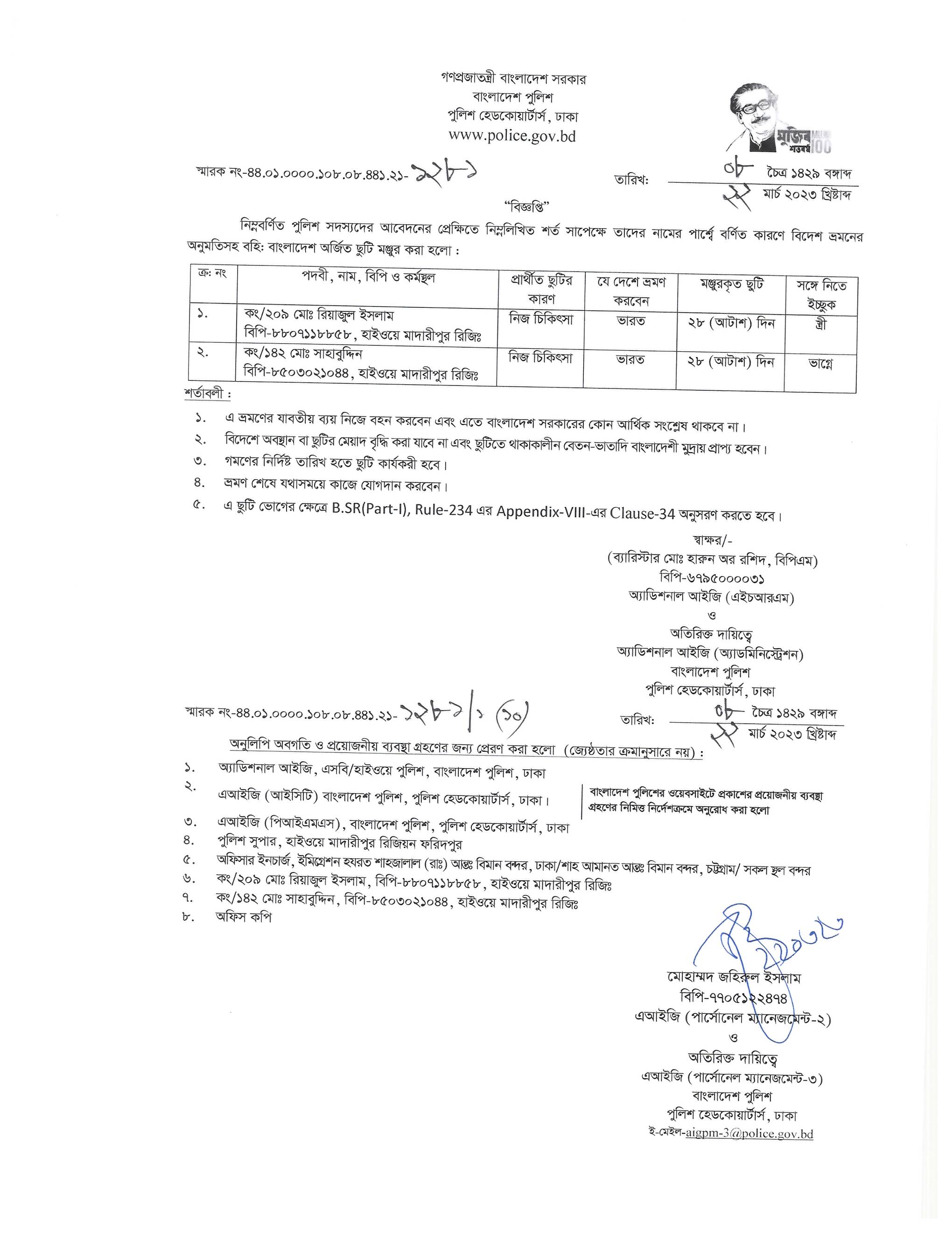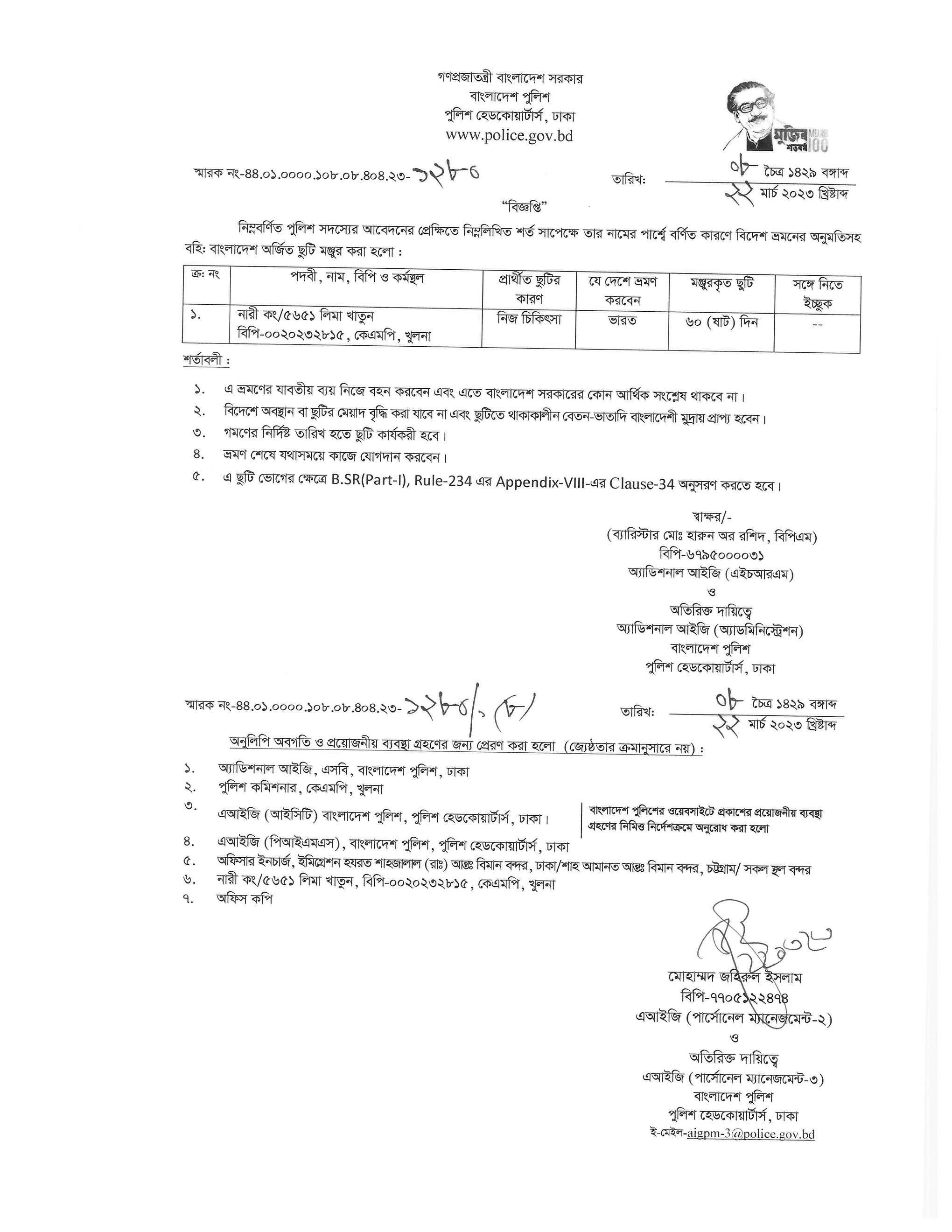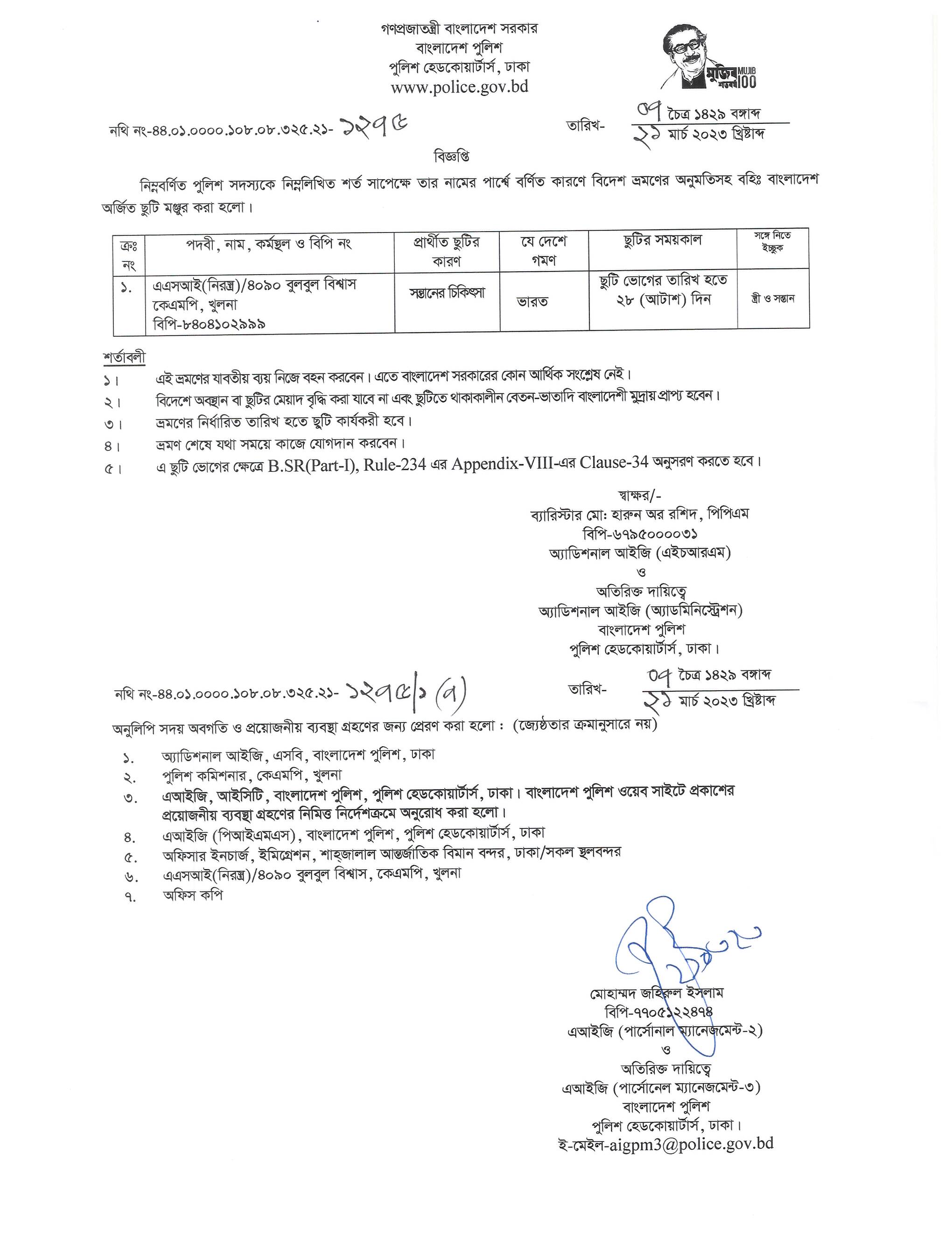 বহিঃ বাংলাদেশ ছুটি, বিজ্ঞপ্তি নং-১২৮৬, তারিখঃ ২৩/০৩/২০২৩