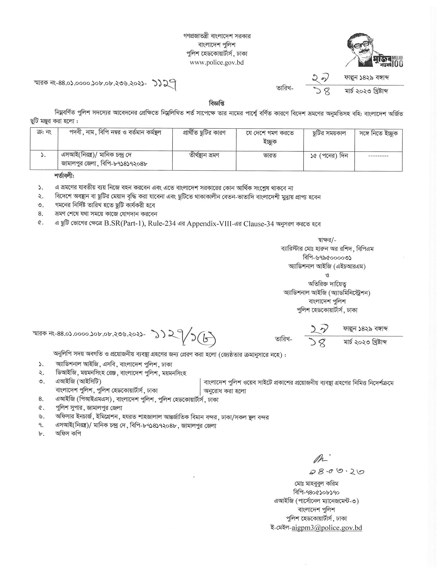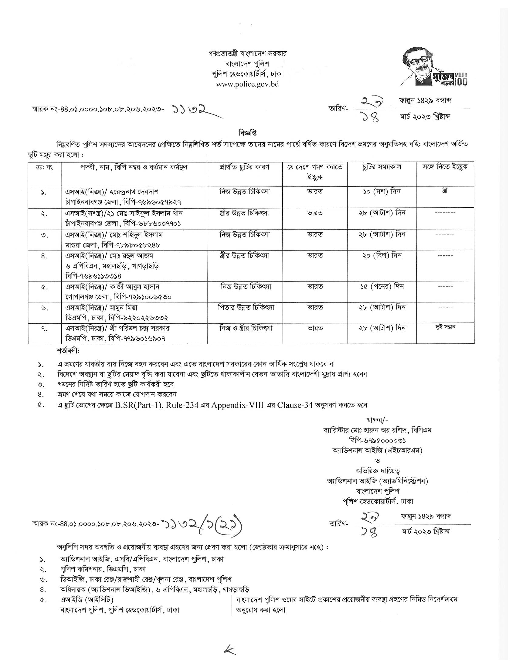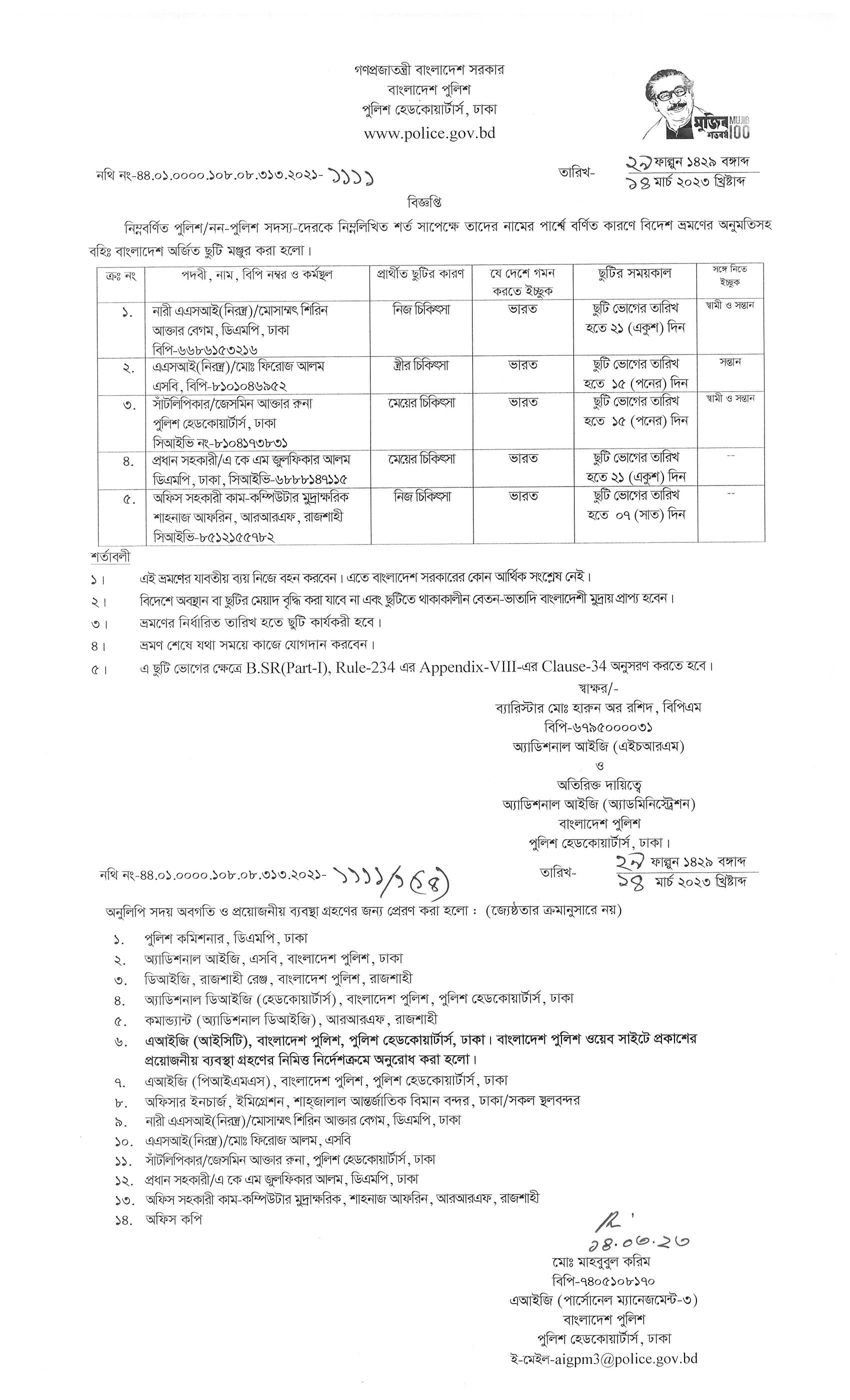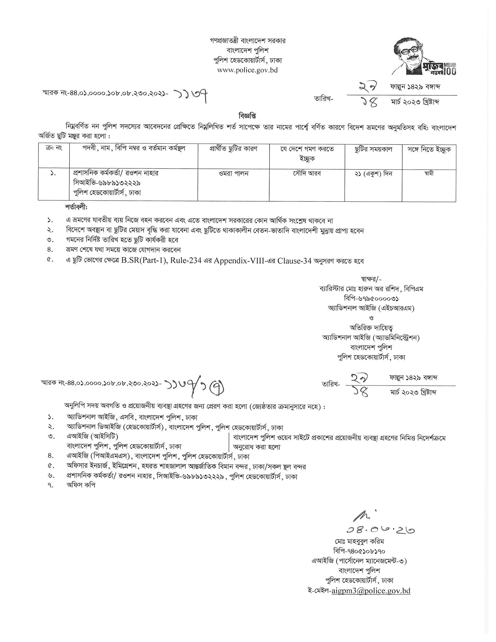 বহিঃ বাংলাদেশ ছুটি, বিজ্ঞপ্তি নং-১১৩২, তারিখঃ ১৪/০৩/২০২৩