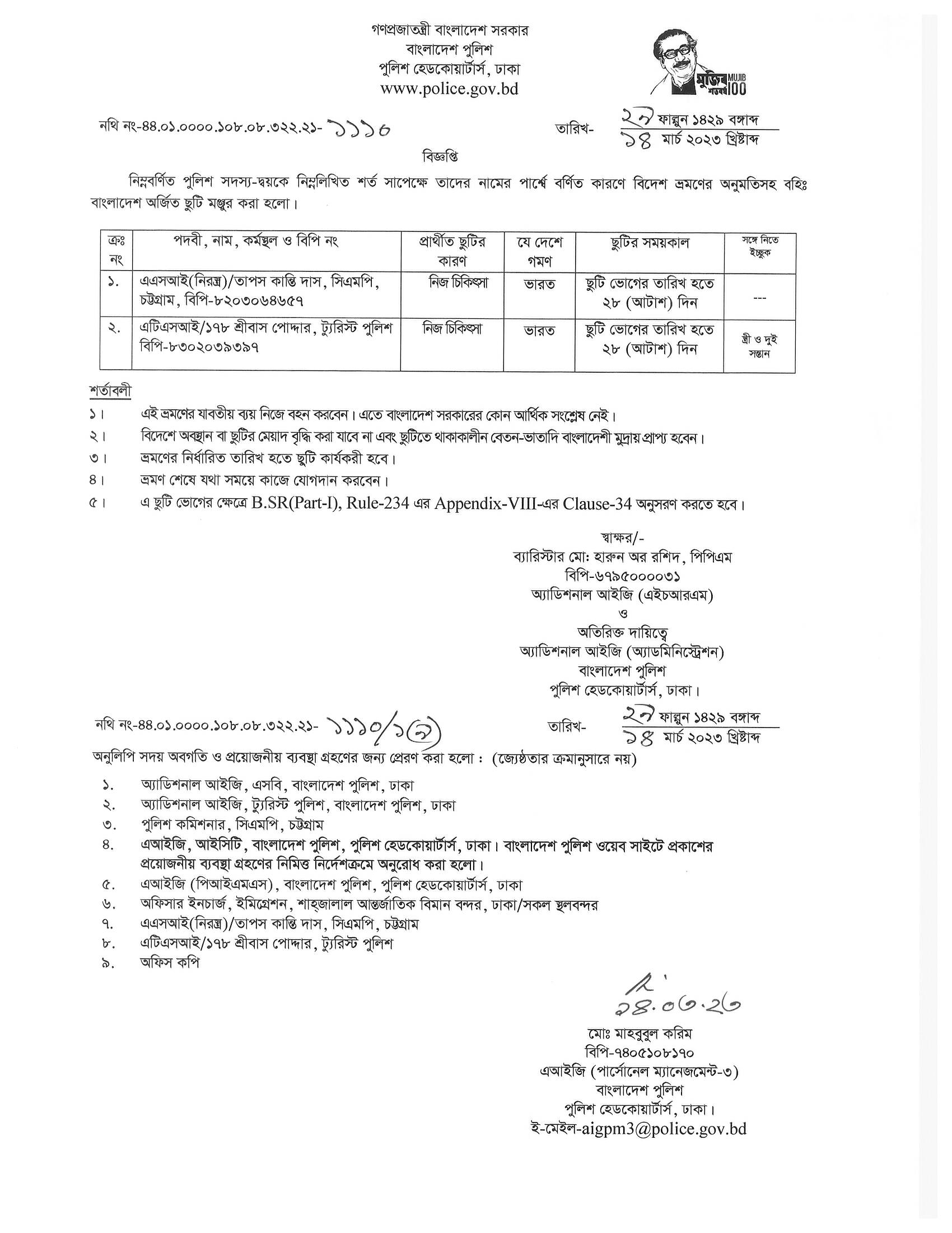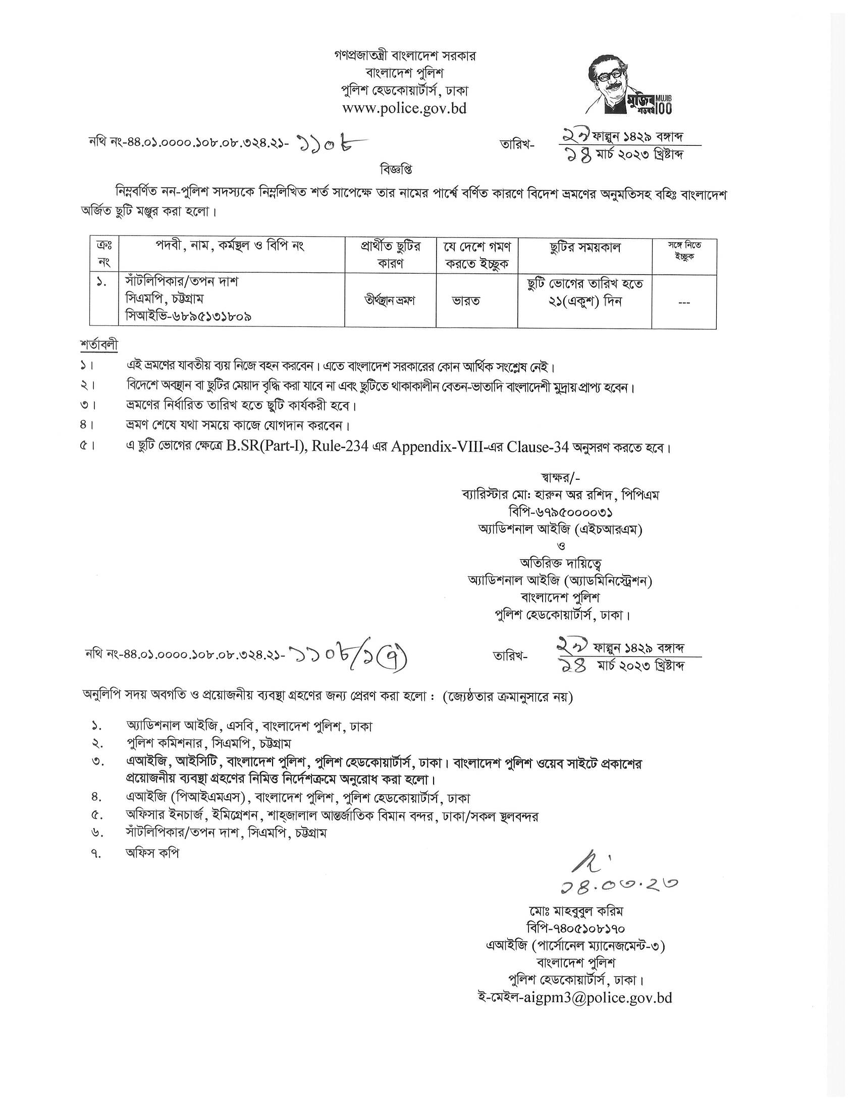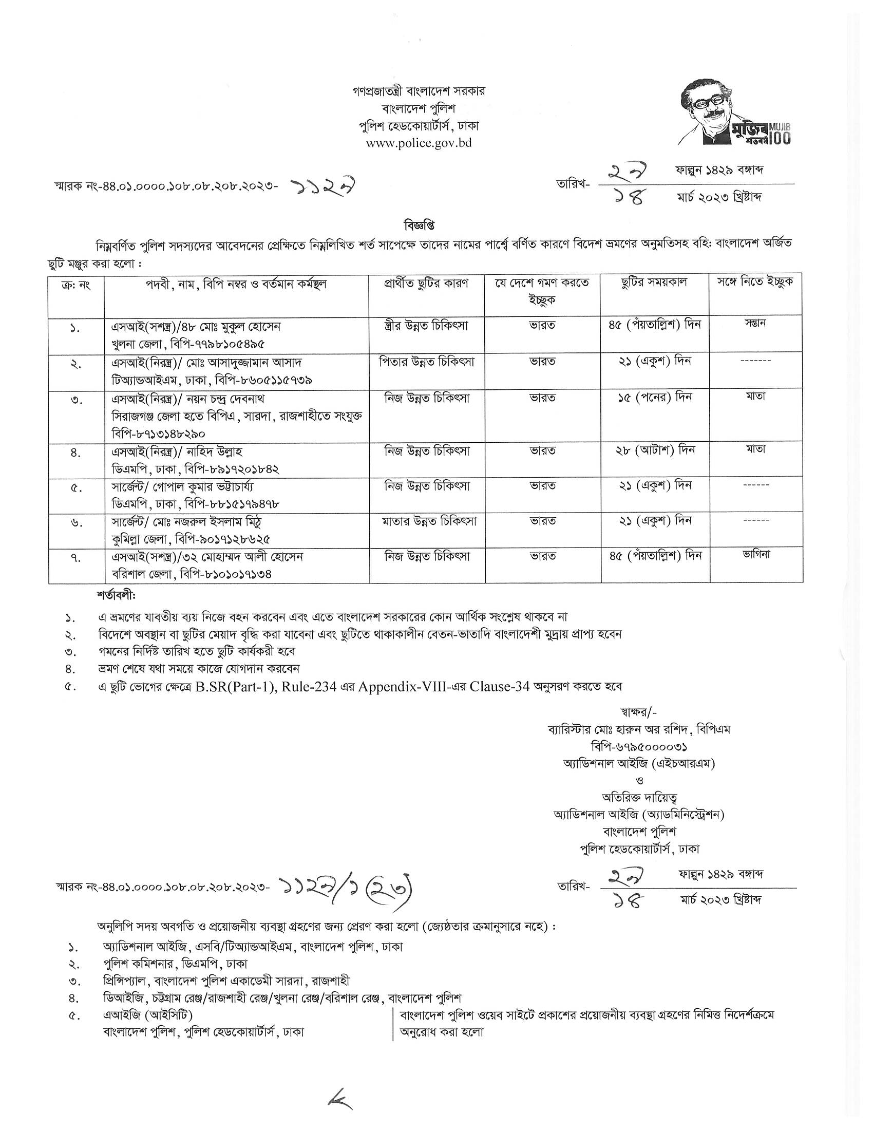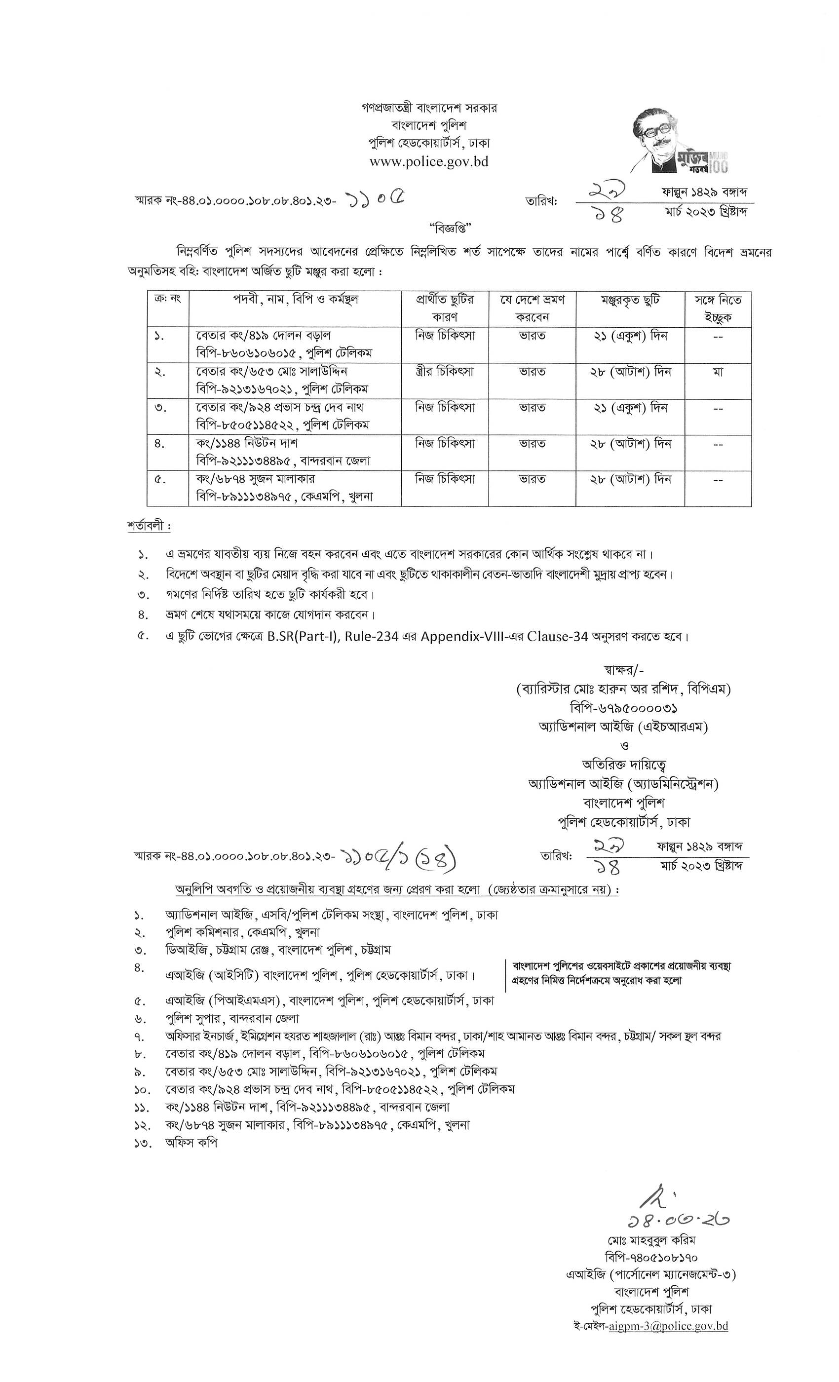 বহিঃ বাংলাদেশ ছুটি, বিজ্ঞপ্তি নং-১১৩২, তারিখঃ ১৪/০৩/২০২৩