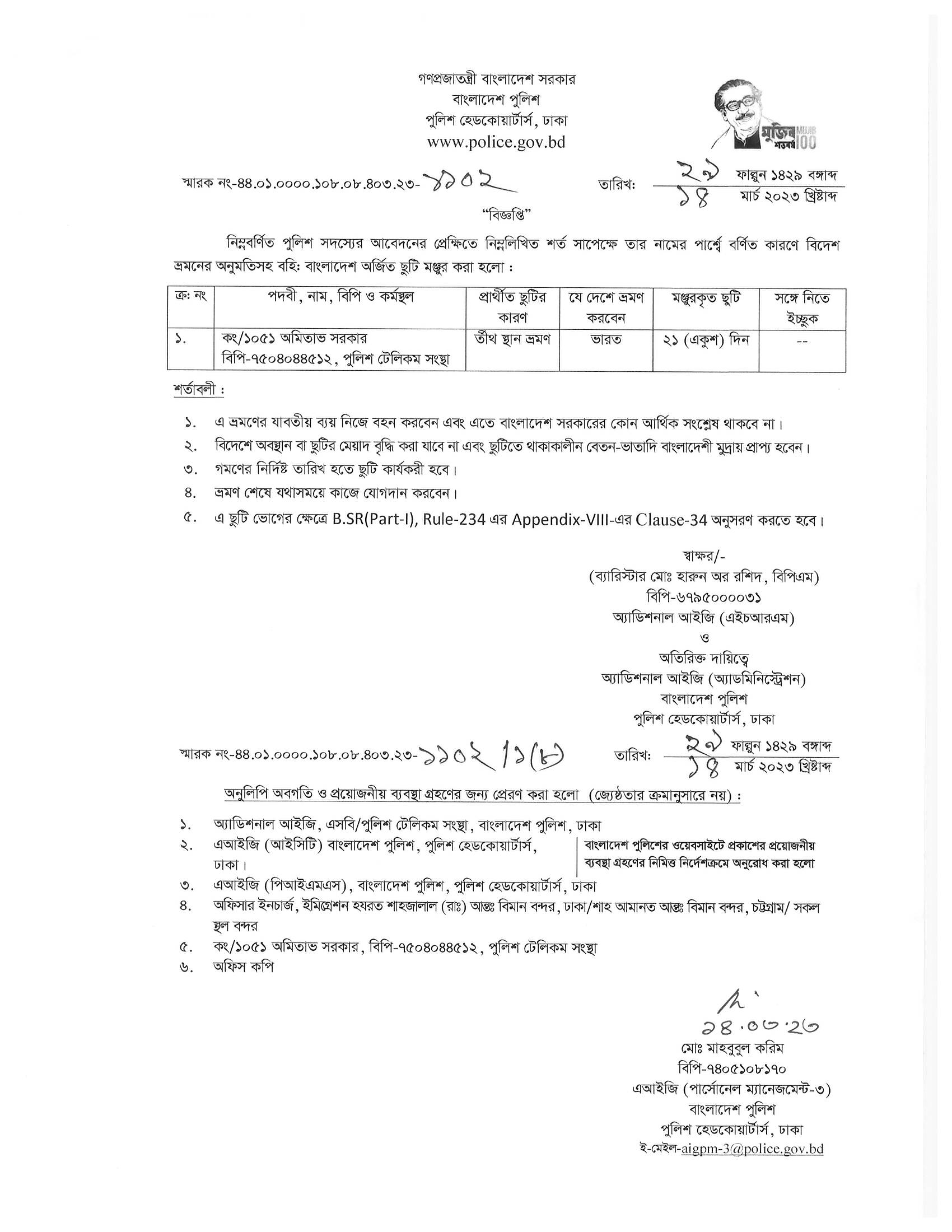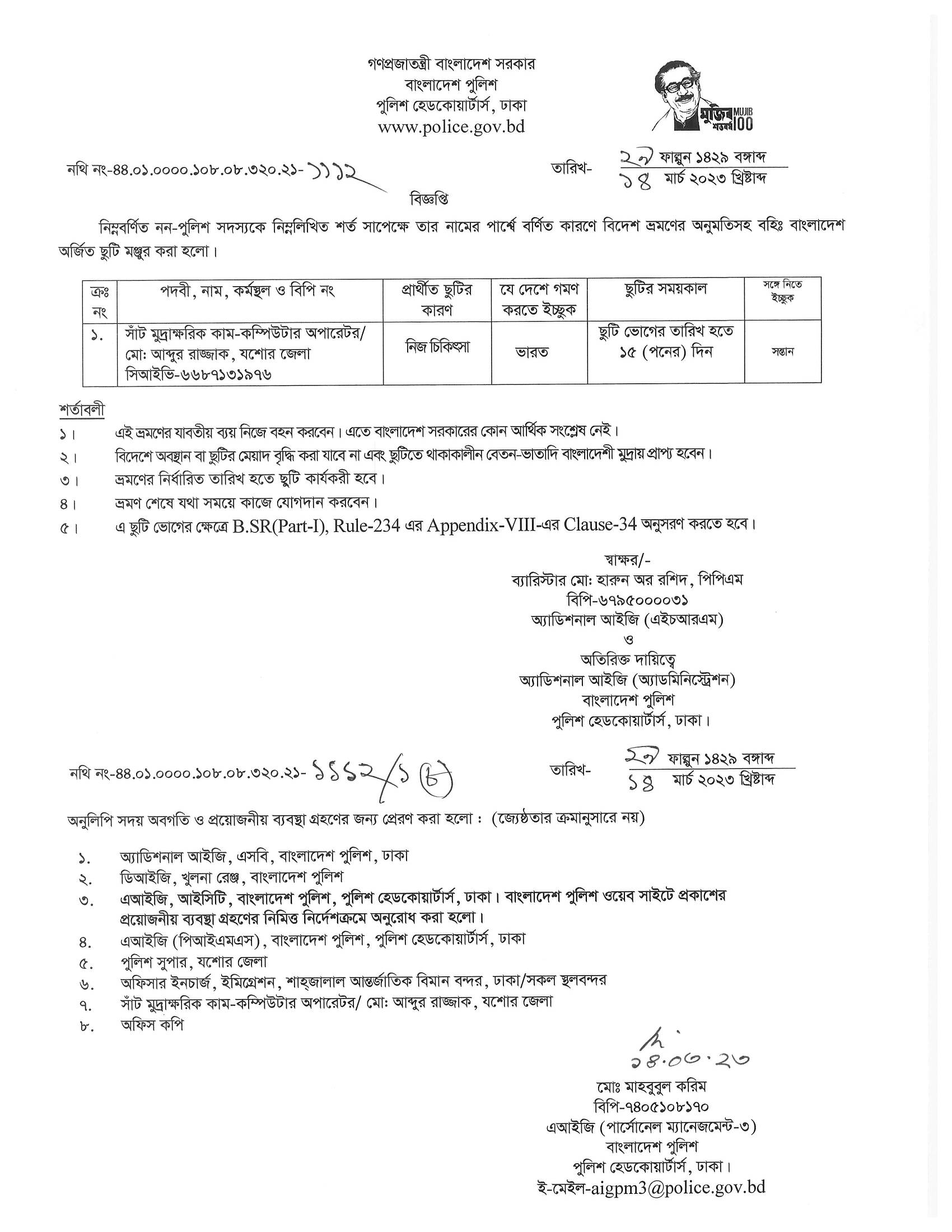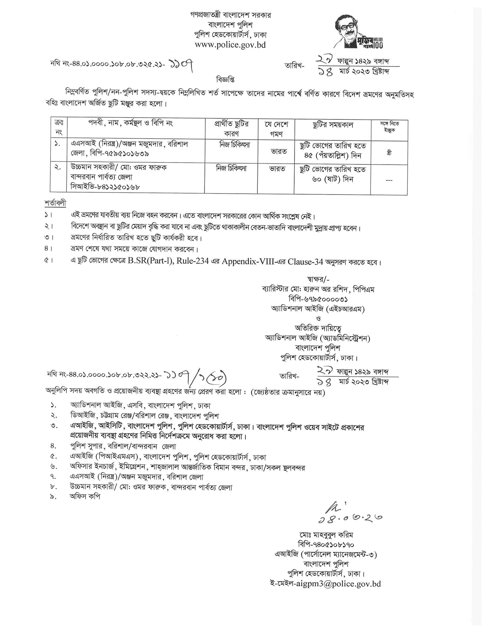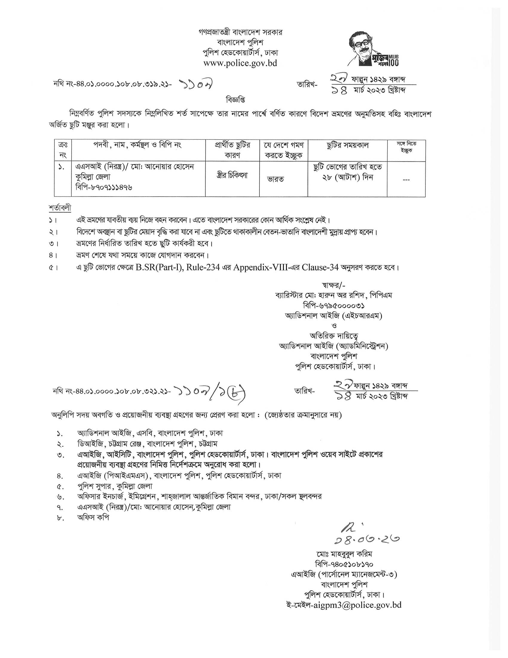 বহিঃ বাংলাদেশ ছুটি, বিজ্ঞপ্তি নং-১১৩২, তারিখঃ ১৪/০৩/২০২৩