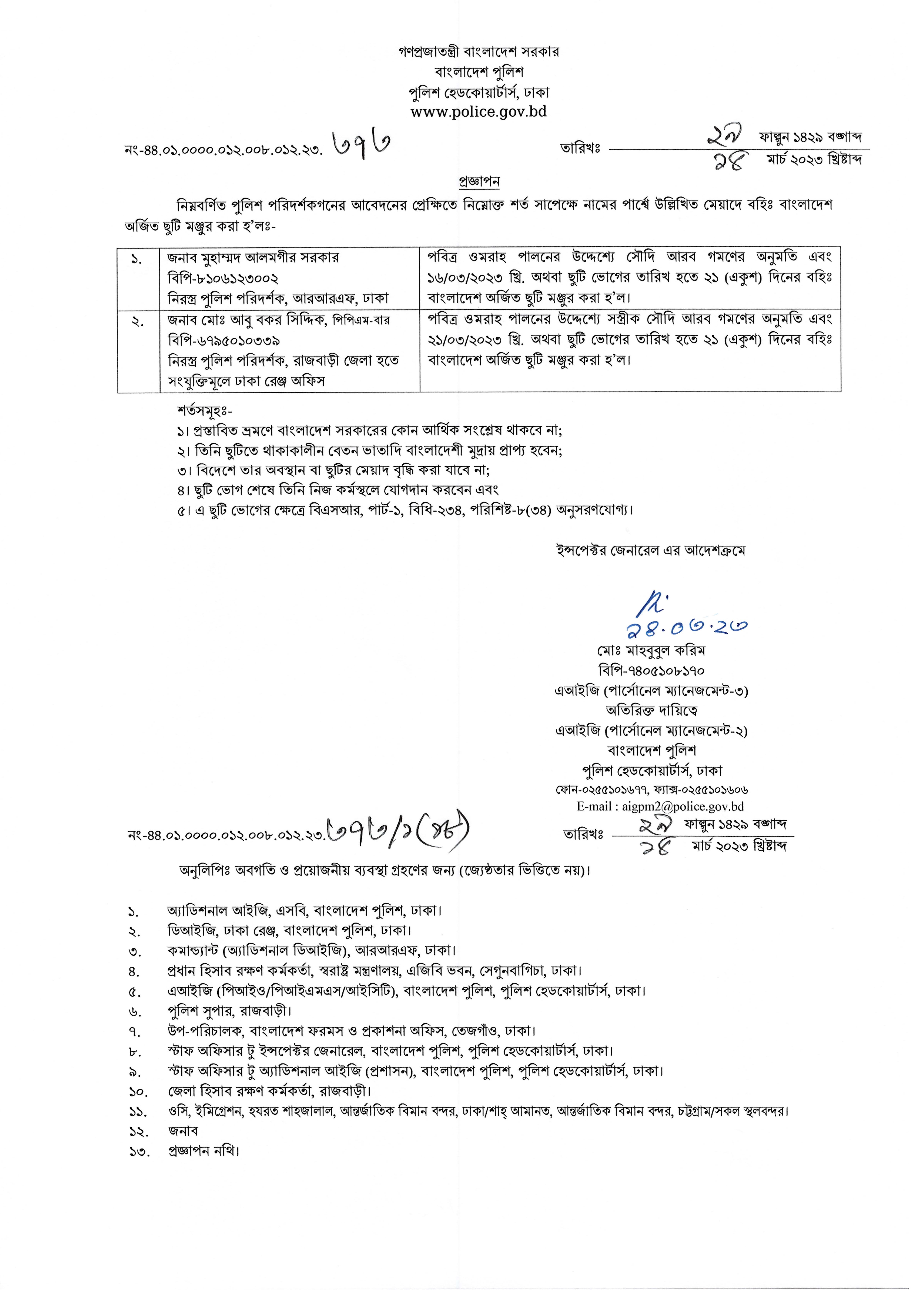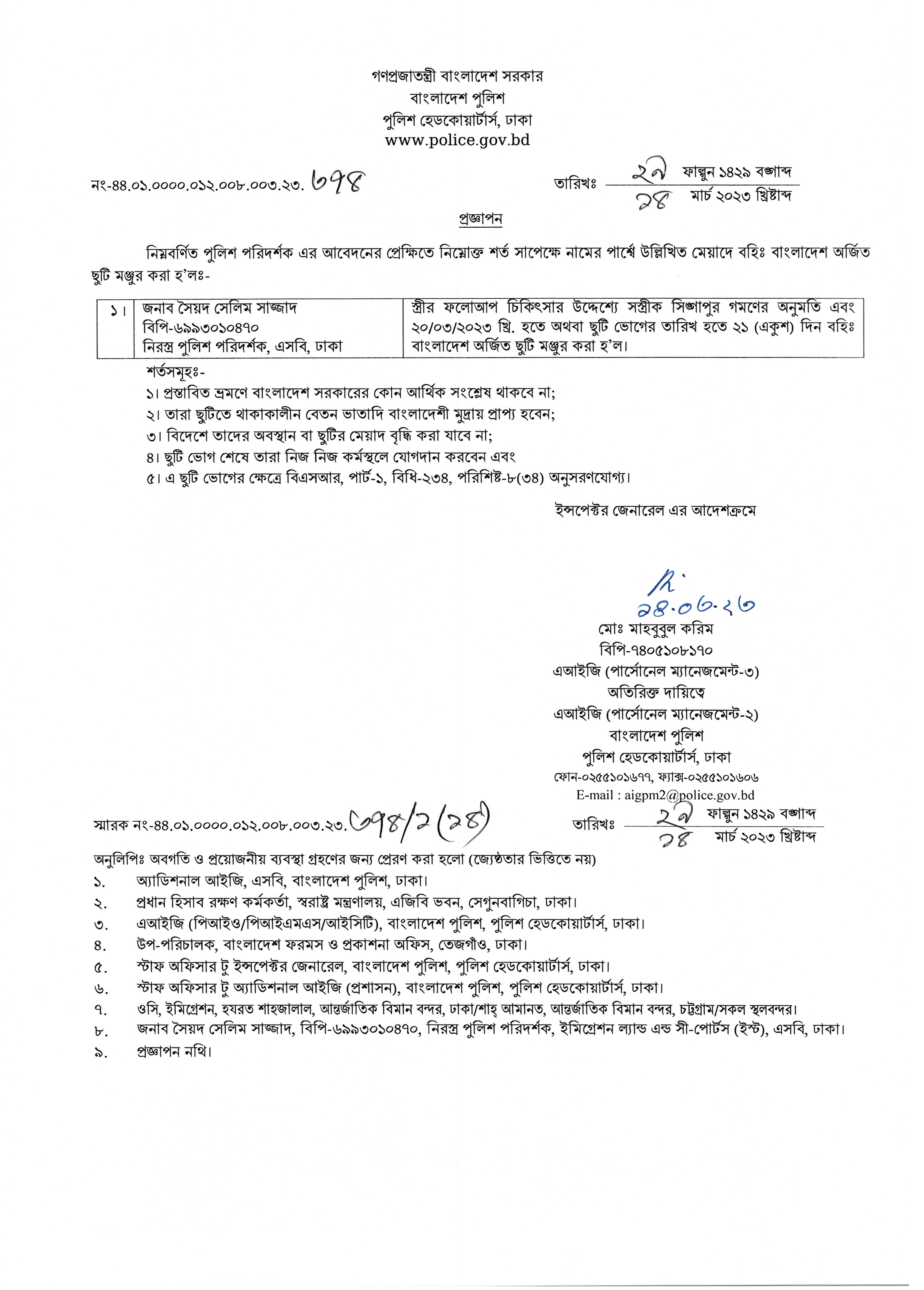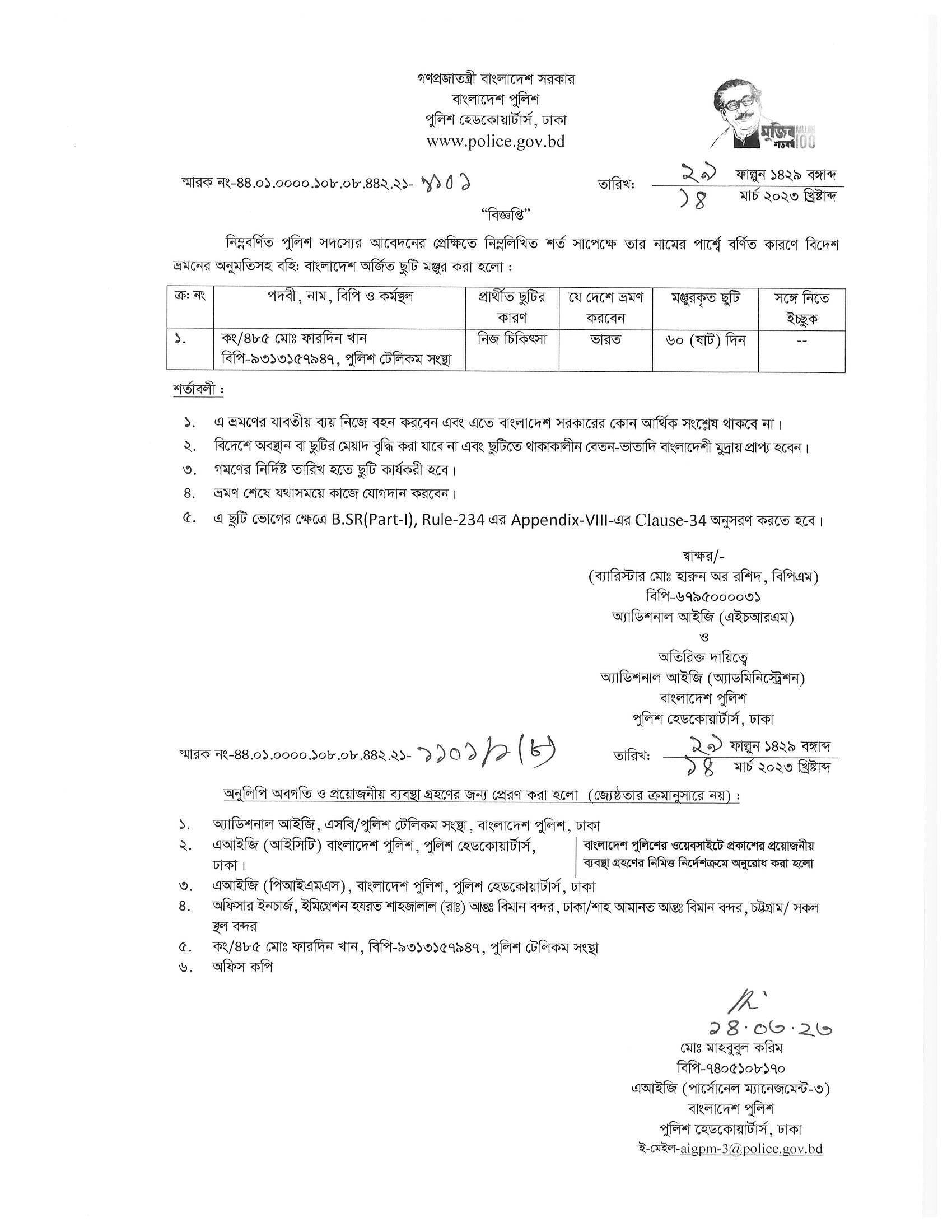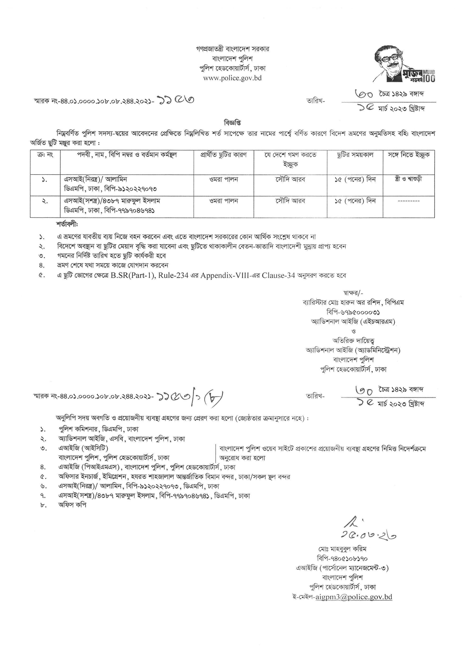 বহিঃ বাংলাদেশ ছুটি, বিজ্ঞপ্তি নং-১১৩২, তারিখঃ ১৪/০৩/২০২৩