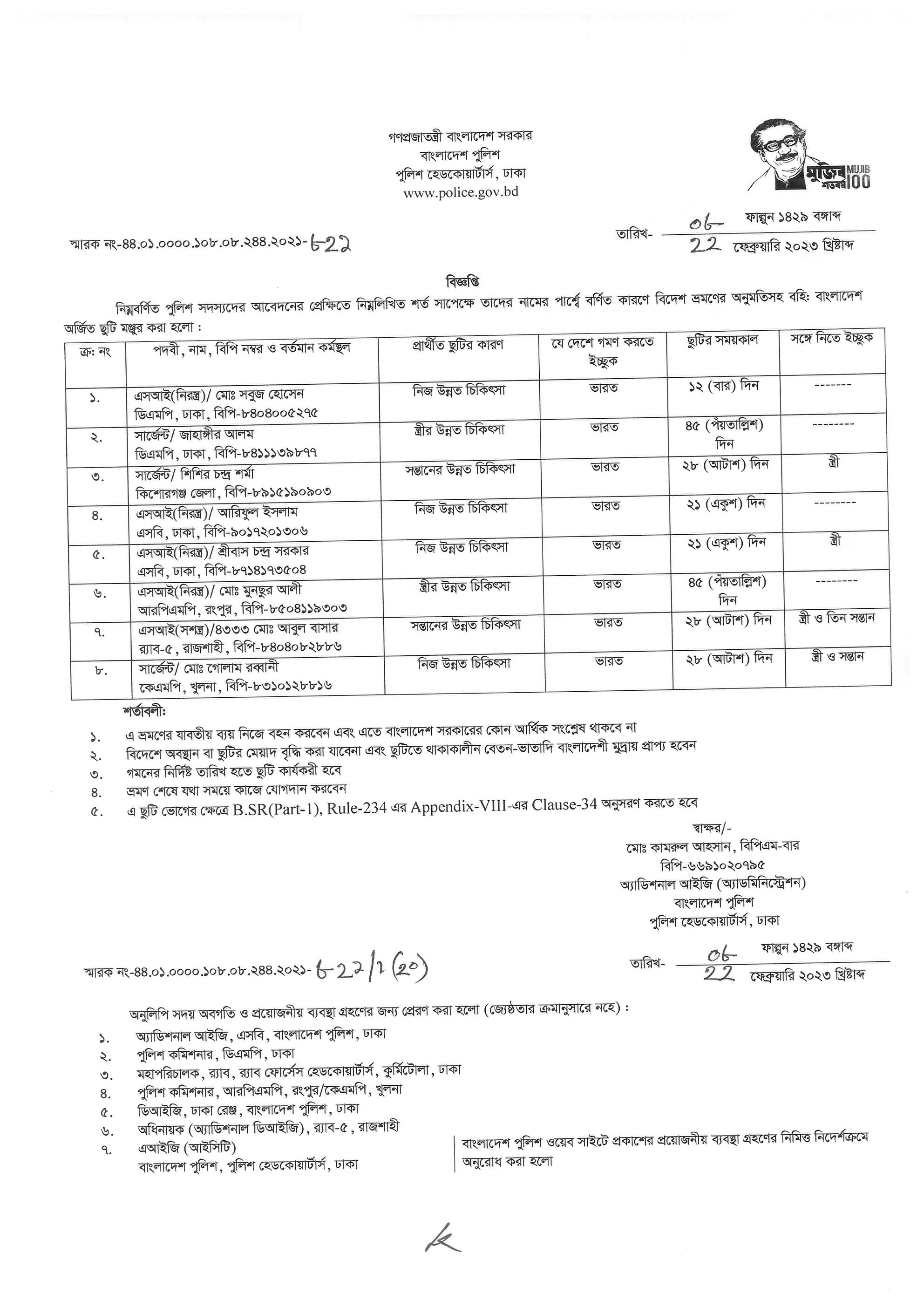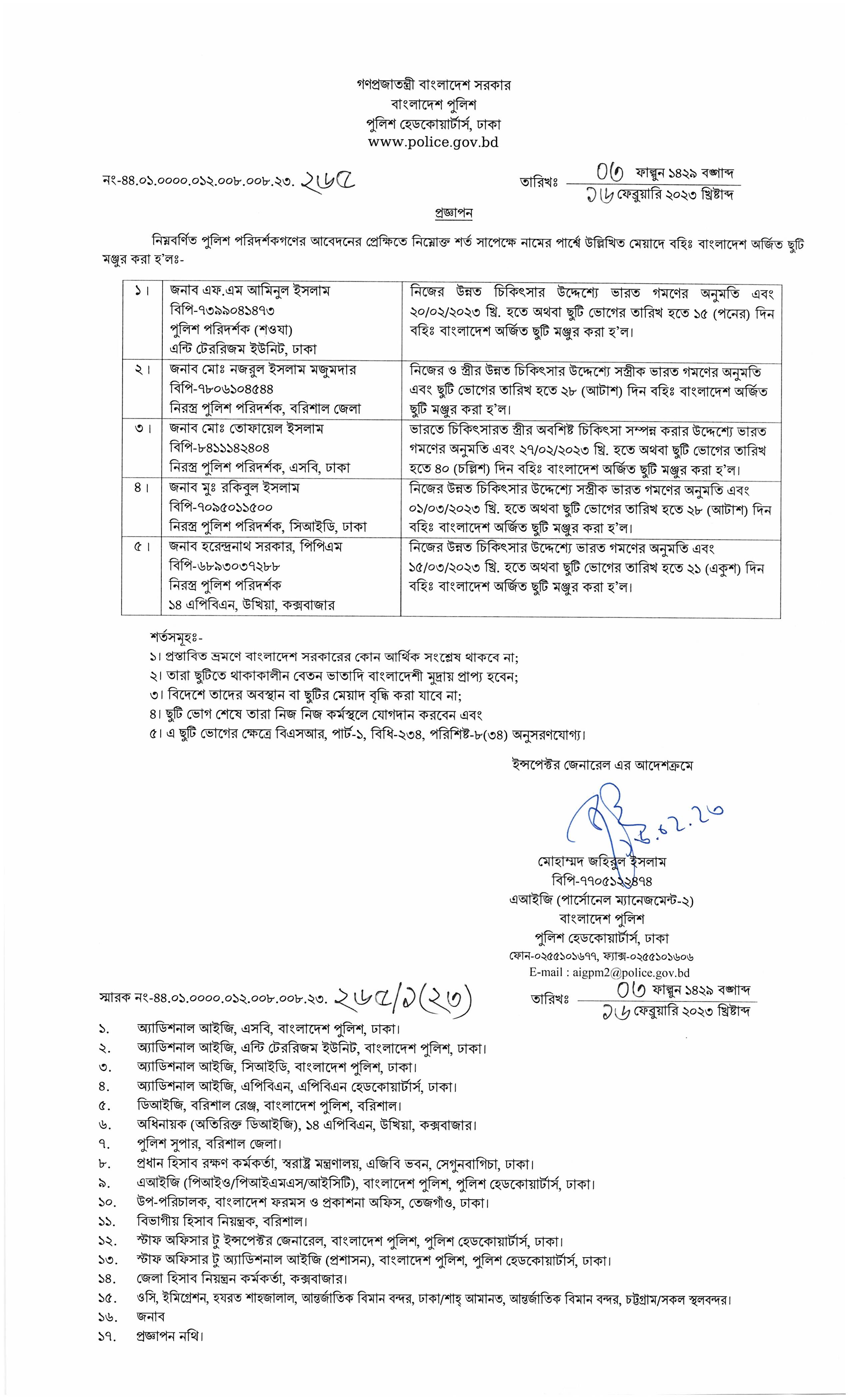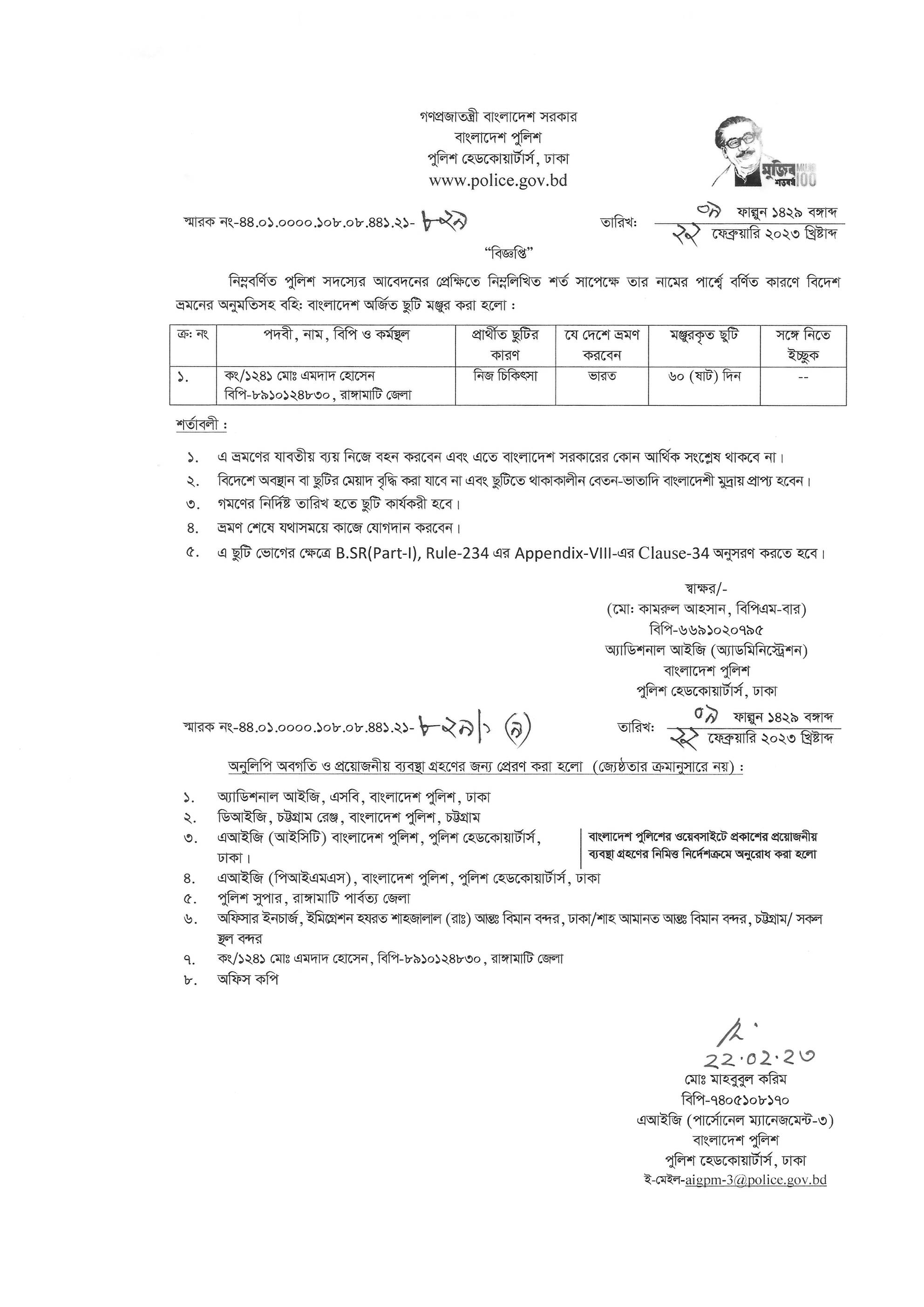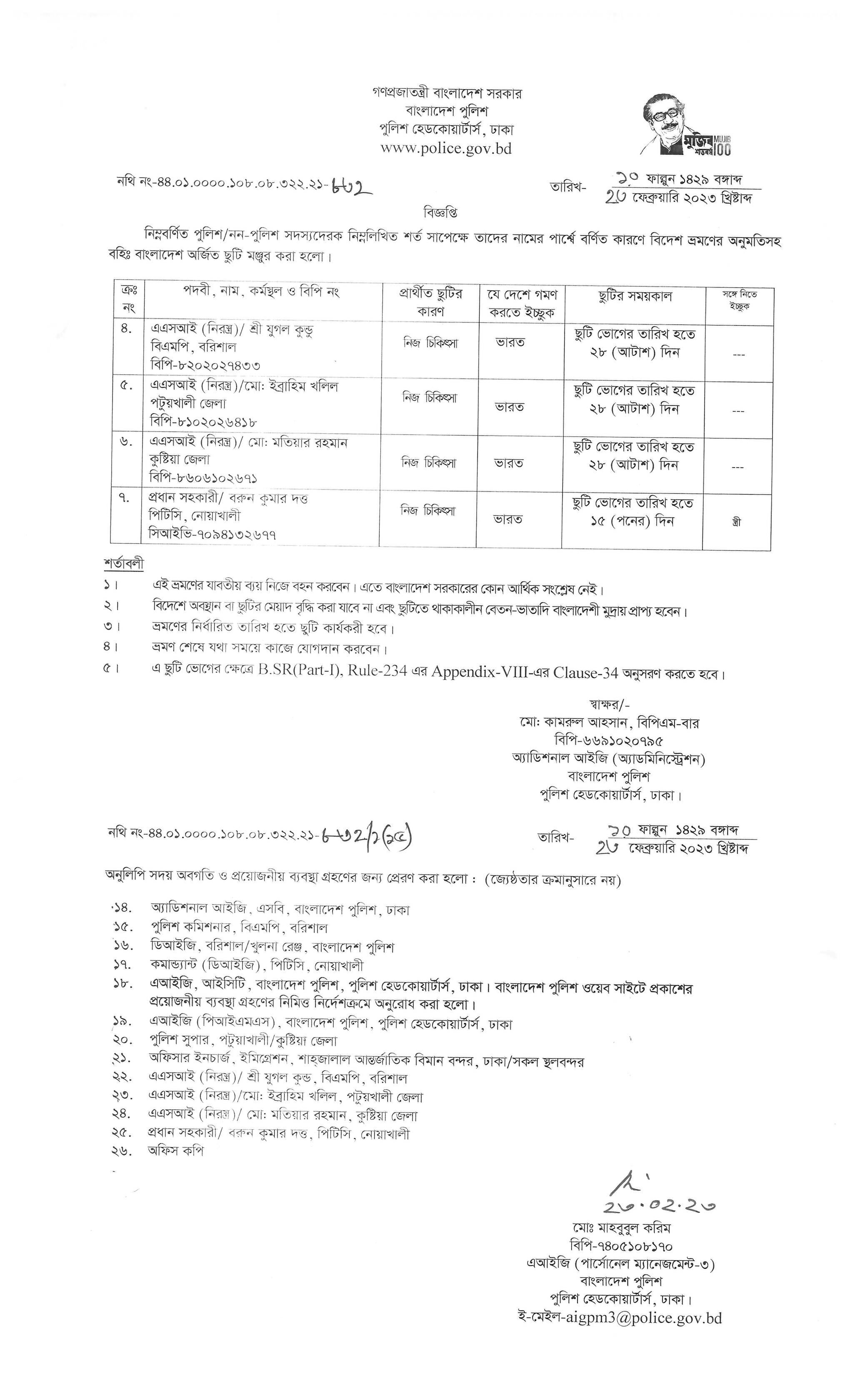 বহিঃ বাংলাদেশ ছুটি, বিজ্ঞপ্তি নং-৭৮৯, তারিখঃ ১৯/০২/২০২৩