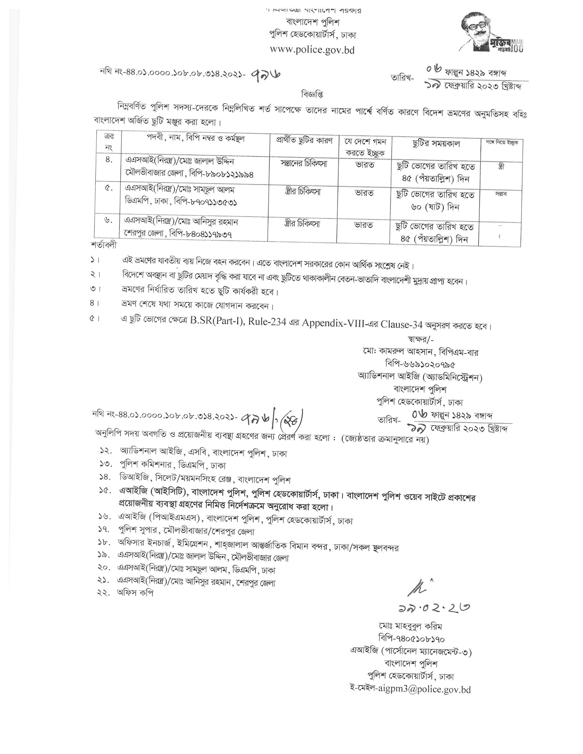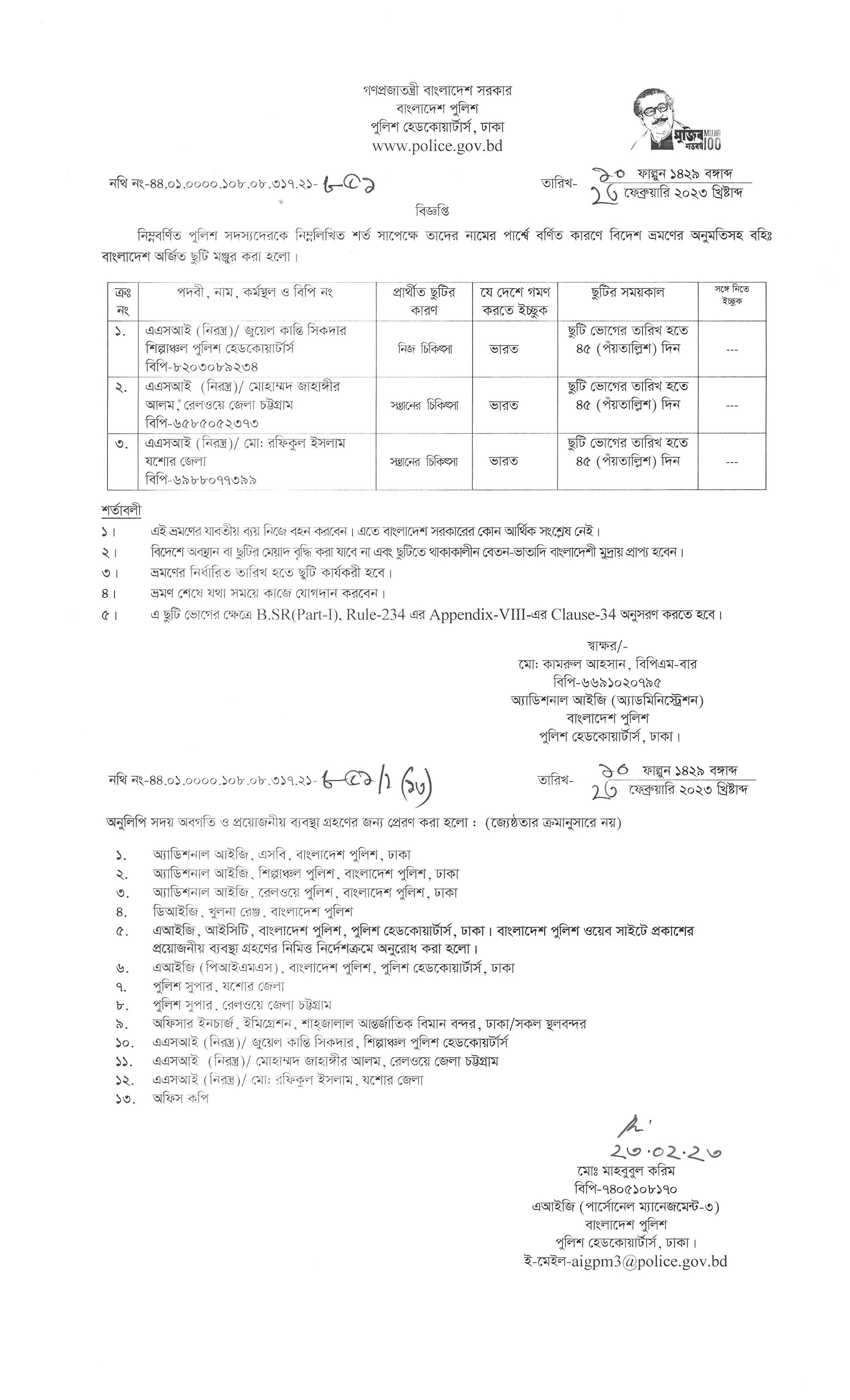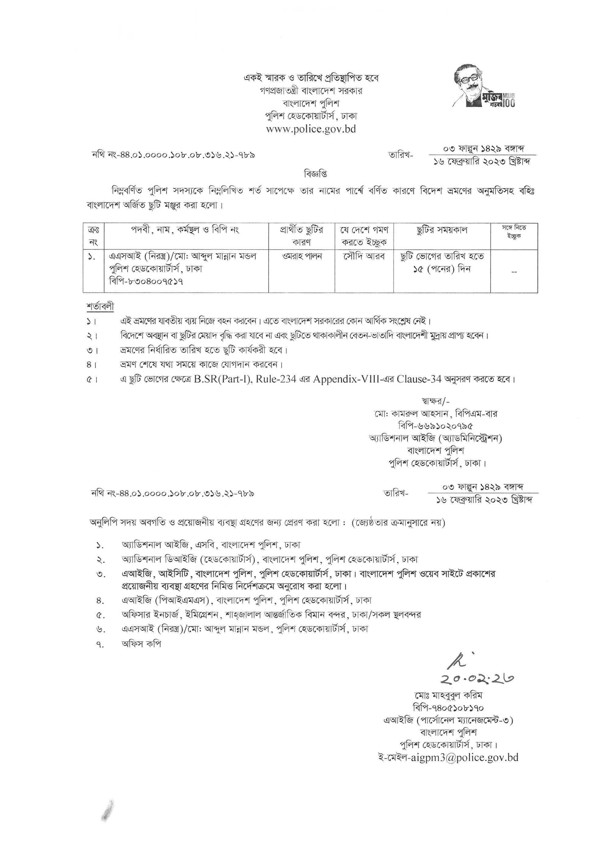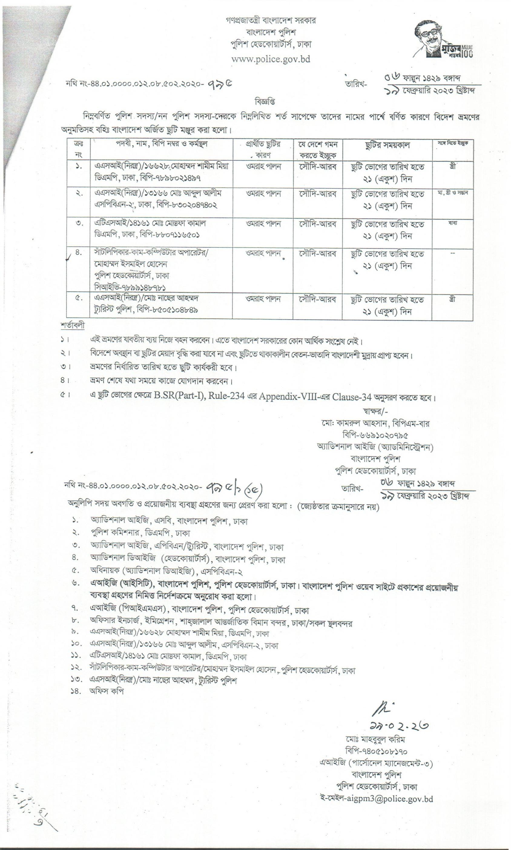 বহিঃ বাংলাদেশ ছুটি, বিজ্ঞপ্তি নং-৭৮৯, তারিখঃ ১৯/০২/২০২৩