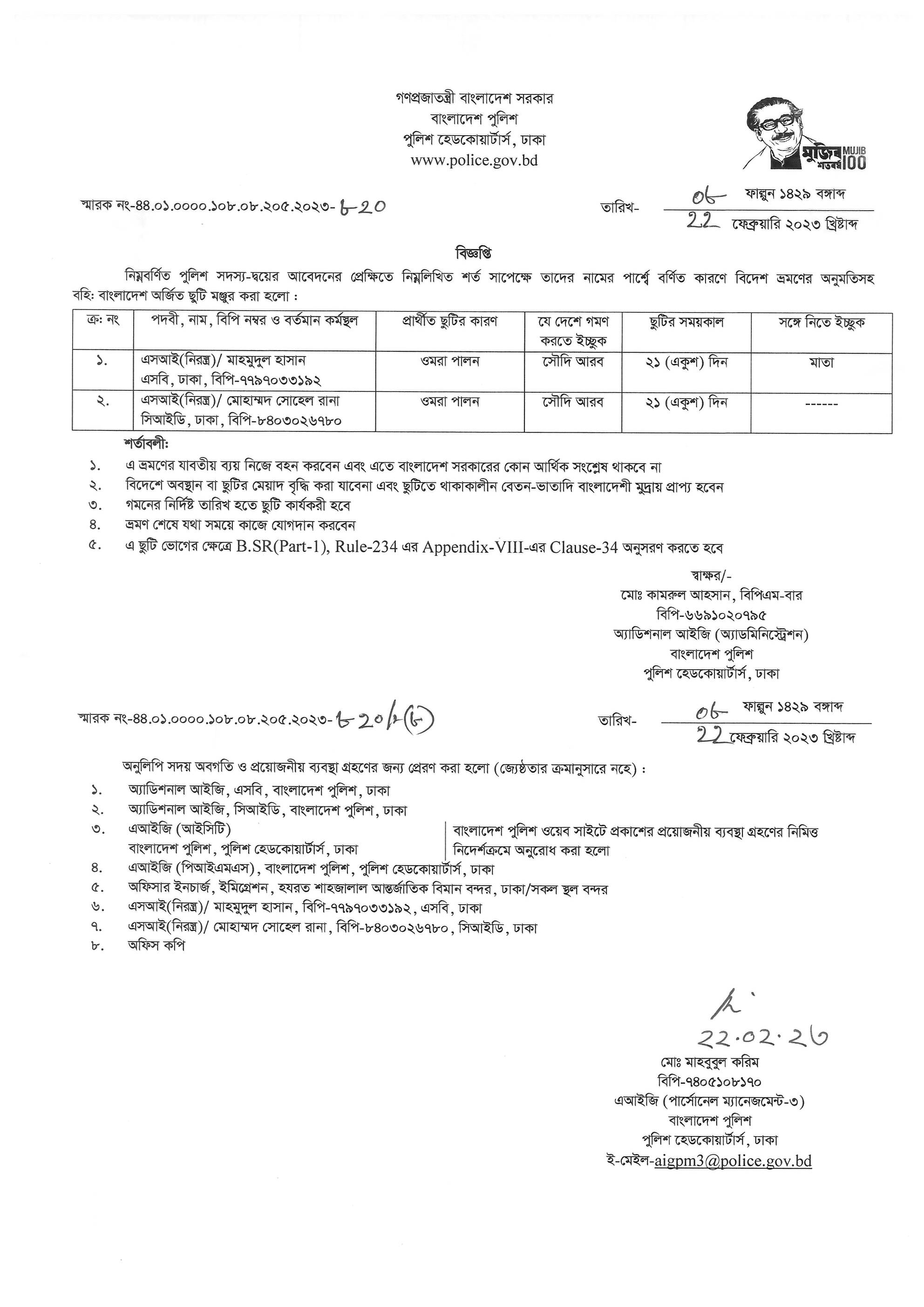 বহিঃ বাংলাদেশ ছুটি, বিজ্ঞপ্তি নং-৮২০, তারিখঃ ২২/০২/২০২৩