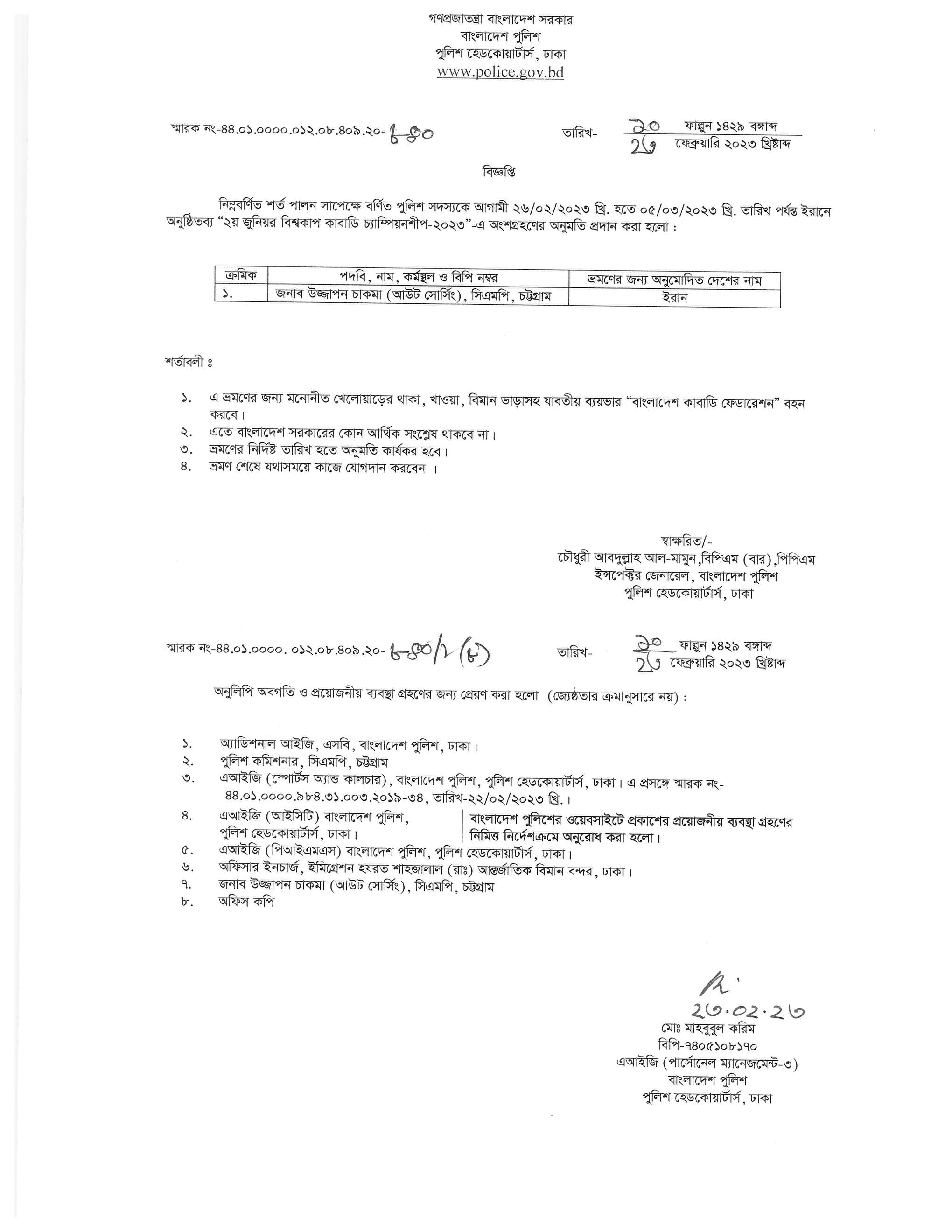 বহিঃ বাংলাদেশ ছুটি, বিজ্ঞপ্তি নং-৮৪০,(খেলোয়াড়) তারিখঃ ২৩/০২/২০২৩