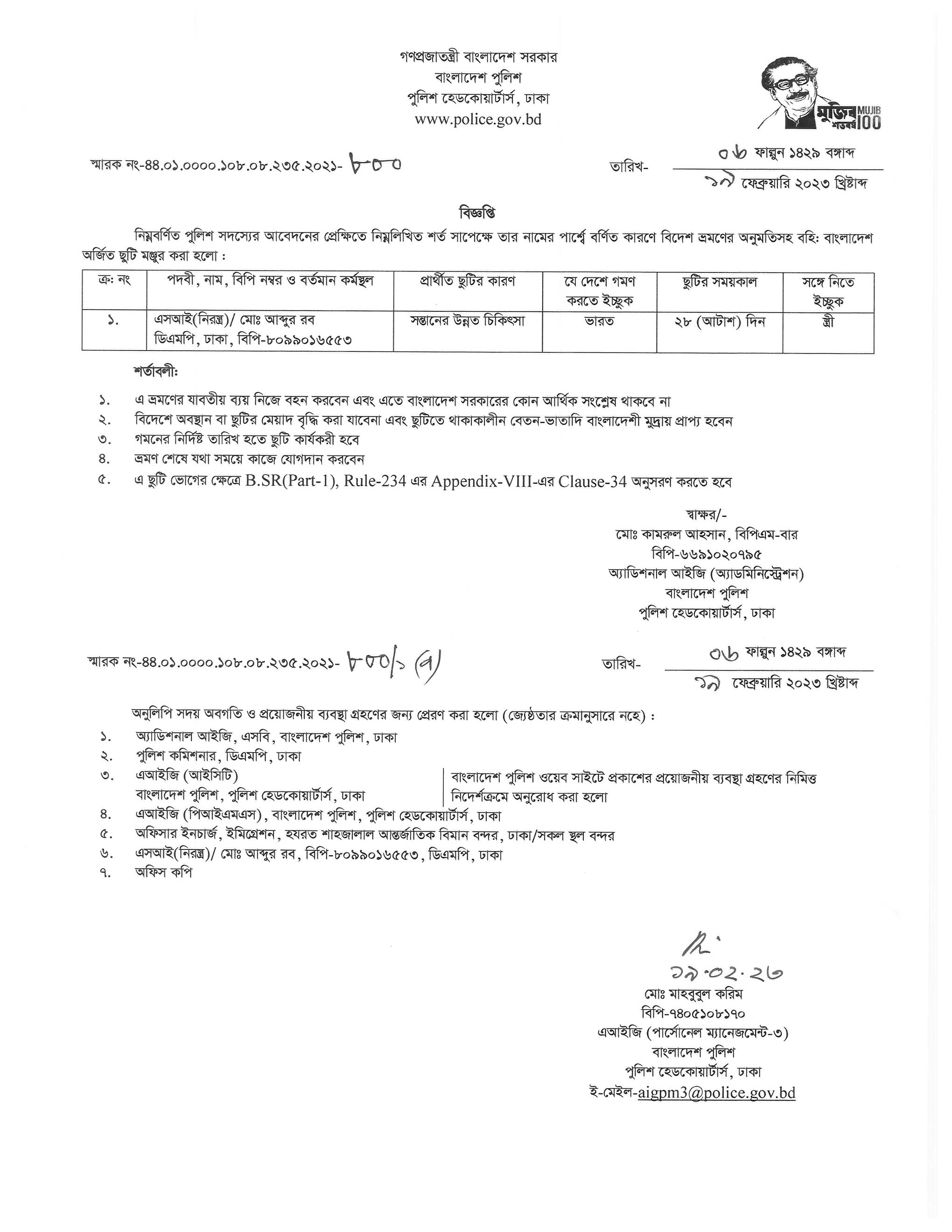 বহিঃ বাংলাদেশ ছুটি, বিজ্ঞপ্তি নং-৮৪৩, তারিখঃ ২৩/০২/২০২৩