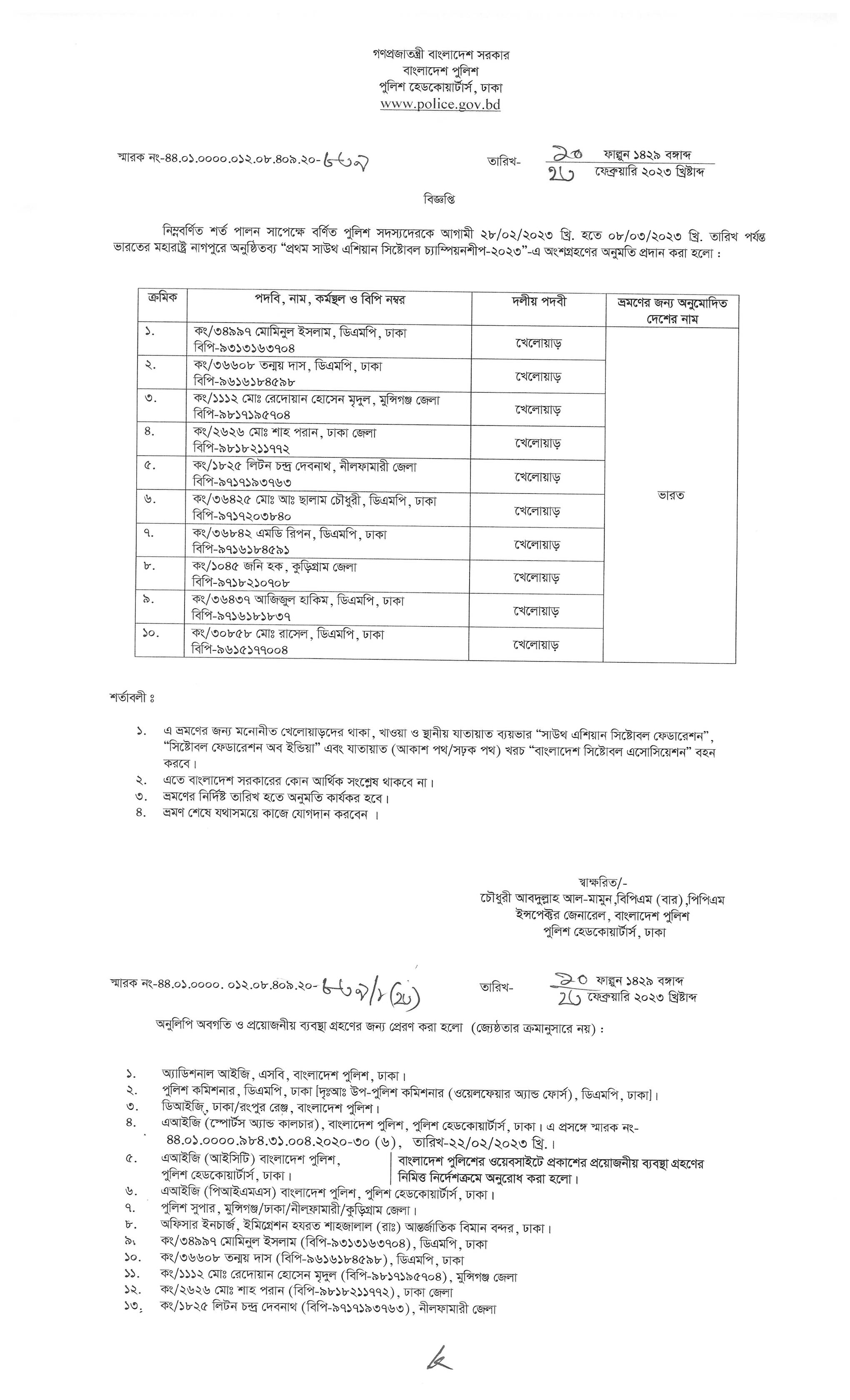 বহিঃ বাংলাদেশ ছুটি, বিজ্ঞপ্তি নং-৮৩৯,(খেলোয়াড়) তারিখঃ ২৩/০২/২০২৩