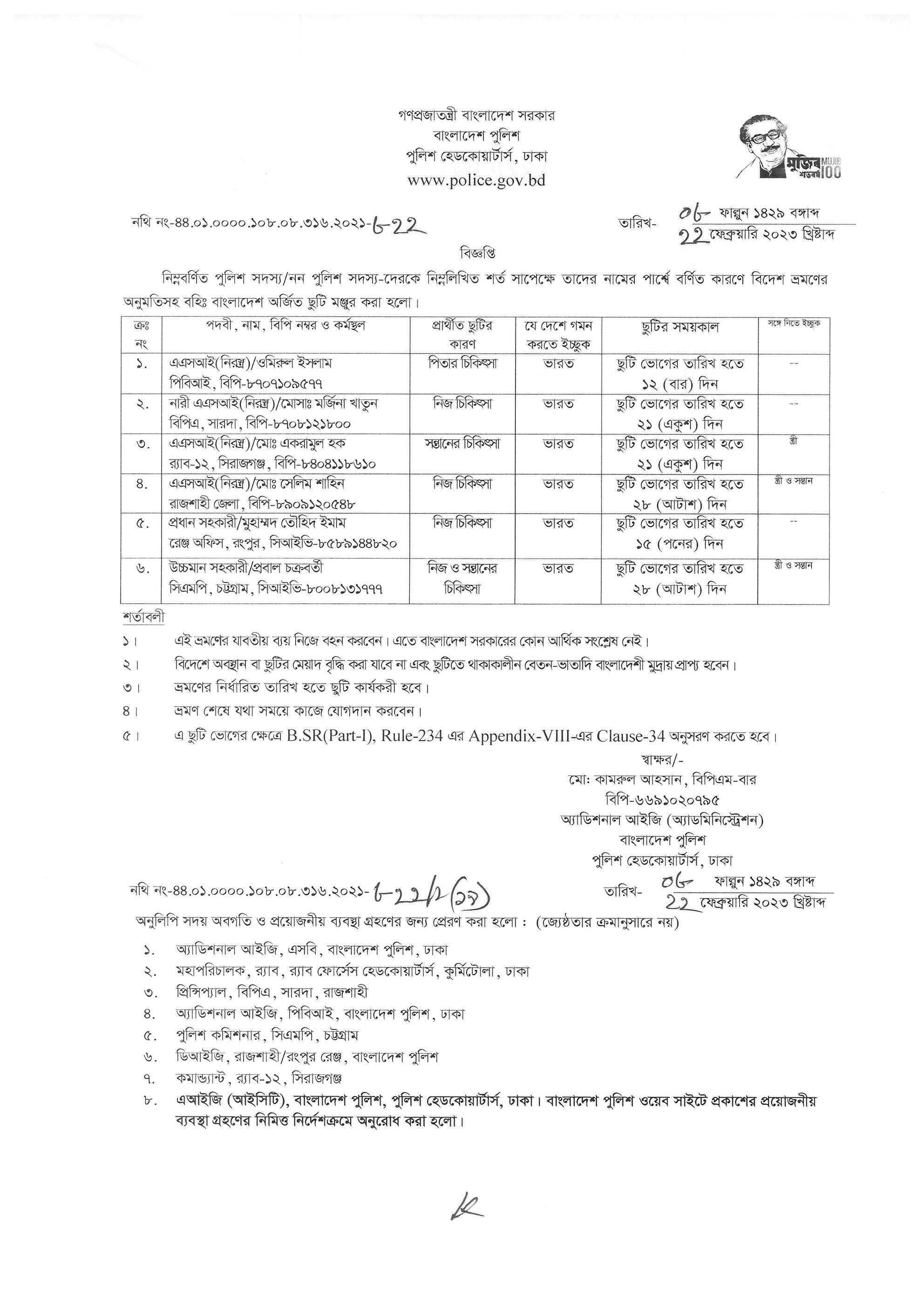 বহিঃ বাংলাদেশ ছুটি, বিজ্ঞপ্তি নং-৮২২, তারিখঃ ২২/০২/২০২৩