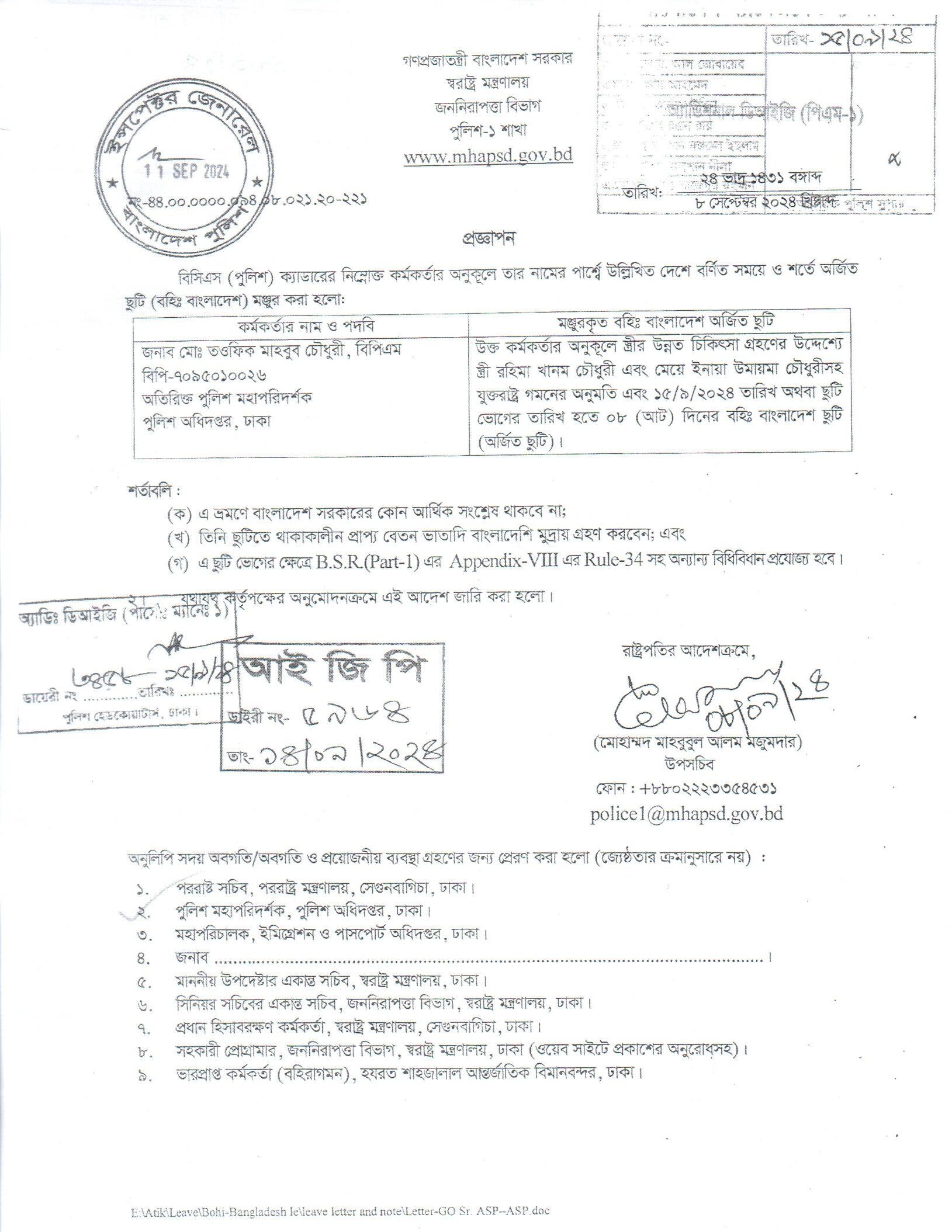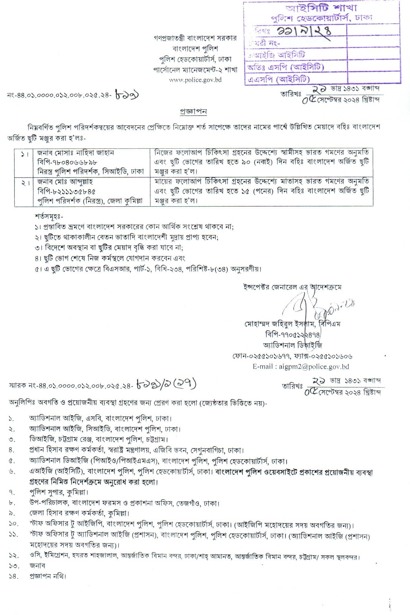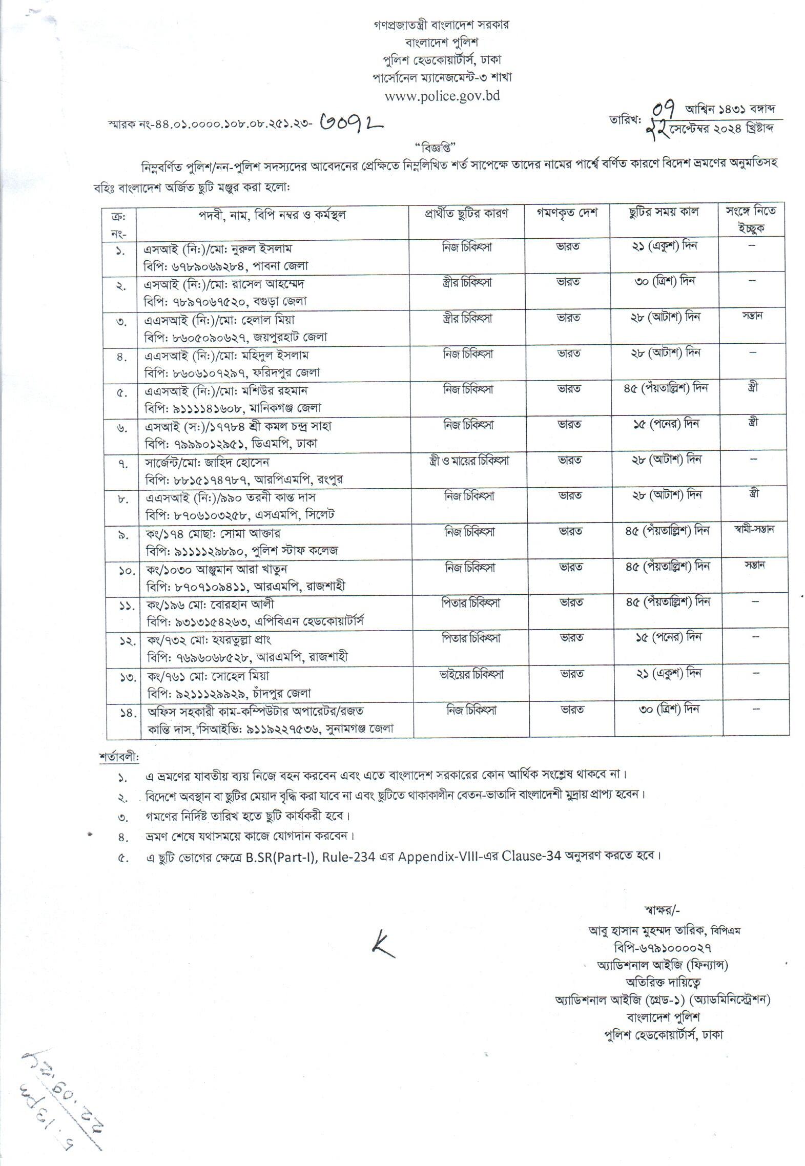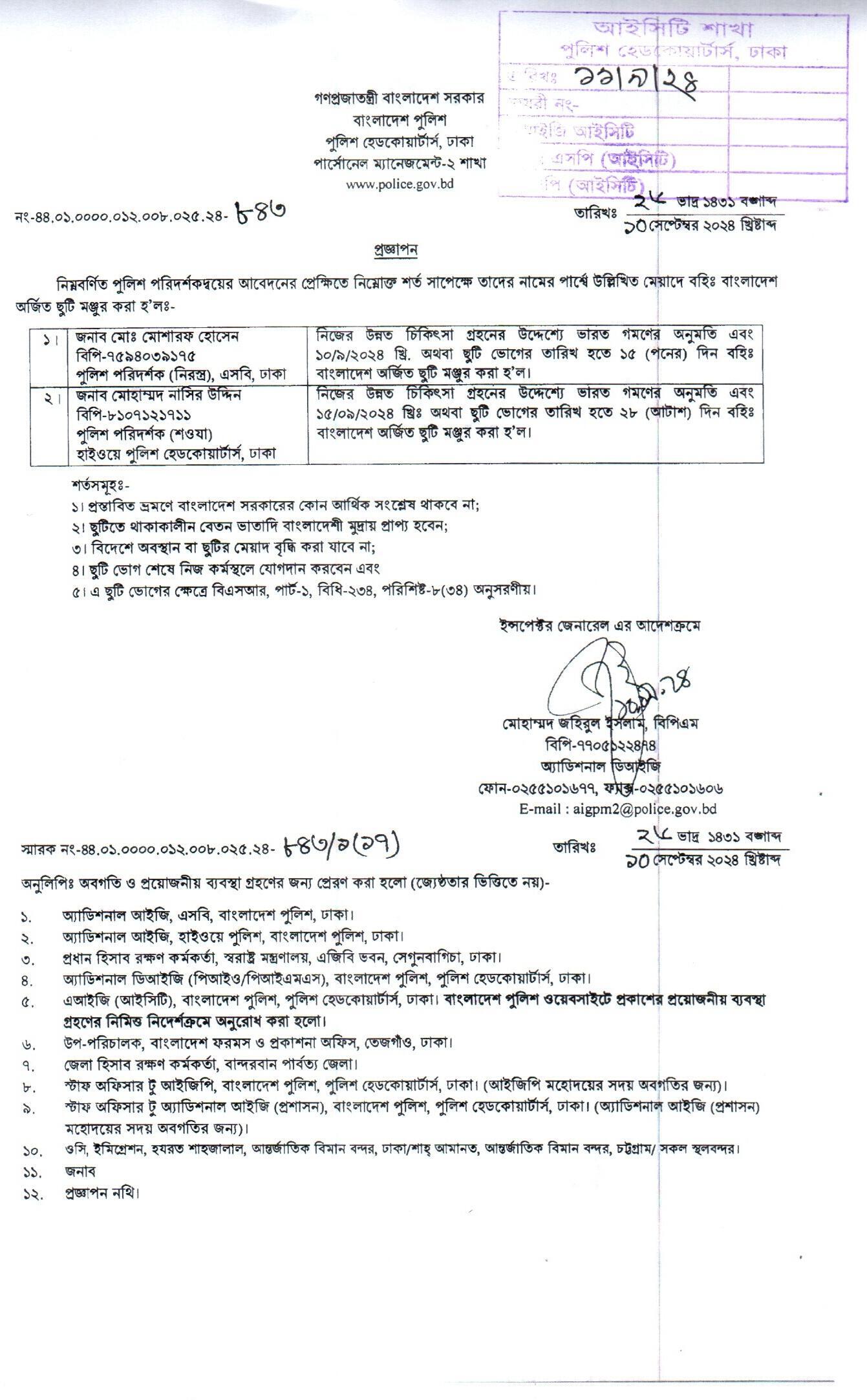 বহিঃ বাংলাদেশ ছুটি, প্রজ্ঞাপন নং- ৮৬৯, তারিখঃ ১৭/০৯/২০২৪ খ্রিঃ