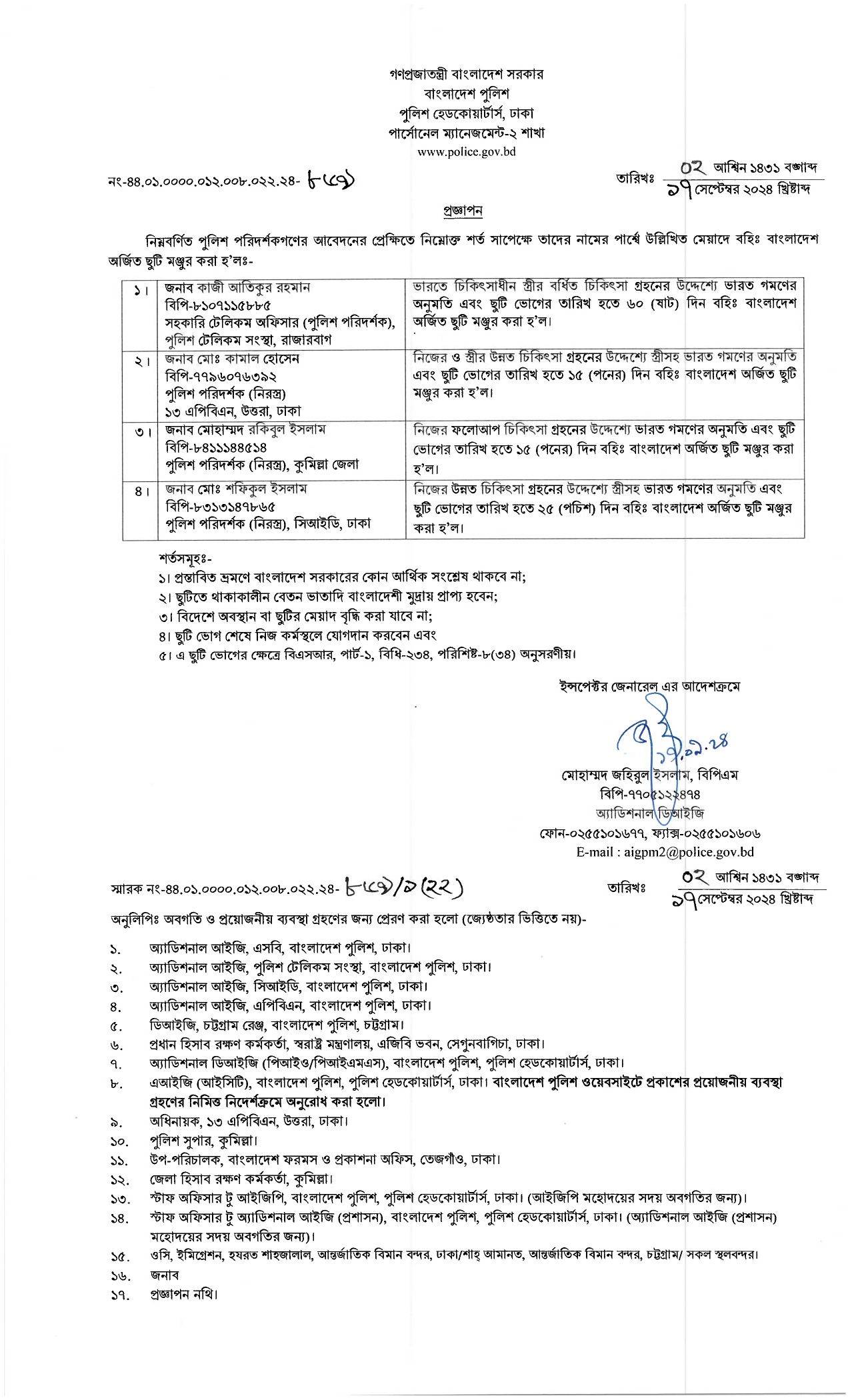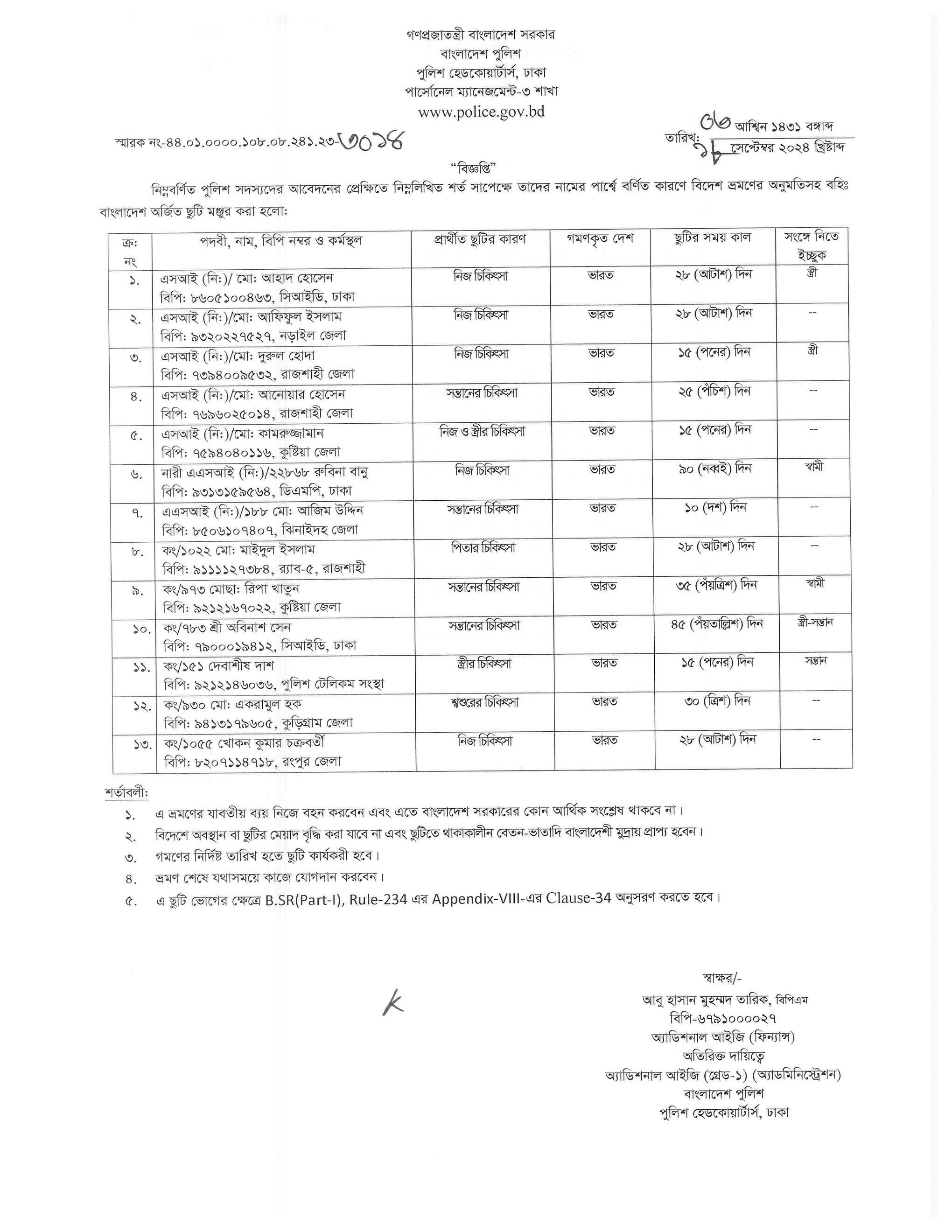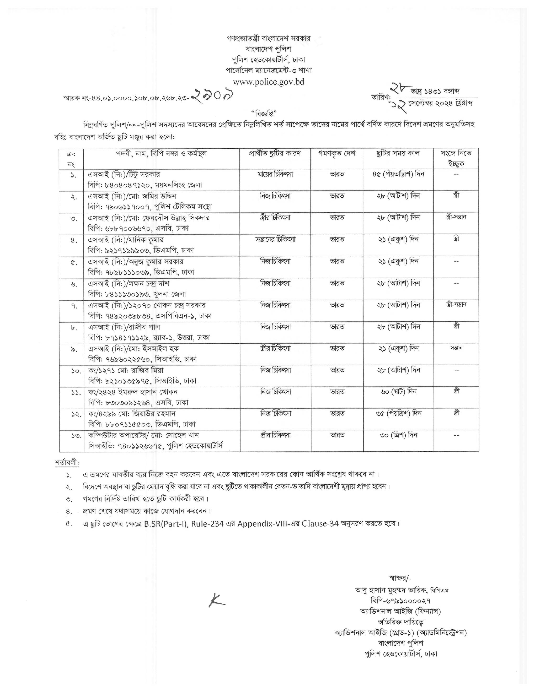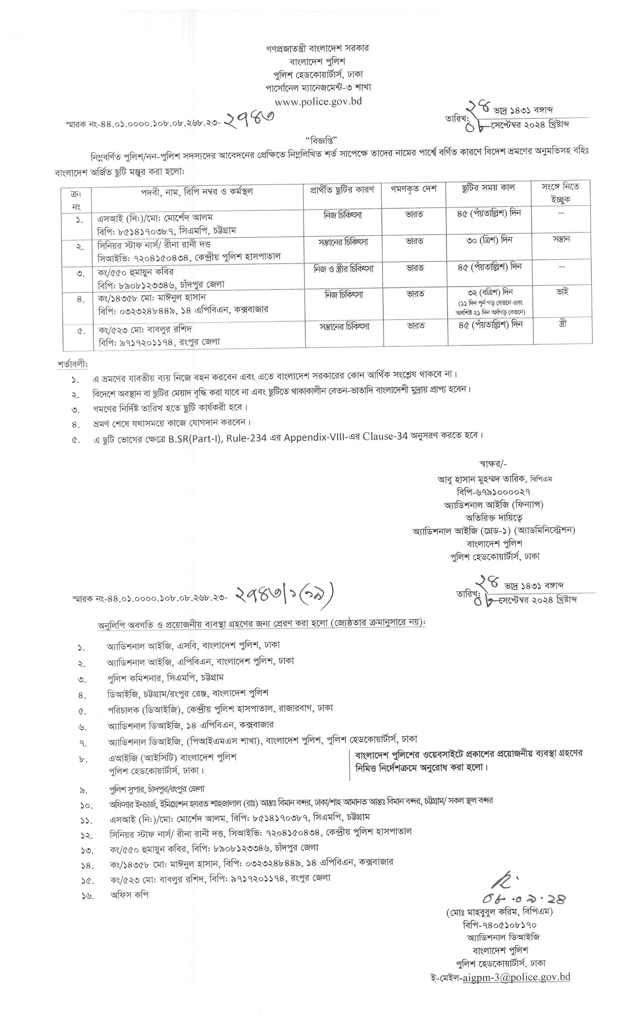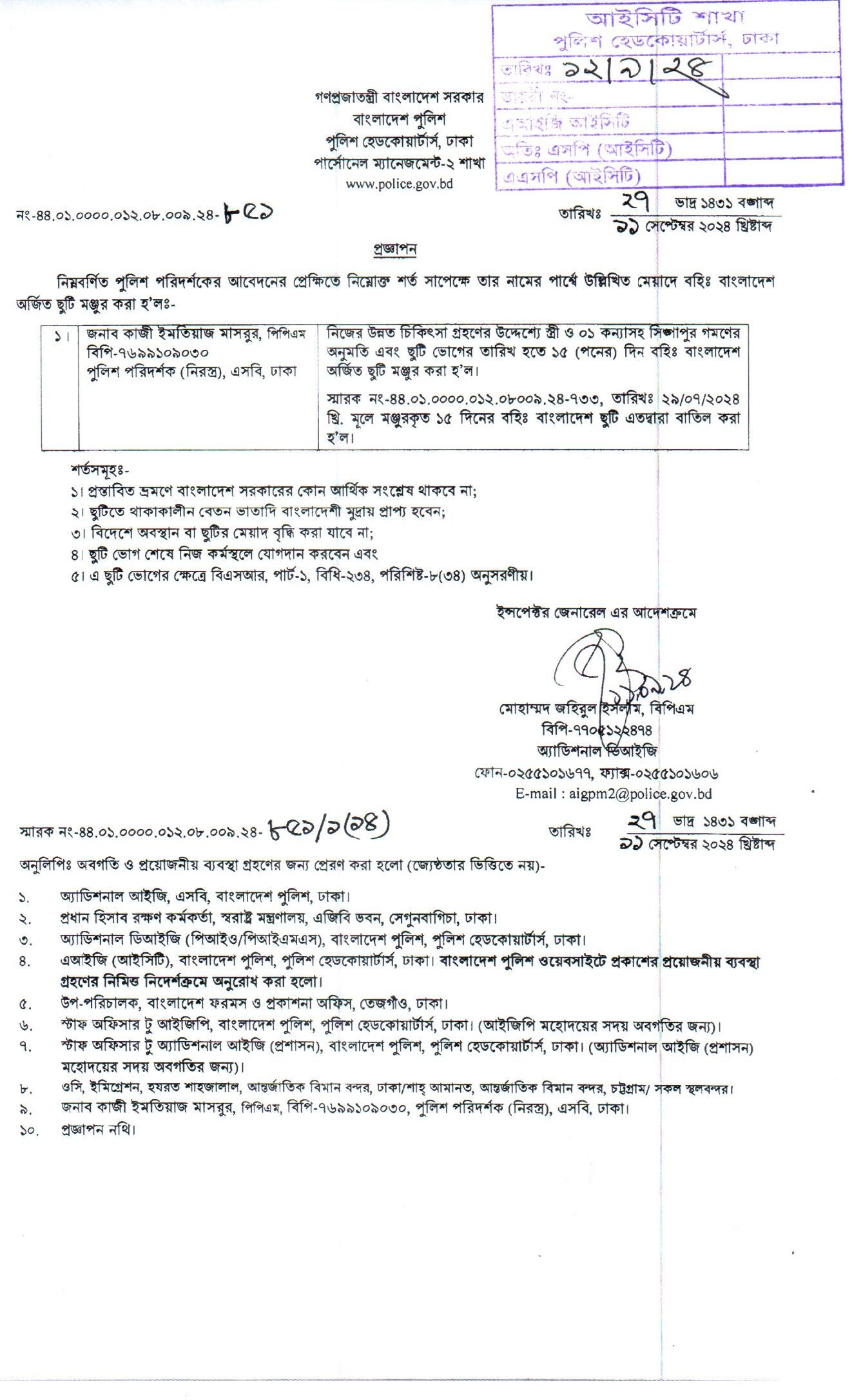বহিঃ বাংলাদেশ ছুটি, প্রজ্ঞাপন নং- ৮৬৯, তারিখঃ ১৭/০৯/২০২৪ খ্রিঃ